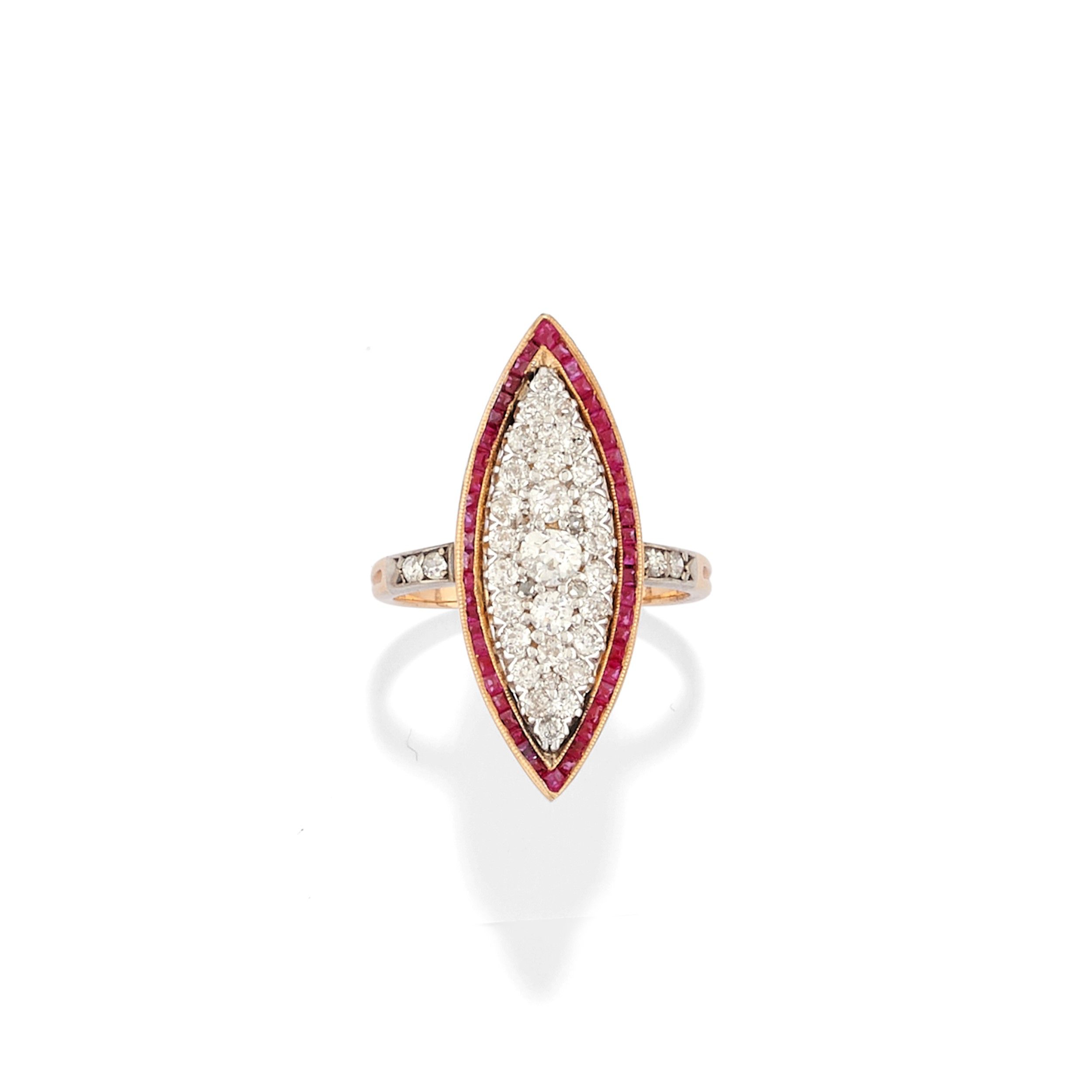 a losanga, con diamanti taglio vecchio e contorno in rubini.