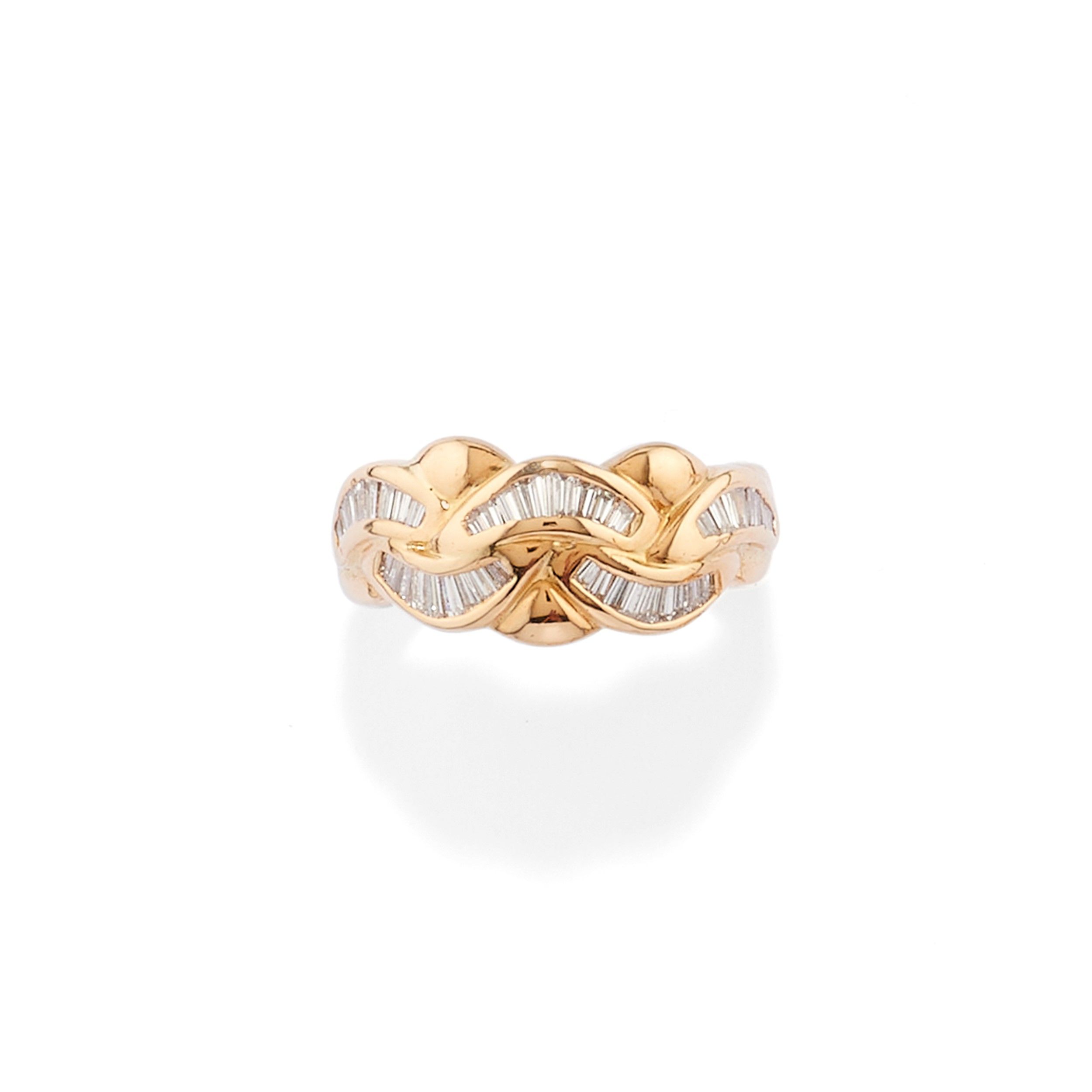motivo a intreccio, con diamanti taglio baguette e tapered baguette a decoro per totale ct 0,70 circa.