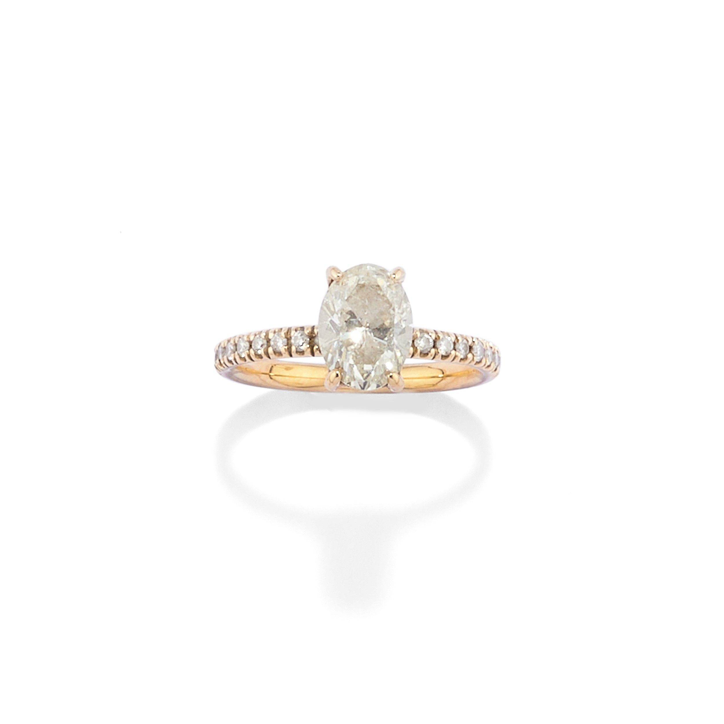 al centro diamante taglio ovale di ct 1,50 circa, prob. colore K-M, purezza SI2, sul gambo diamanti taglio brillante per totale ct 0,38 circa, con astuccio.