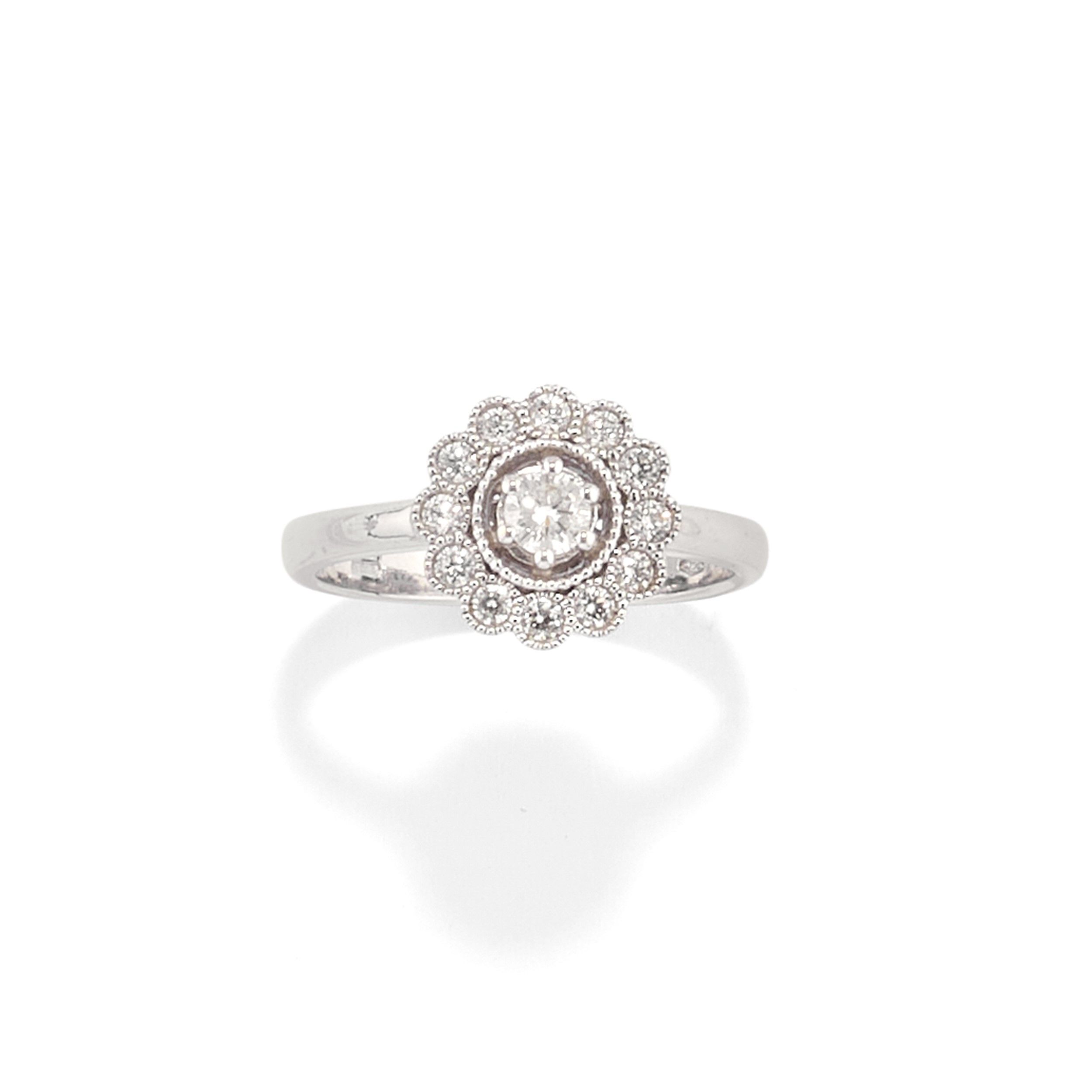 motivo a fiore, al centro diamante taglio brillante di ct 0,20 circa entro contorno in diamanti taglio brillante.