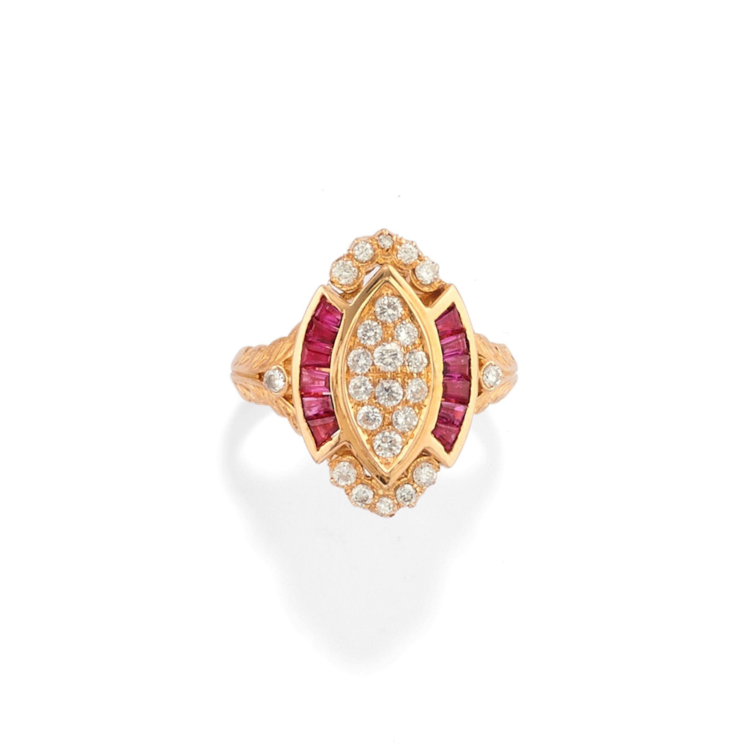 a losanga, decorato con diamanti taglio brillante e rubini tapered baguette.