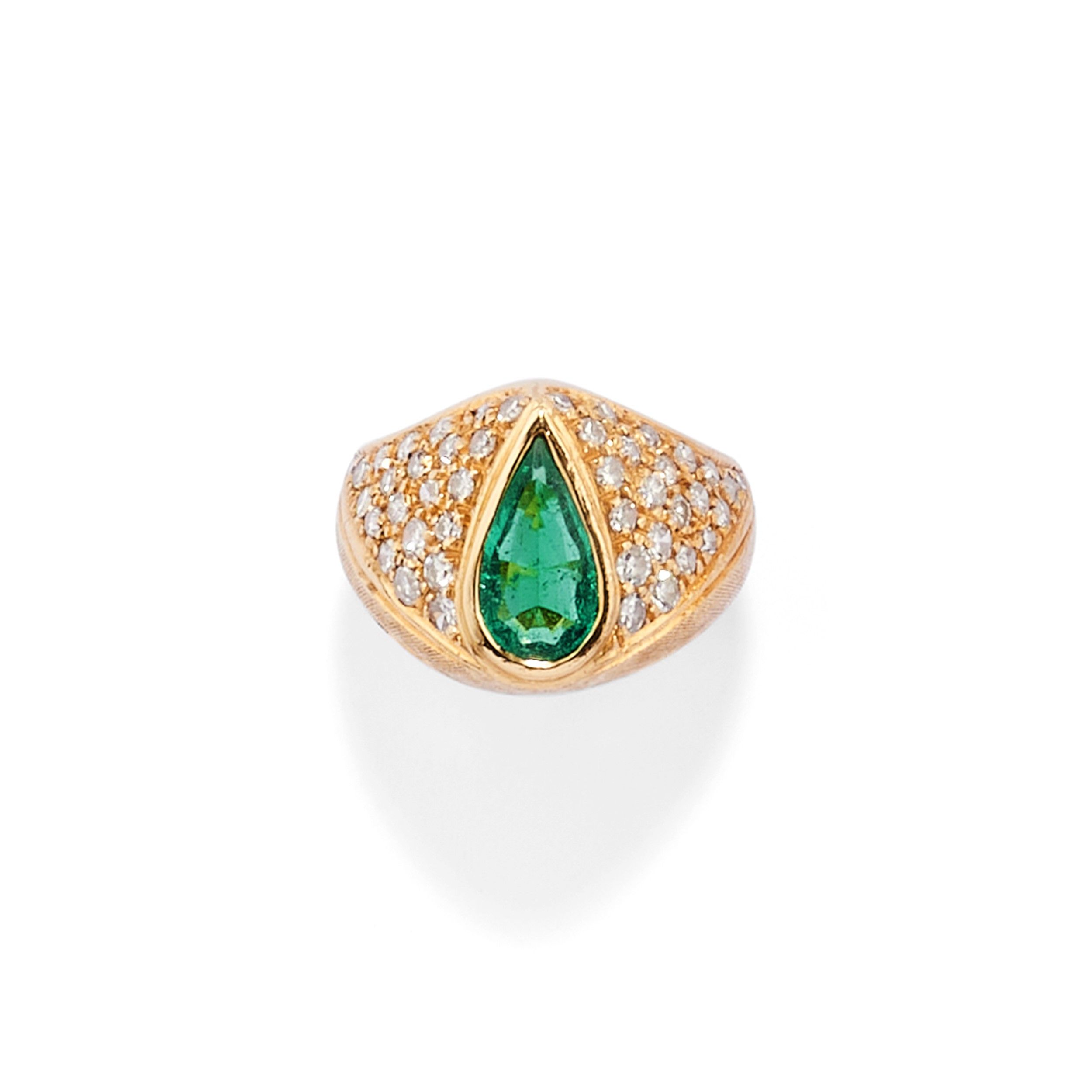 al centro smeraldo taglio goccia di ct 0,80 circa, diamanti taglio huit-huit a decoro.