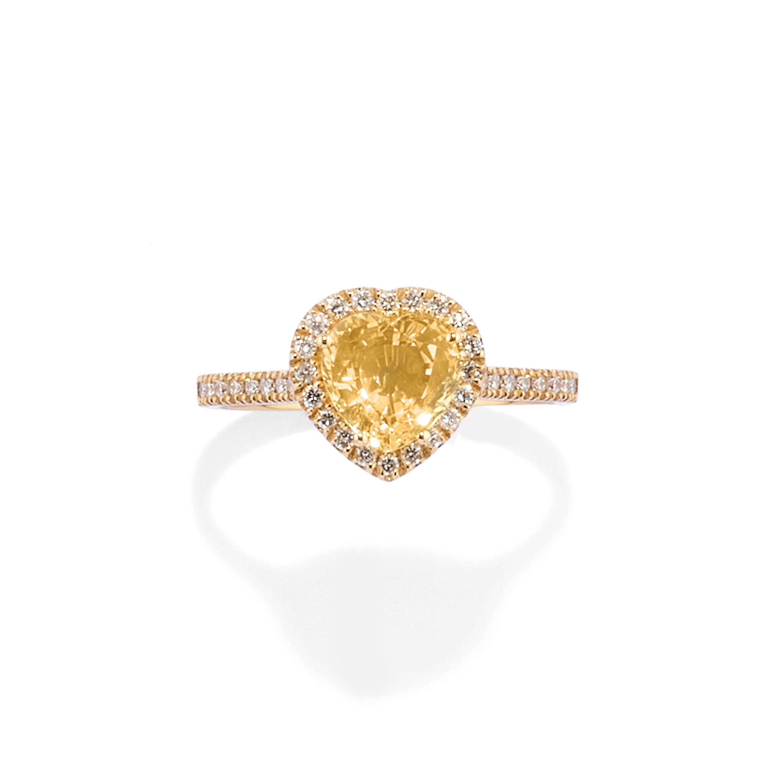 al centro zaffiro giallo taglio cuore di ct 2,50 circa, decorato da diamanti taglio brillante per totale ct 0,50 circa.