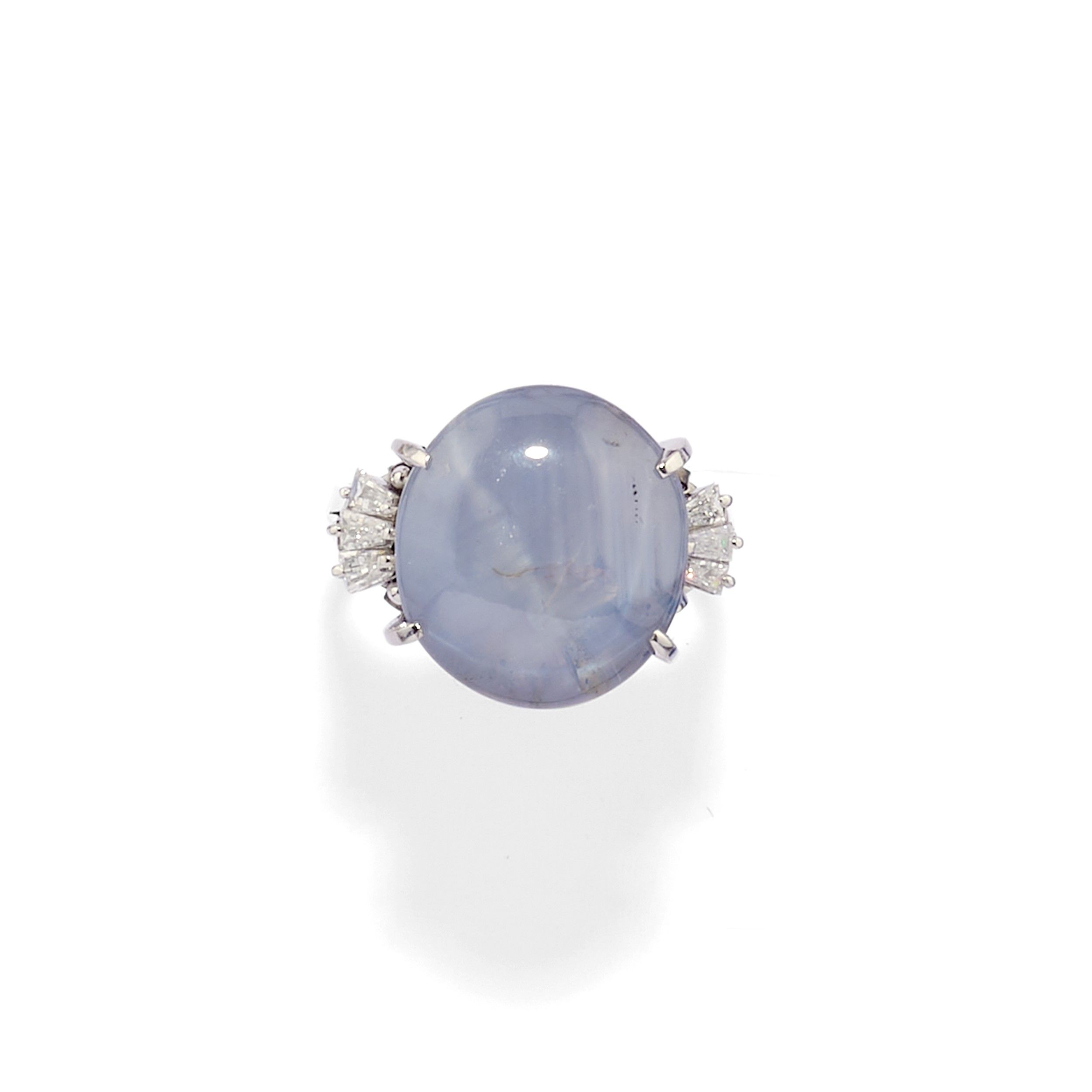 al centro zaffiro stellato taglio ovale cabochon di ct 22,70 (caratura incisa), ai lati diamanti tapered baguette per totale ct 3,60.