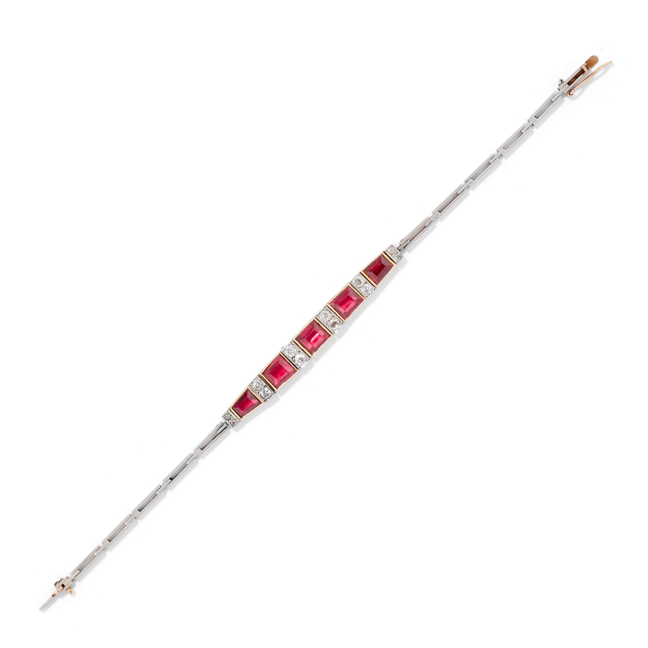 in stile Decò, decorato da rubini sintetici taglio trapezio alternati da diamanti taglio brillante.