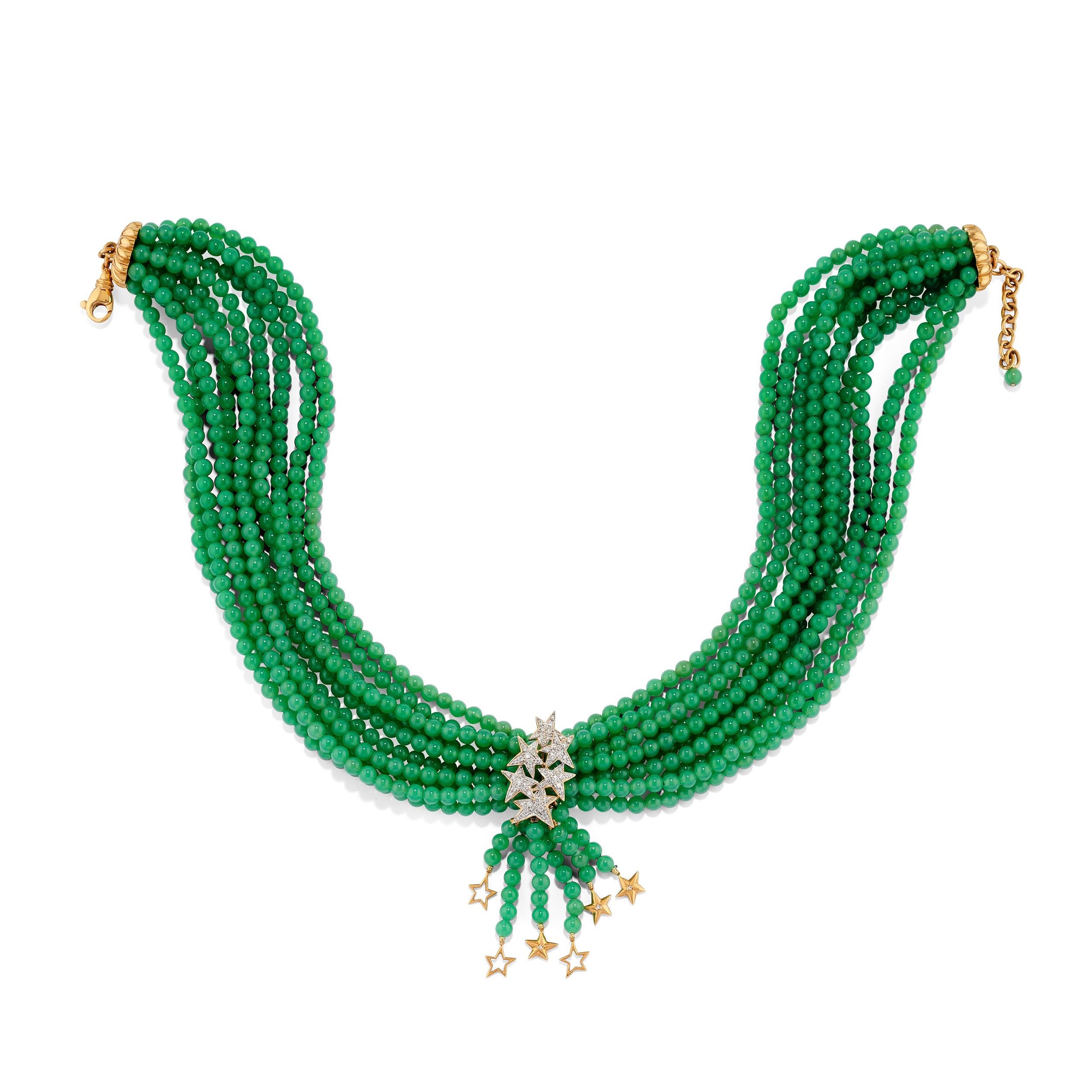 a dieci fili di boules in crisoprasio di mm 4,00 circa e motivo centrale a stelline con diamanti taglio brillante.