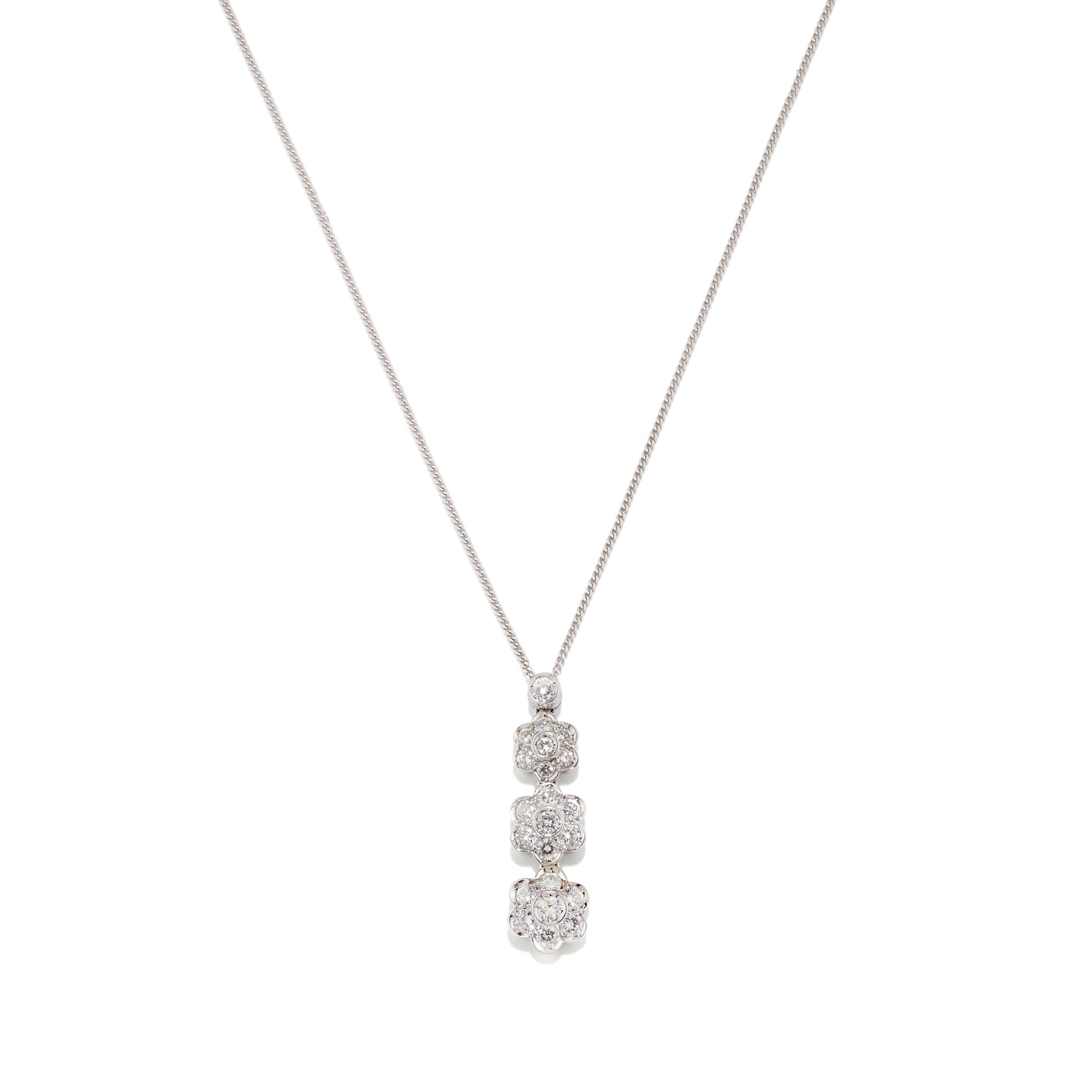 a tre fiori, con diamanti taglio brillante per totale ct 1,00 circa trattenuto da catenina.