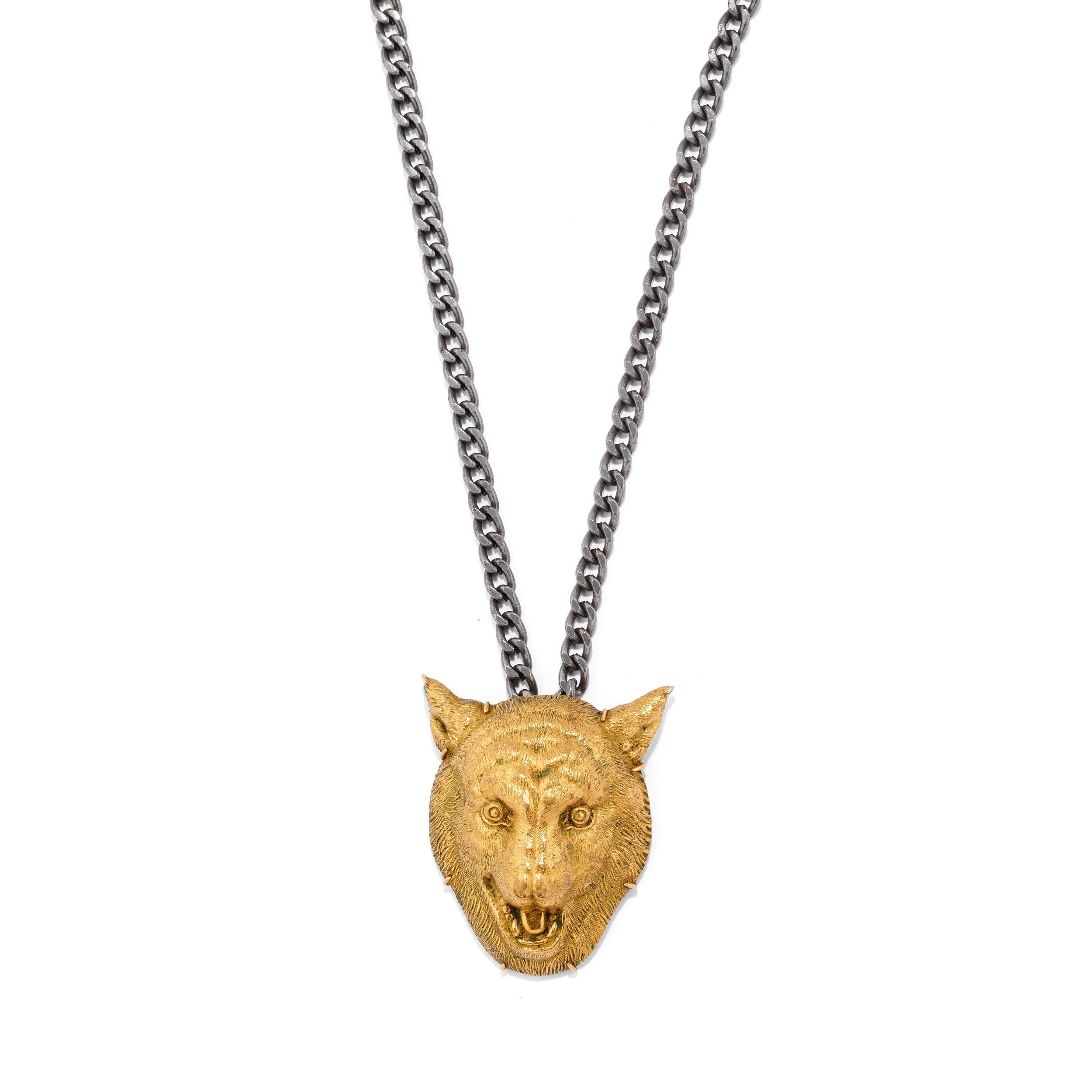 catena a maglia groumette in acciaio con moschettone in oro giallo 18k e pendente raffigurante lupo in metallo dorato con al retro lastra in oro giallo 18k.