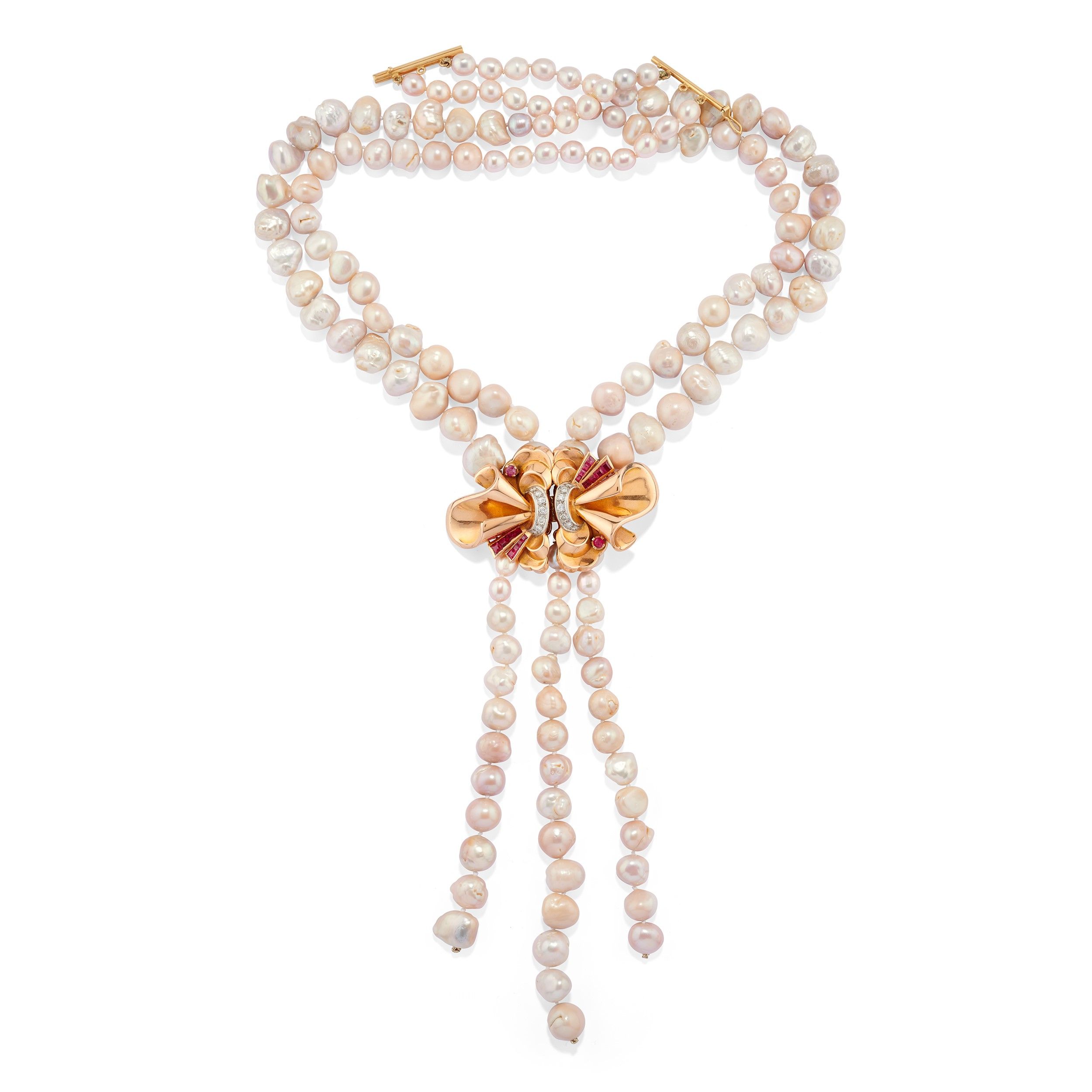 a due fili di perle barocche con centrale a fiocco con diamanti e rubini sintetici.  Il motivo centrale è adattabile come spilla e doppia clip.