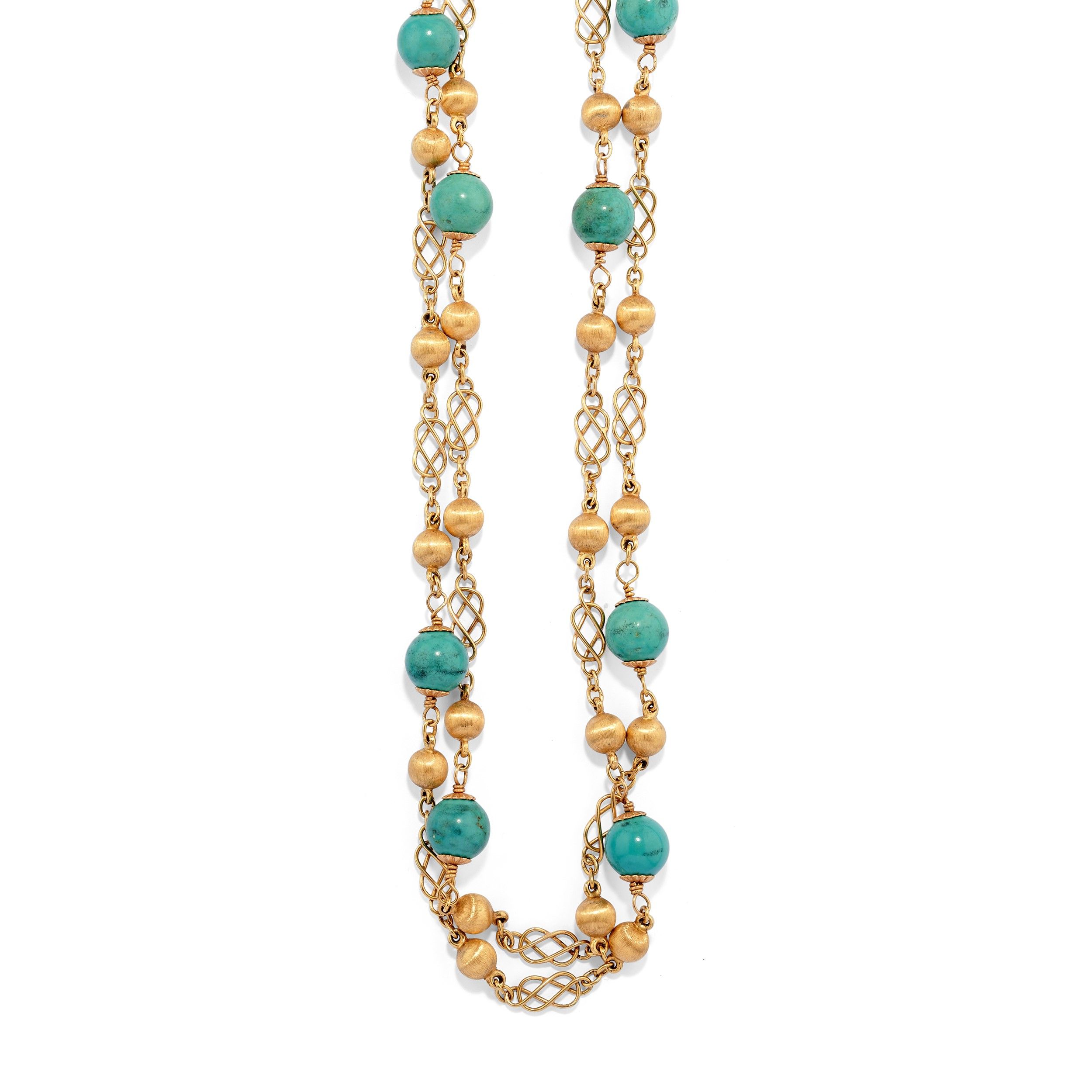 catena sautoir con sfere in oro satinato alternate a boules in turchese di mm 10,00 circa.