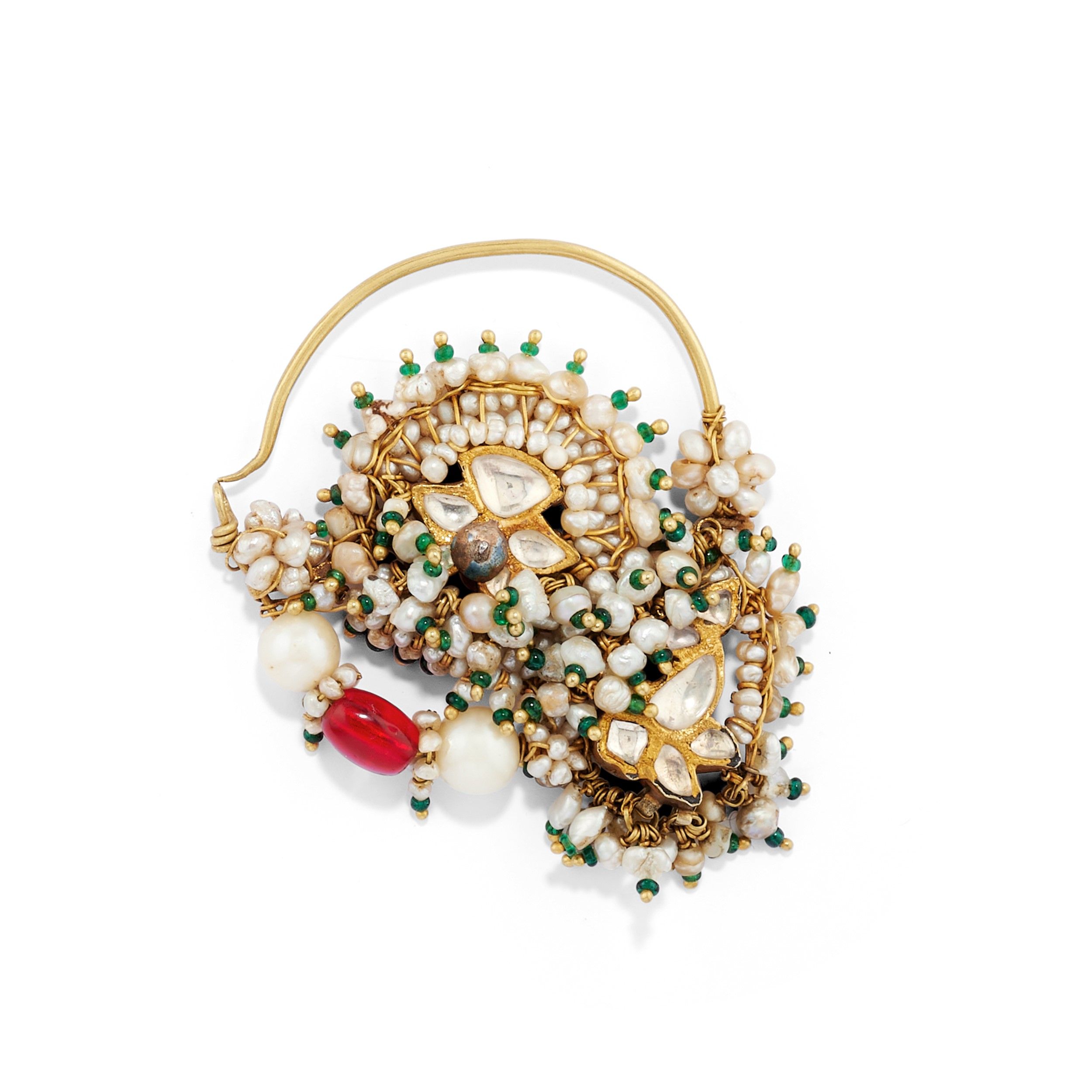 in oro giallo 18k e 20k, Peso g 102,30 cm 42,00-7,50x6,00 collana di gusto indiano con centrale articolato formato da fiori con paste vitree, pietre varie montate a notte e diamanti flat, rifinita con frangia di boules pendenti e cordino regolabile, e orecchino da naso con perline e pietre colorate.