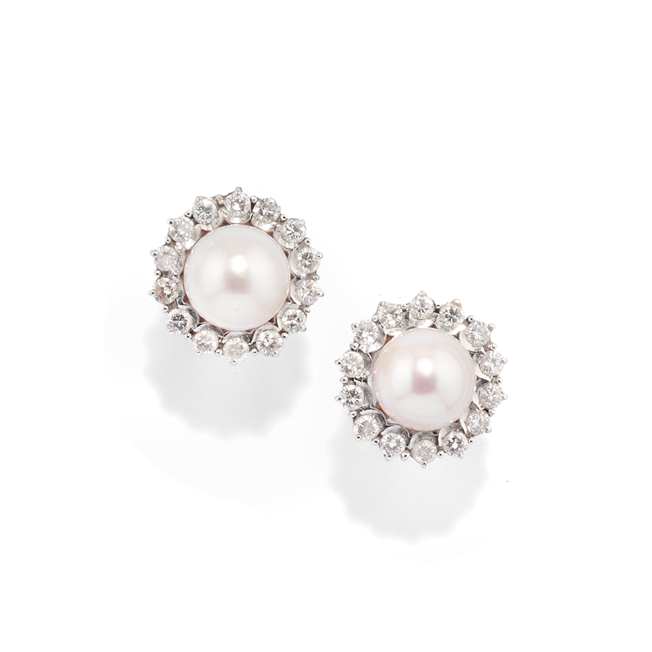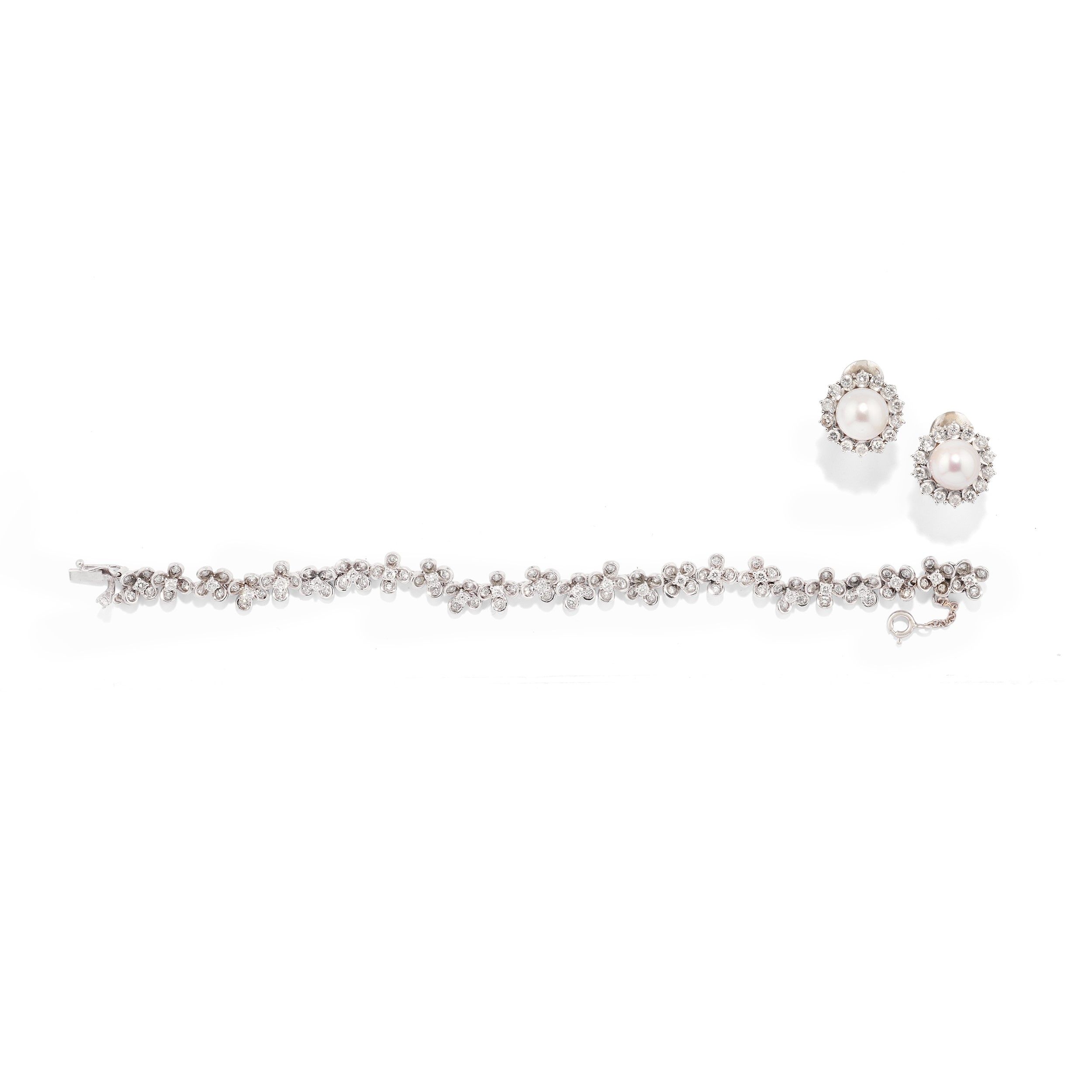 in oro bianco 18k, Peso g 27,40 cm 16,00-diametro cm 1,60 coppia orecchini con perle coltivate di mm 9,00 circa e contorno in diamanti taglio brillante per totale ct 0,50 circa, chiusura con perno e clip, e bracciale con motivo a fiori decorati da diamanti taglio brillante.