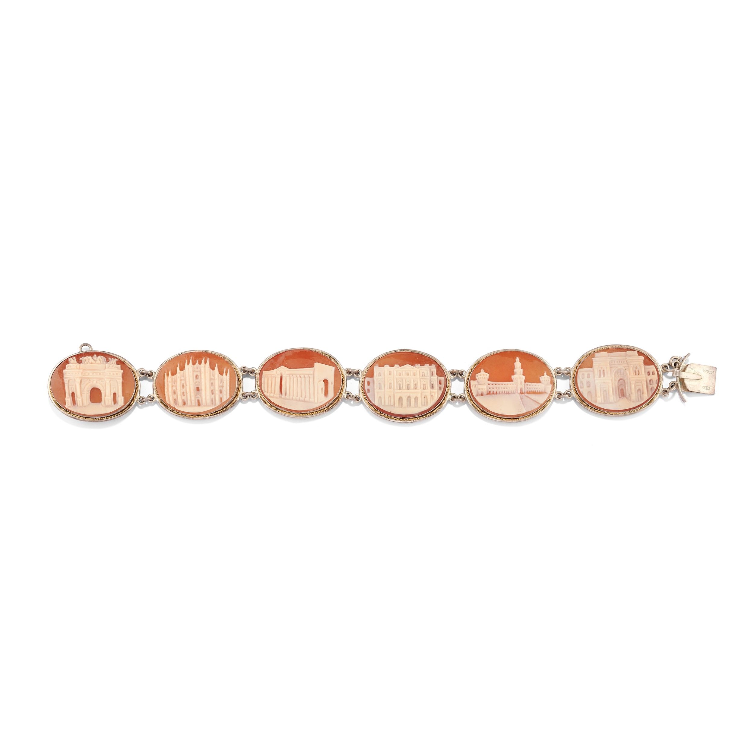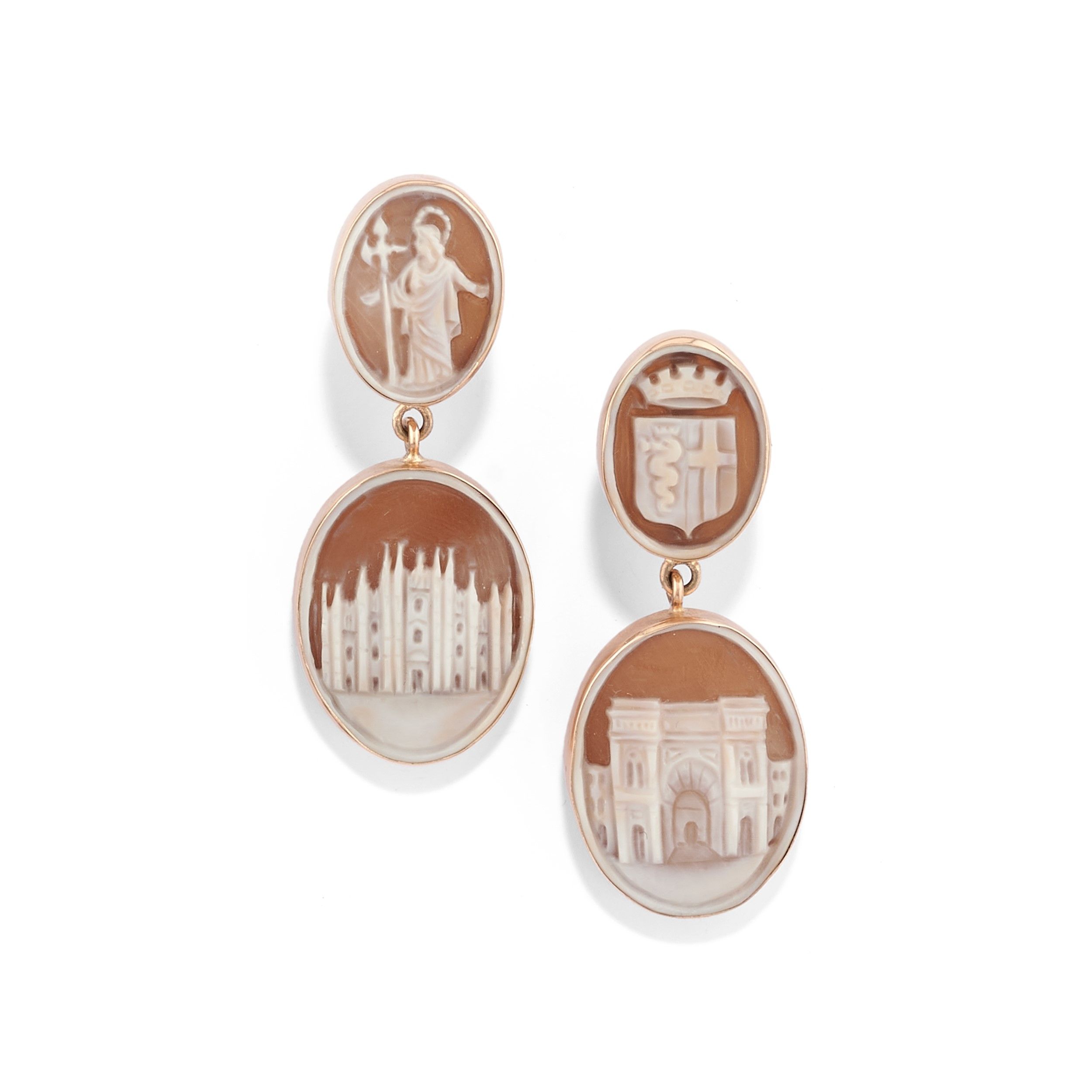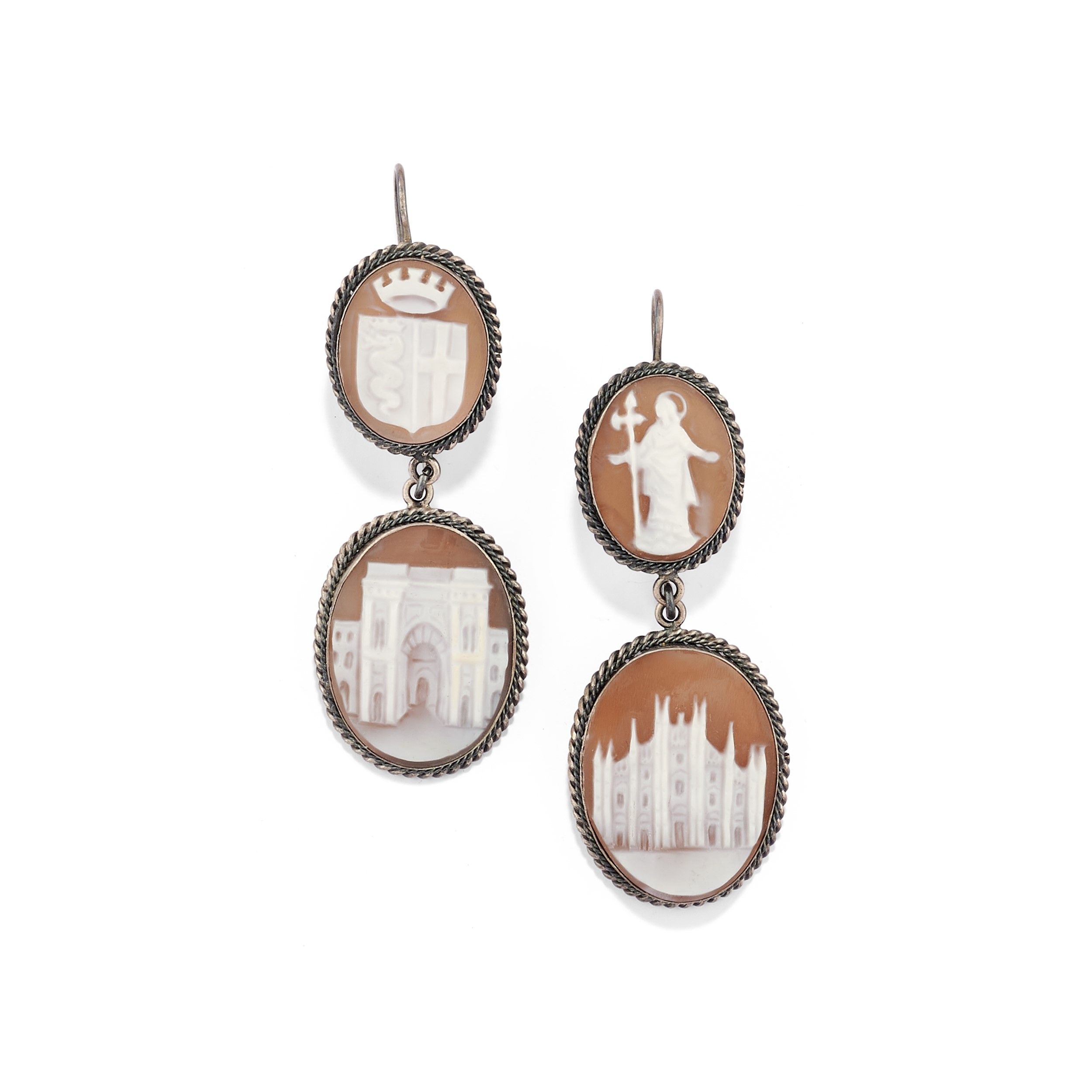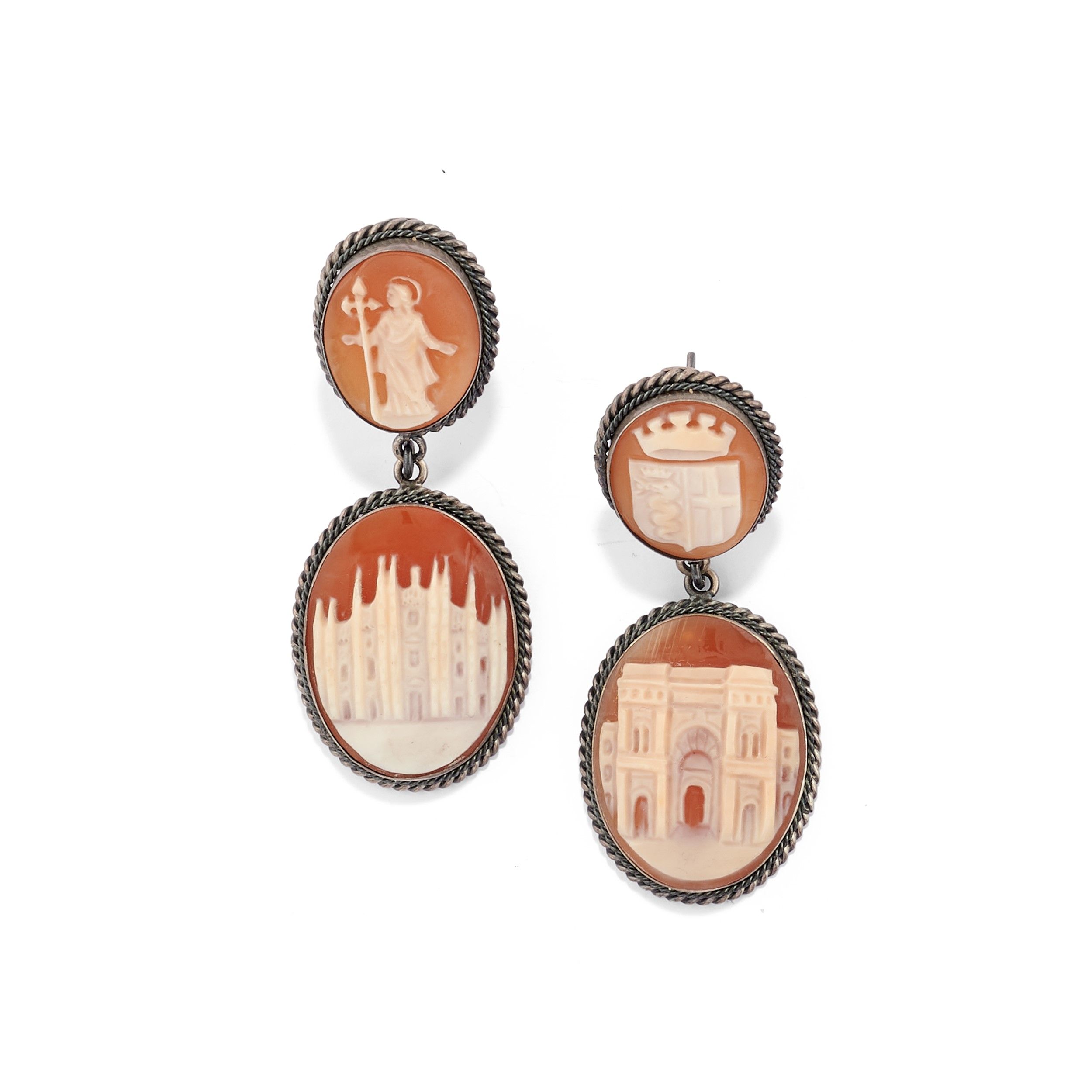 realizzati con medaglioni di forma ovale raffiguranti monumenti di Milano e di Roma, orecchini con chiusura con perno e clip e monachella.