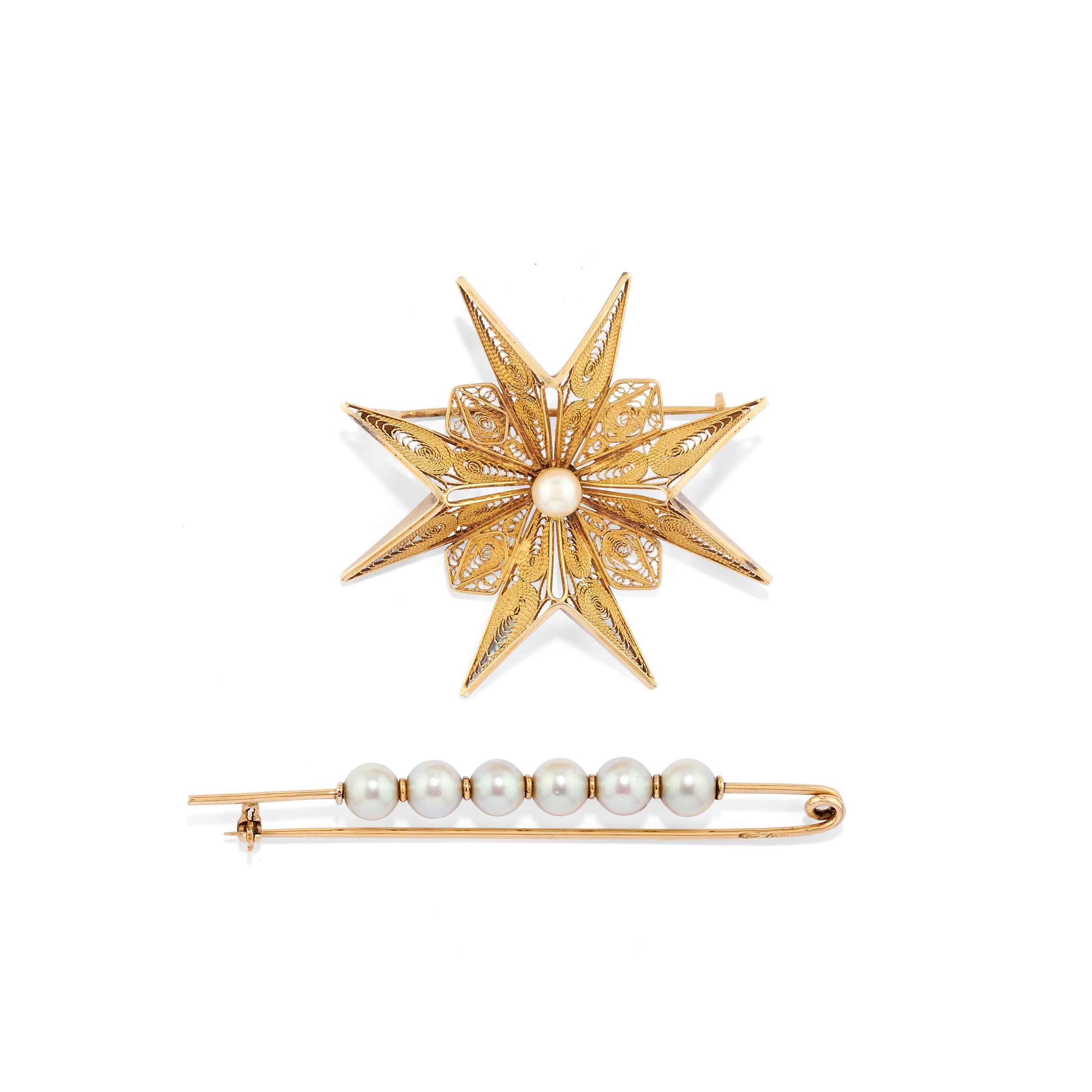 una a croce di Malta con decoro in filigrana e al centro perla coltivata di mm 6,50, l'altra a spilla da balia con perle coltivate di mm 7,00/7,50 circa.