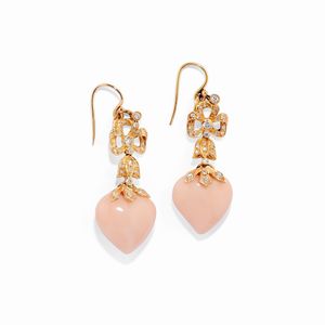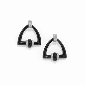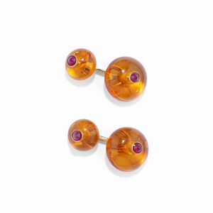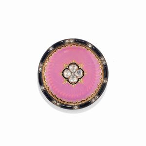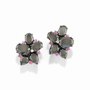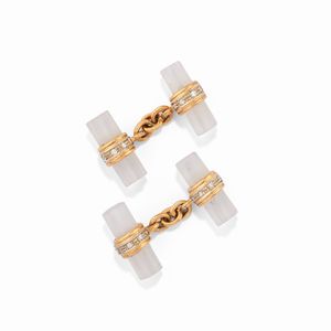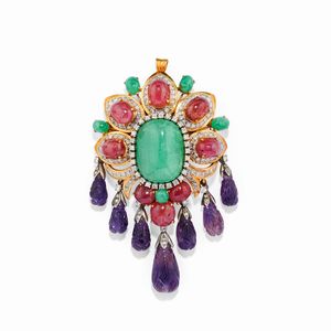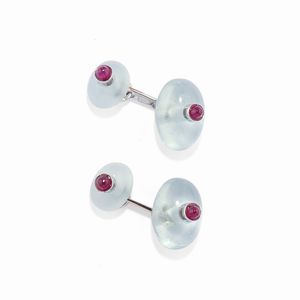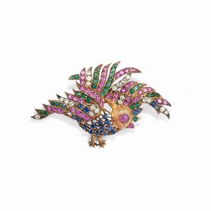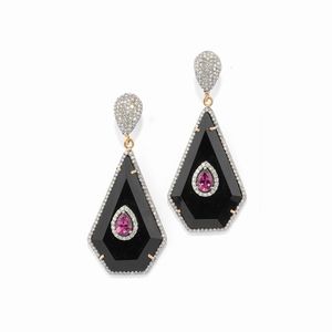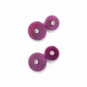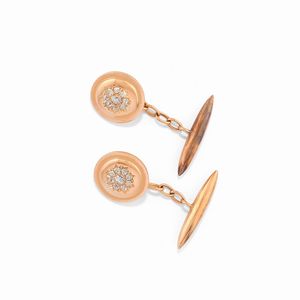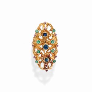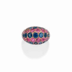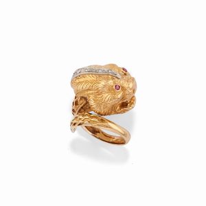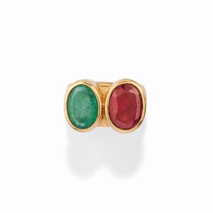 in oro bicolore 18k, Peso g 6,00 misura 18 a losanga, con diamanti taglio vecchio e contorno in rubini.