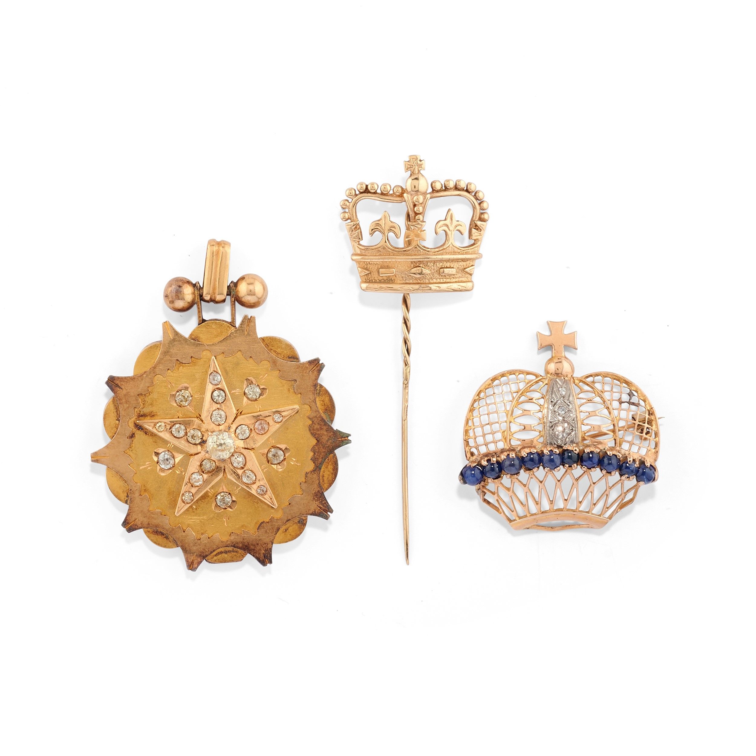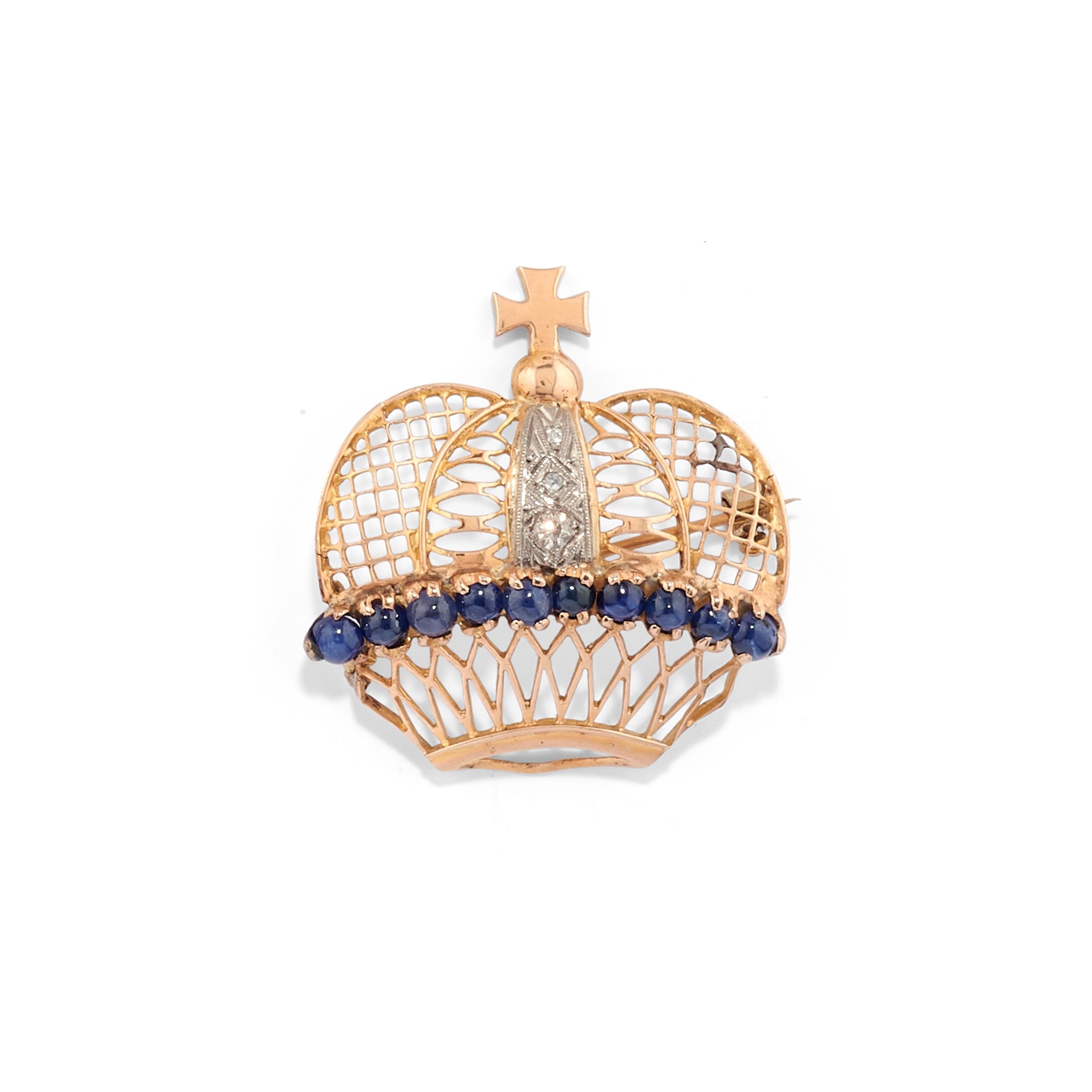 in oro giallo 9k e 18k, Peso g 31,30 composto da spilla raffigurante corona con zaffiri taglio rotondo cabochon e piccoli diamanti, spillone raffigurante corona e pendente porta fotografie apribile raffigurante stella con motivo centrale decorato da diamanti taglio vecchio.