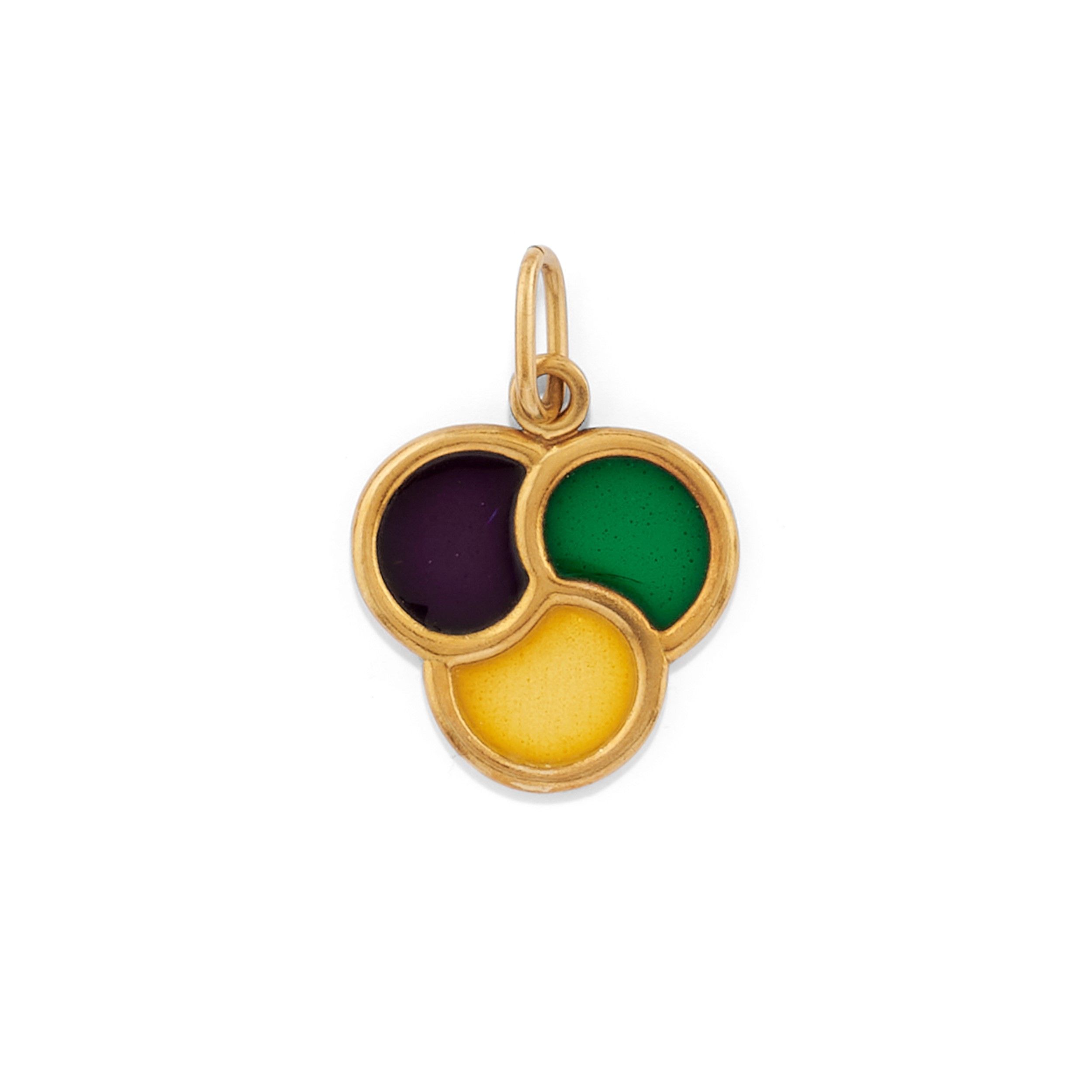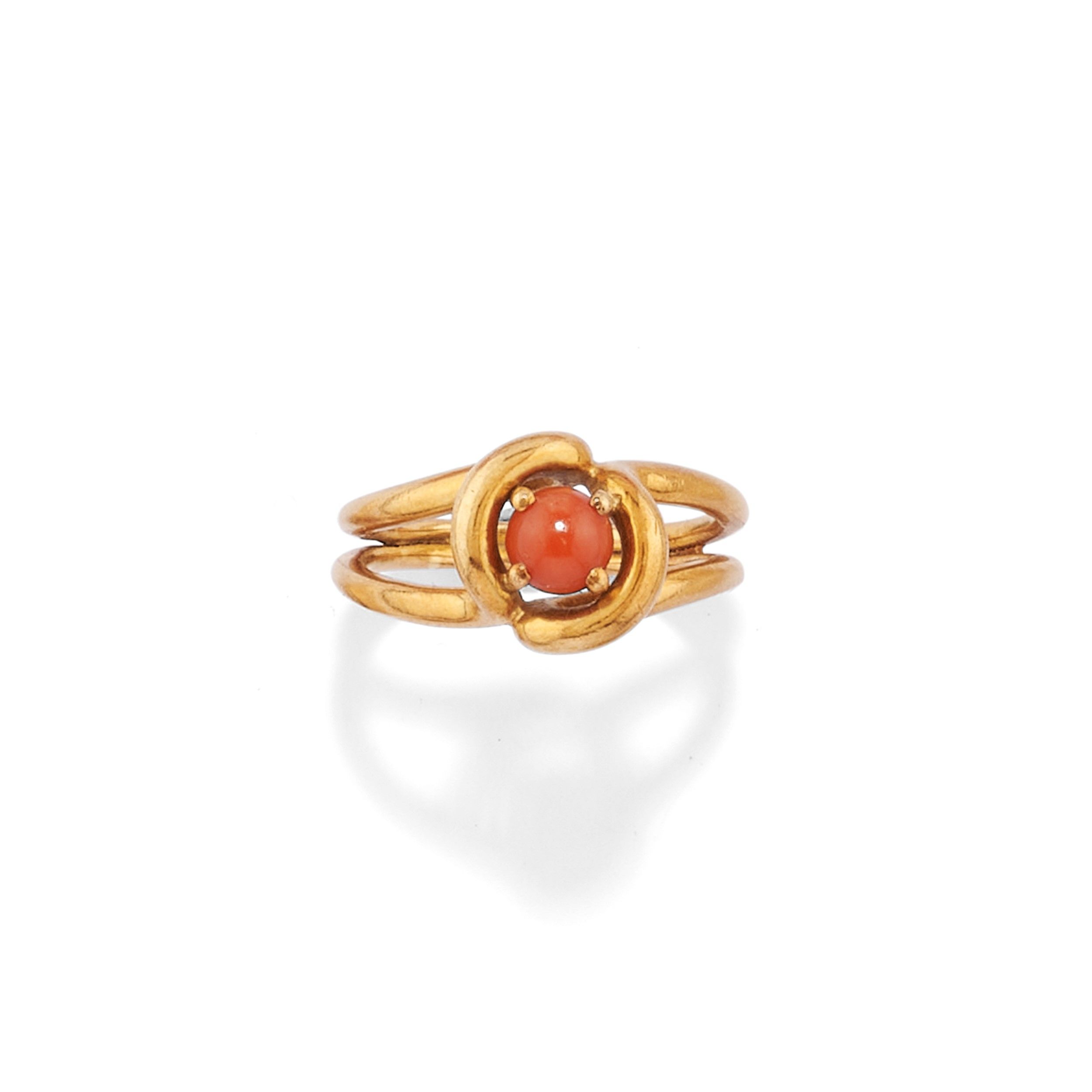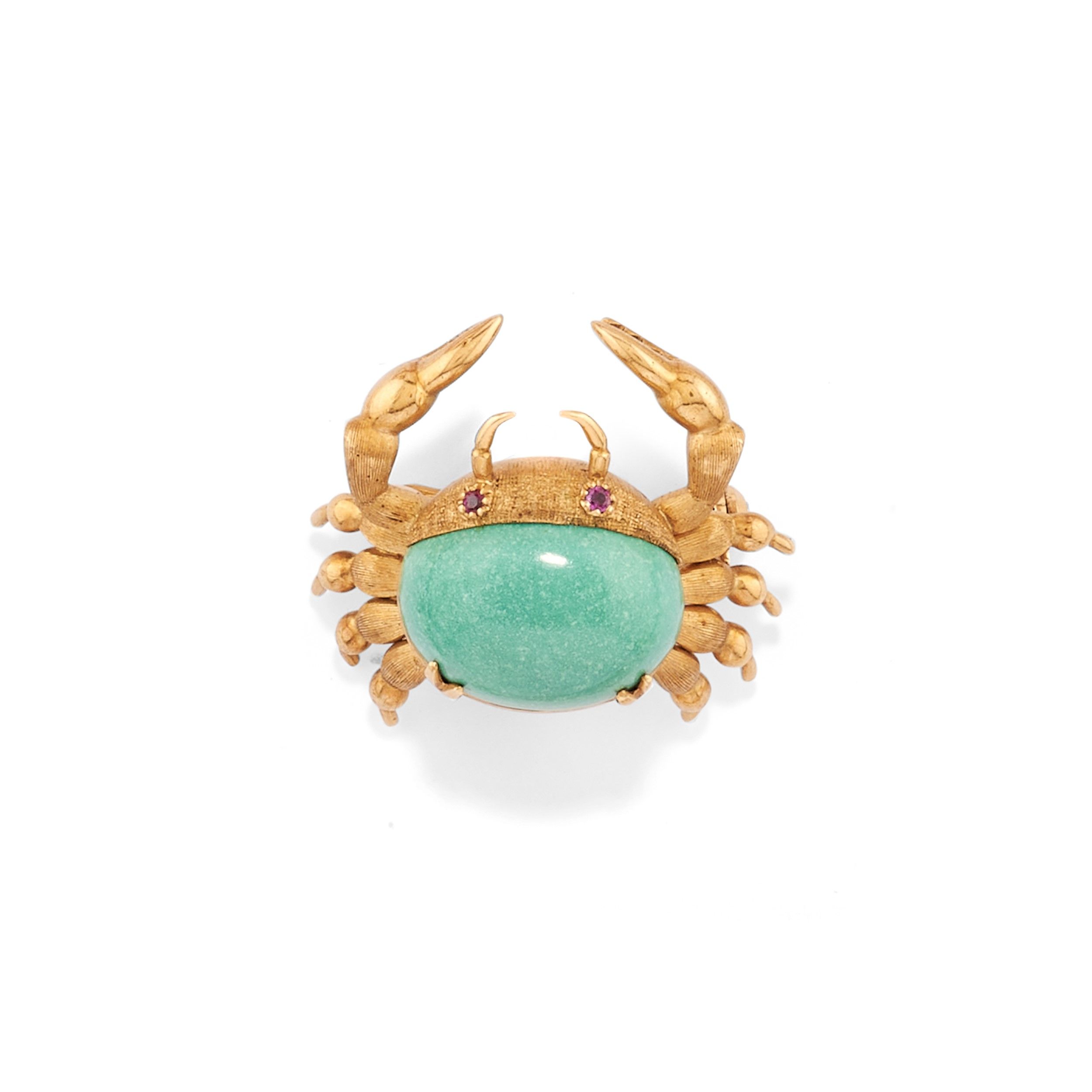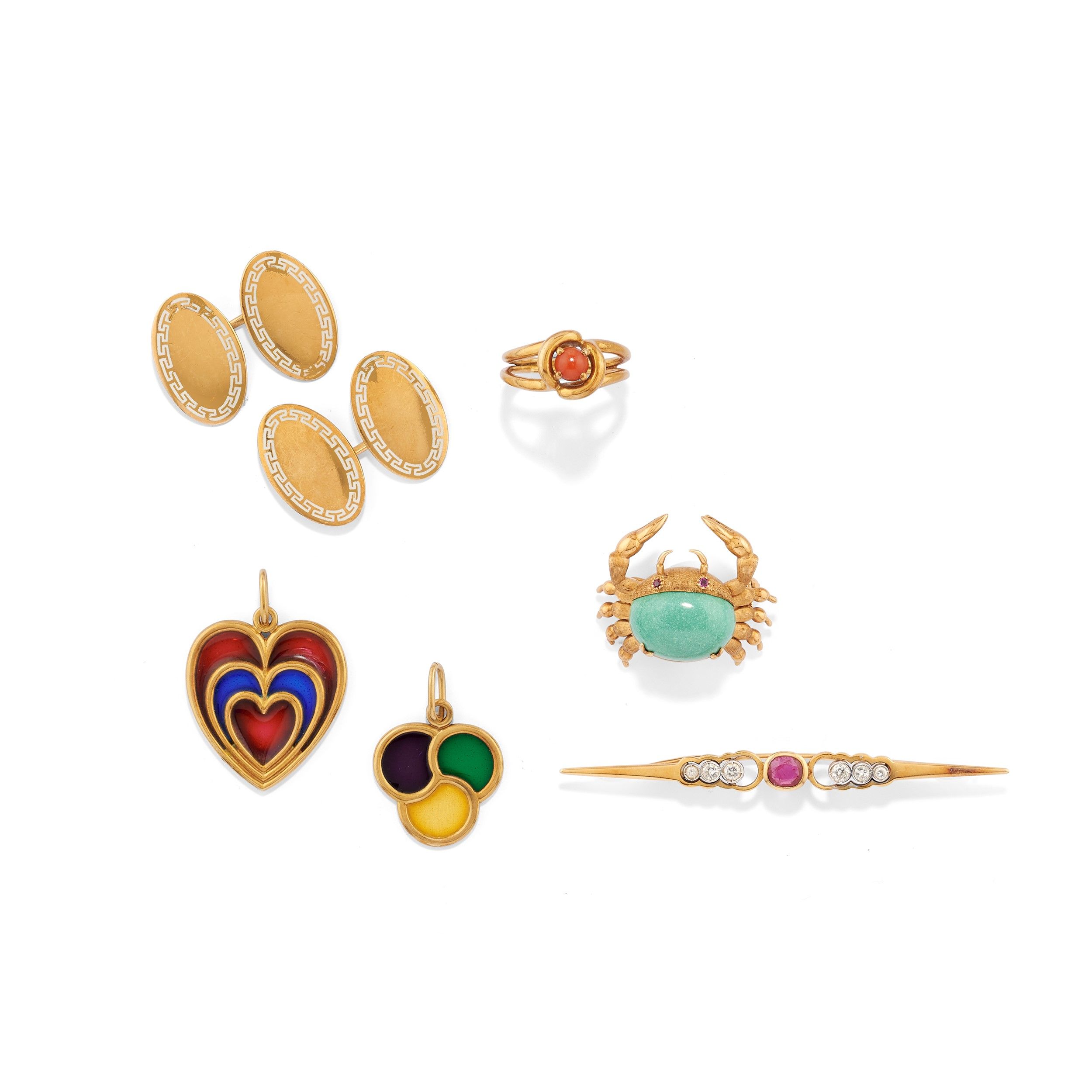 in oro giallo 18k, Peso g 49,50 misura 13 composto da spilla a forma di granchio con pietra dura, anello con corallo tondo cabochon, due pendenti con smalti multicolore, spilla a barretta con al centro rubino taglio ovale e diamanti taglio brillante e una coppia di gemelli di forma ovale con decoro in smalto bianco.