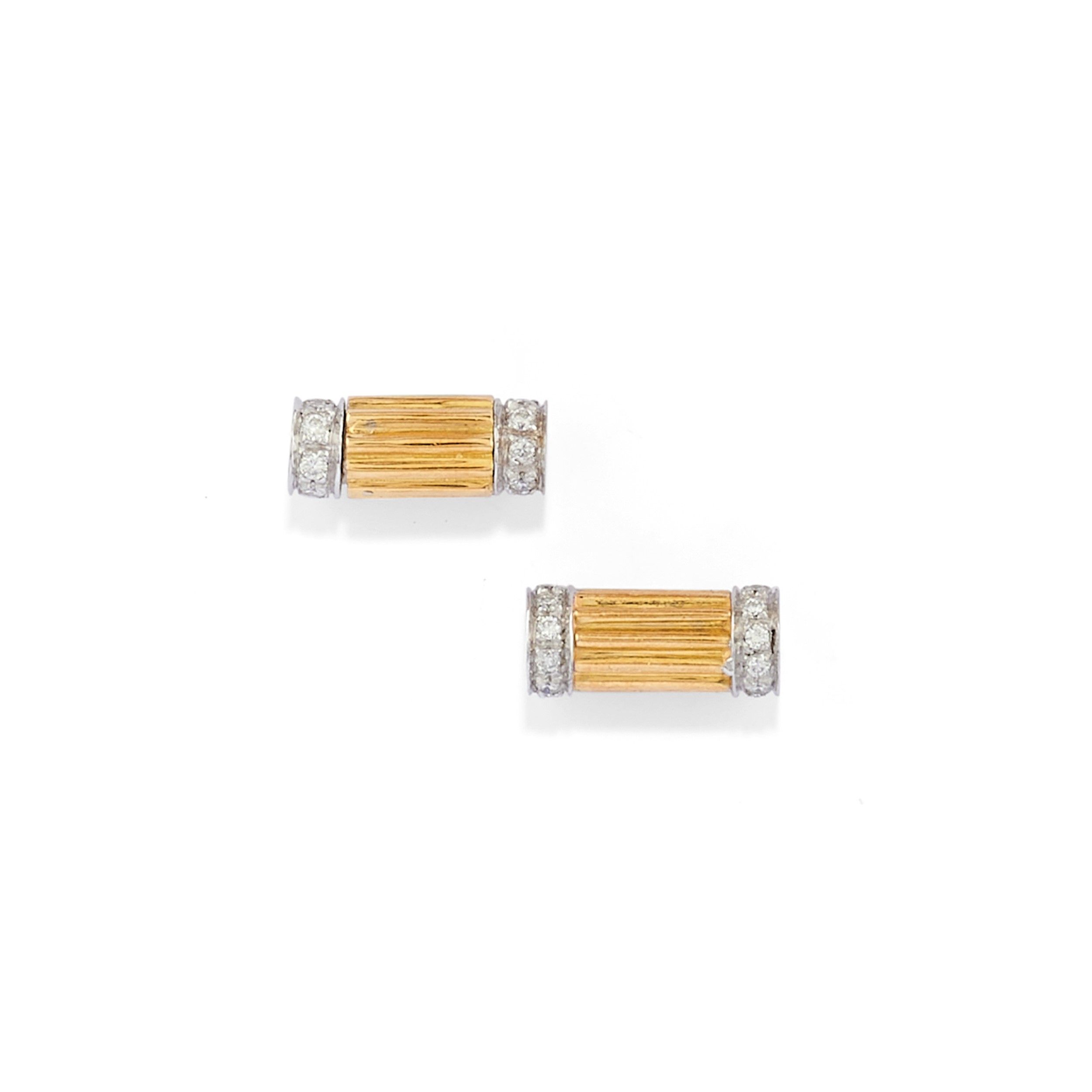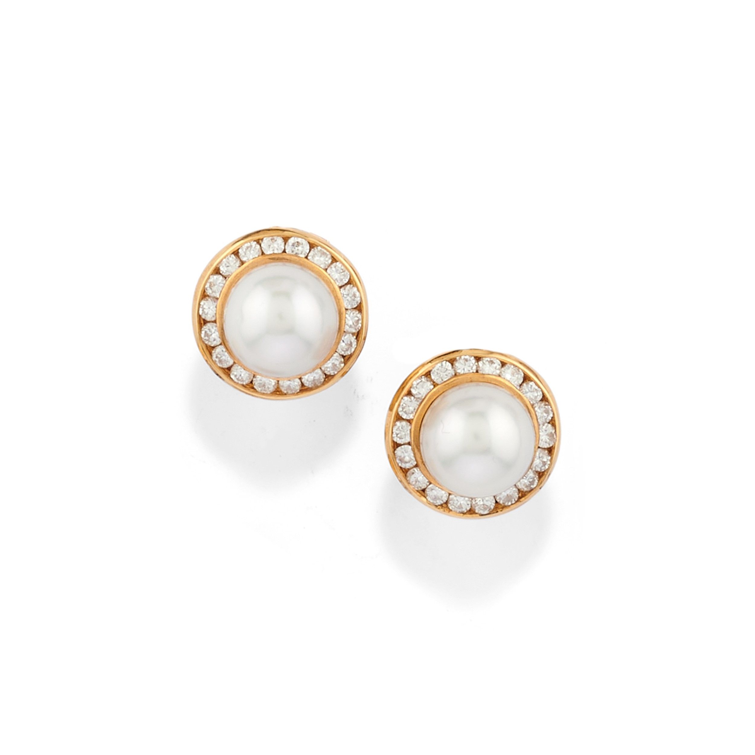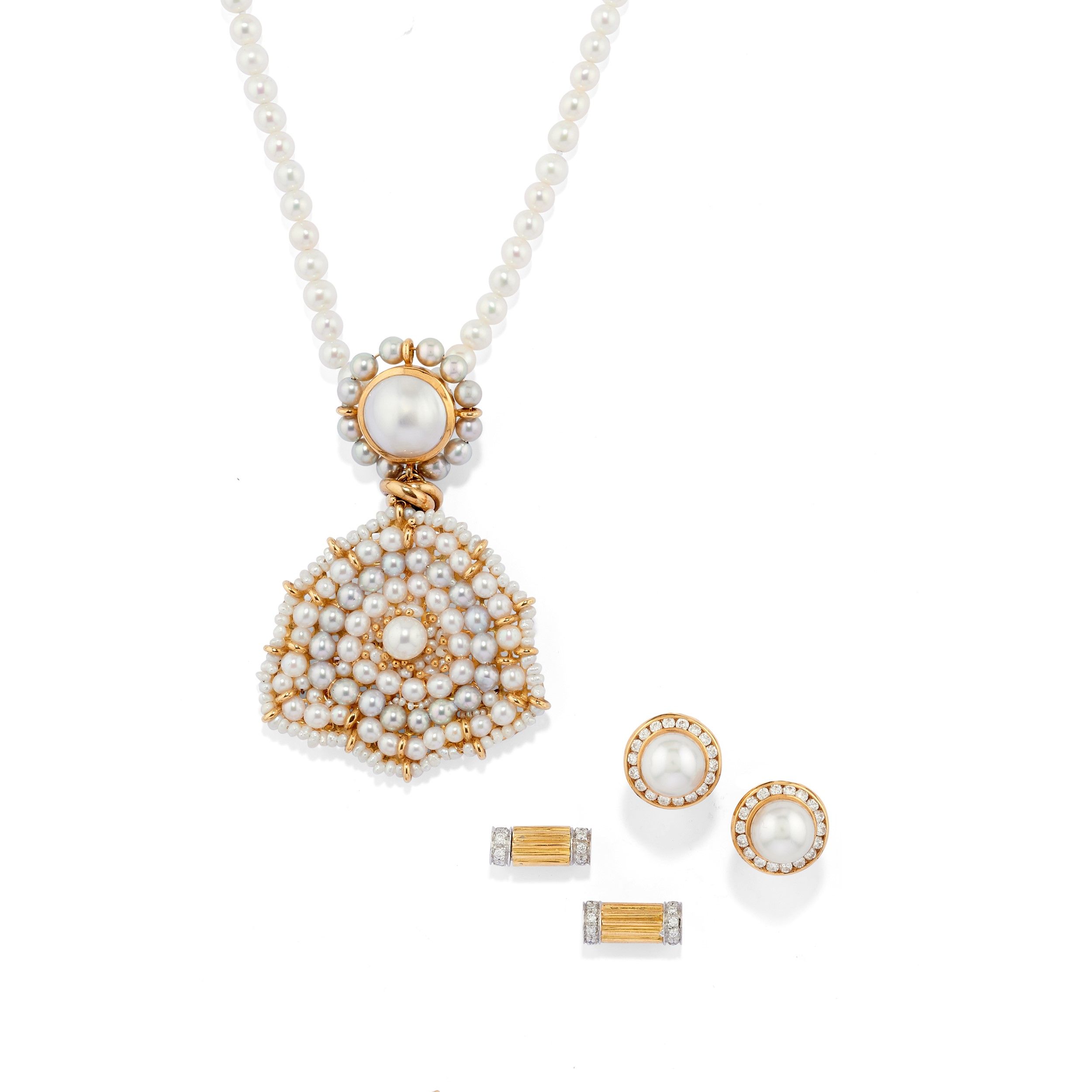 in oro giallo 18k, Peso g 45,60 cm 42,00-6,00 composto da una collana ad un filo di perle coltivate di mm 4,50 circa con pendente estraibile, coppia di orecchini con perle coltivate e diamanti taglio brillante e chiusura perno e clip, e due interruttori per collana con diamanti.