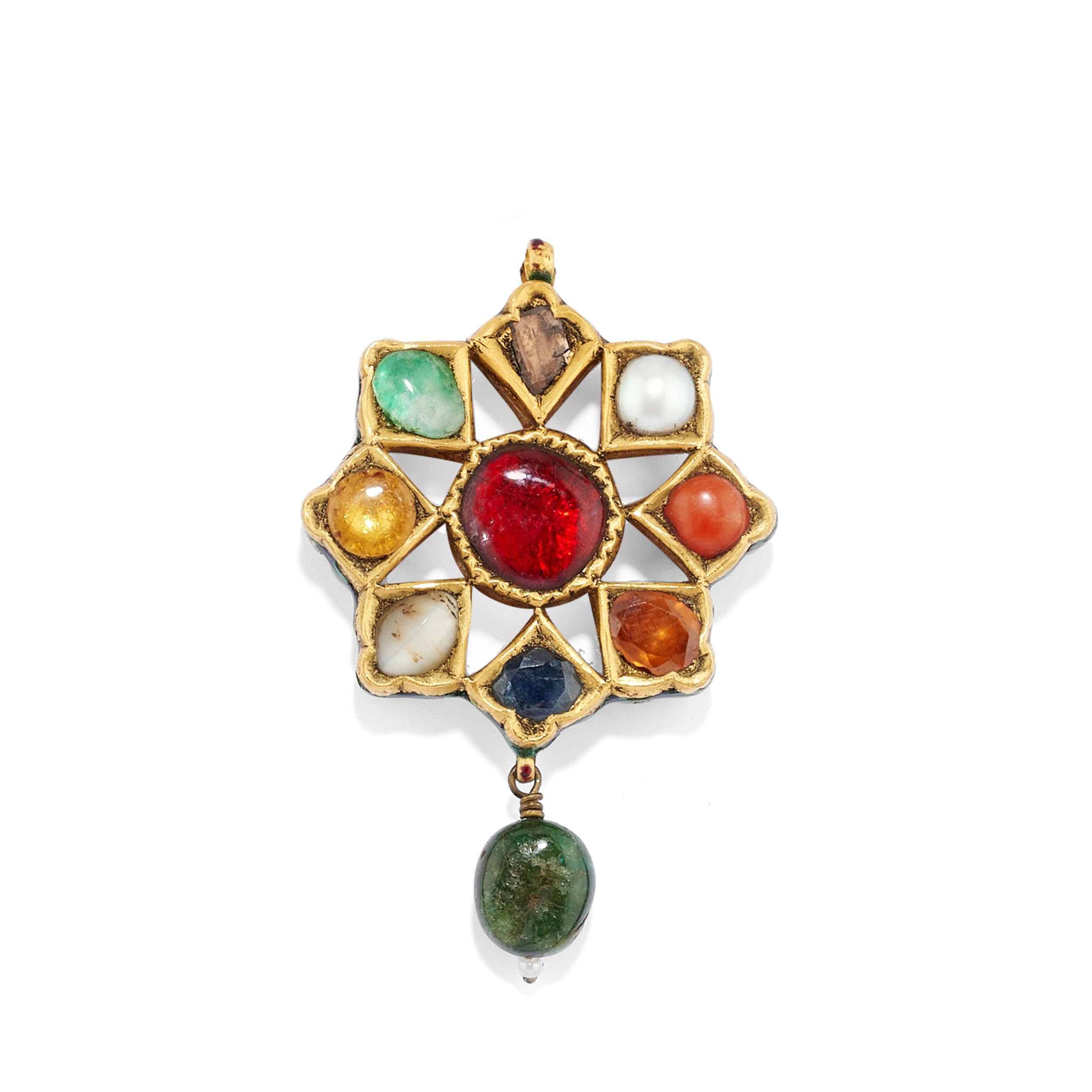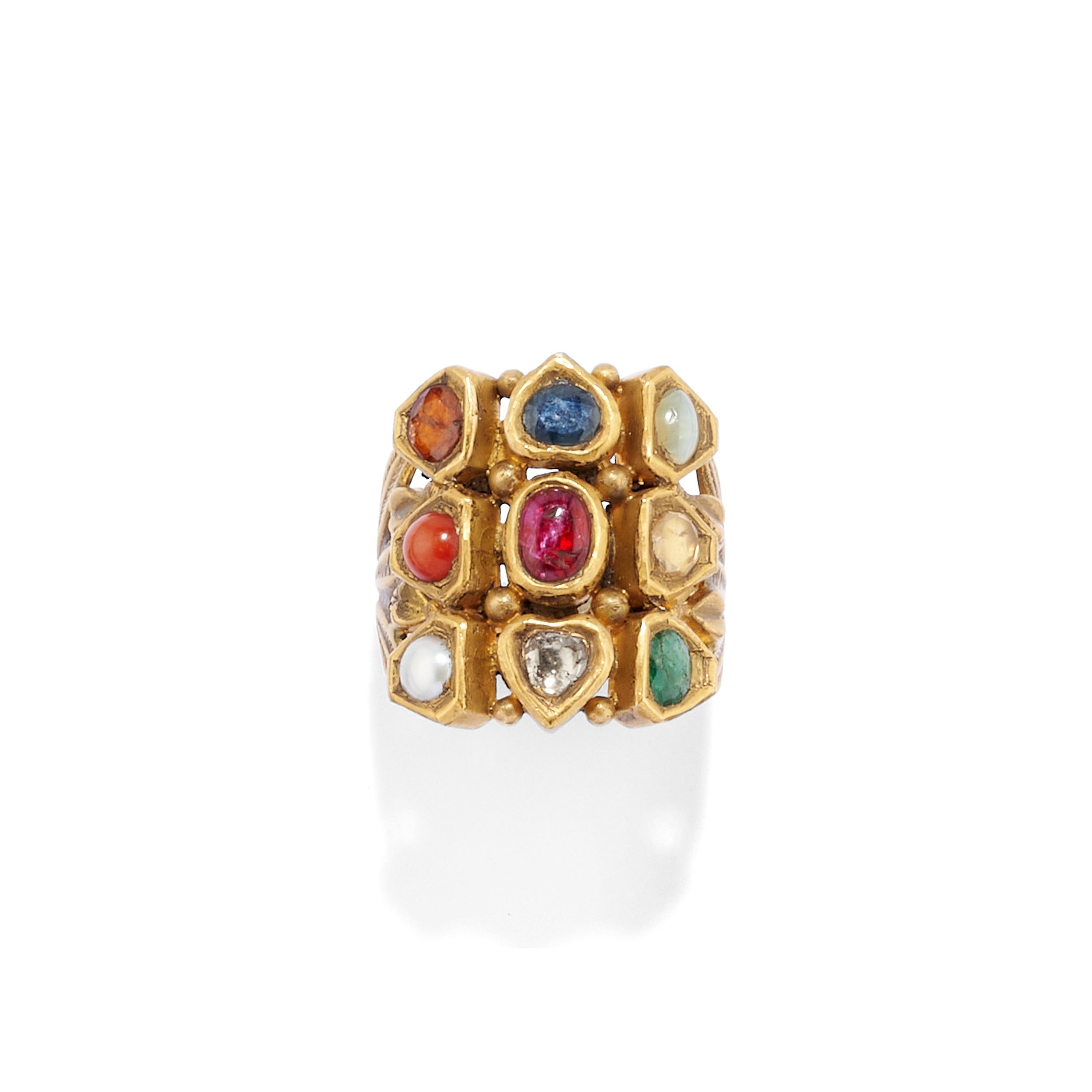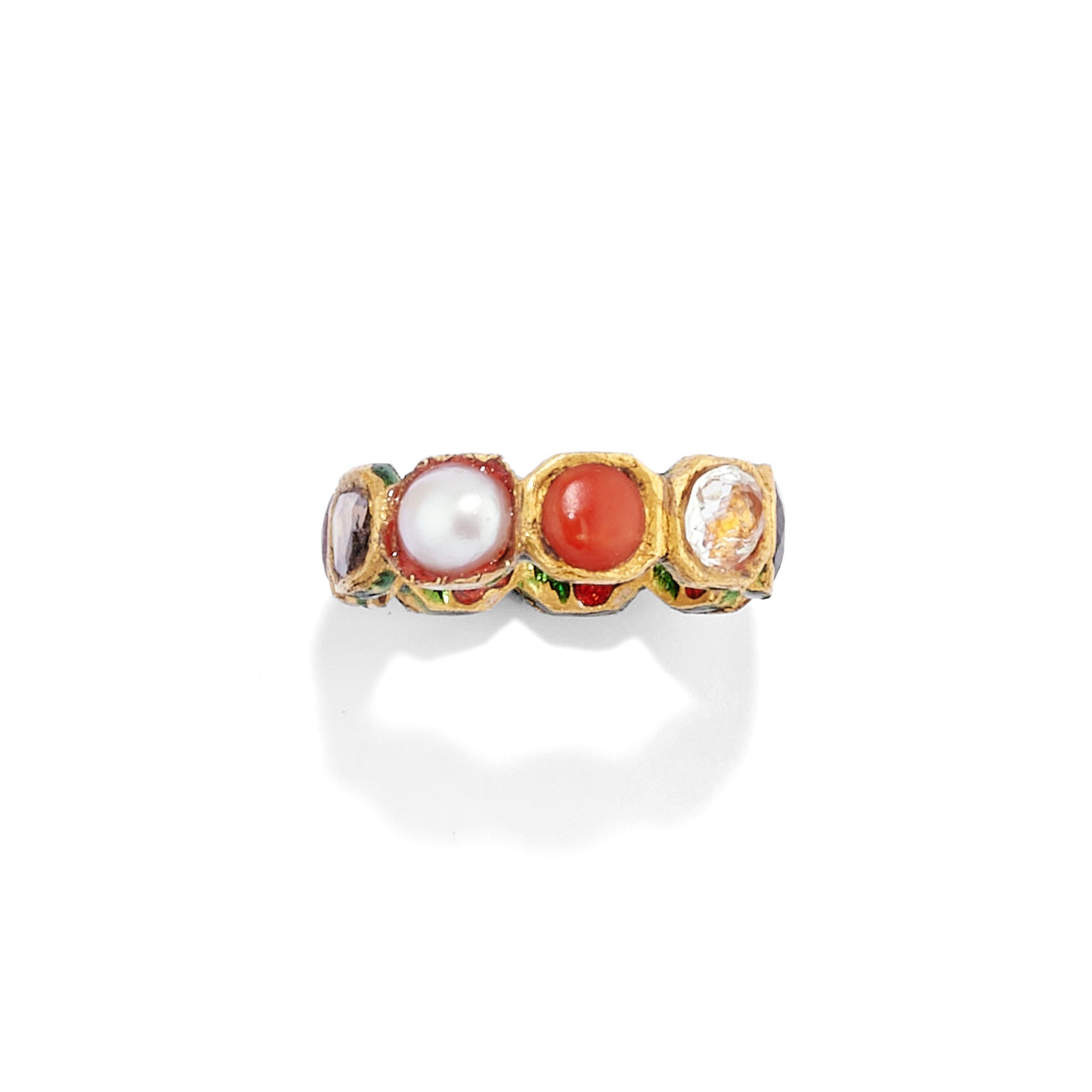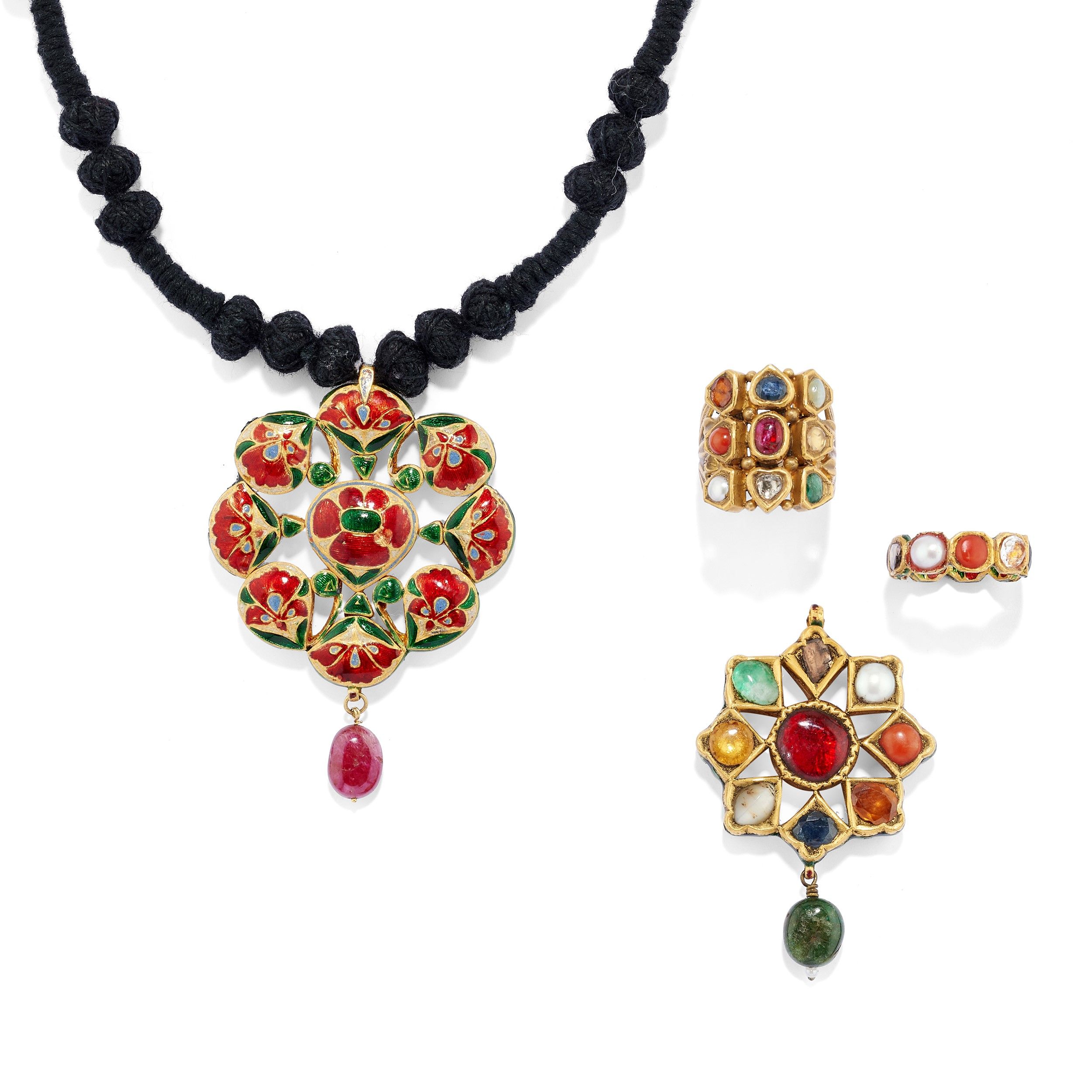 in oro giallo 18k, Peso g 73,00 cm 6,50-5,00 misure 14-19 composto da un anello a tutto giro con paste vitree e pietre di colore di tagli e colori diversi montate a notte con all'interno tipici decori in smalti policromi di colore rosso e verde, un anello a fascia con pietre di colore e paste vitree di tagli diversi e due pendenti a nove gemme con al verso i tipici decori in smalti policromi verdi e rossi a motivo floreale, uno dei due pendenti è trattenuto da cordoncino in cotone nero.