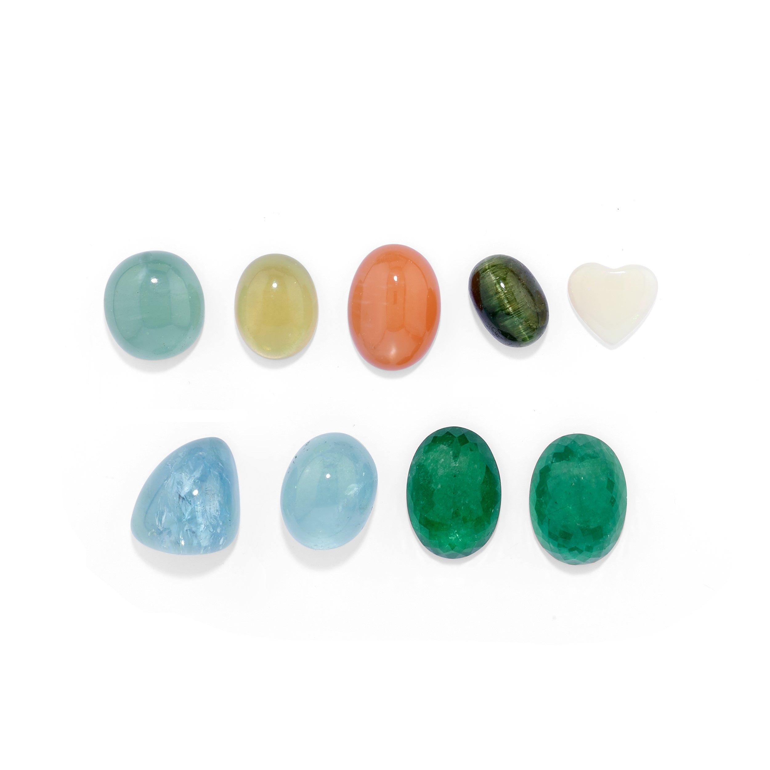 composto da due smeraldi taglio ovale per totale ct 35,38 (ct 19,43, ct 15,85), due acquamarine (prob.) taglio cabochon di forma ovale e triangolare per totale ct 60,09 (ct 36,62, ct 35,28) e quattro pietre taglio ovale cabochon (prob. topazio, quarzo, labradorite e opale) per totale ct 61,85.