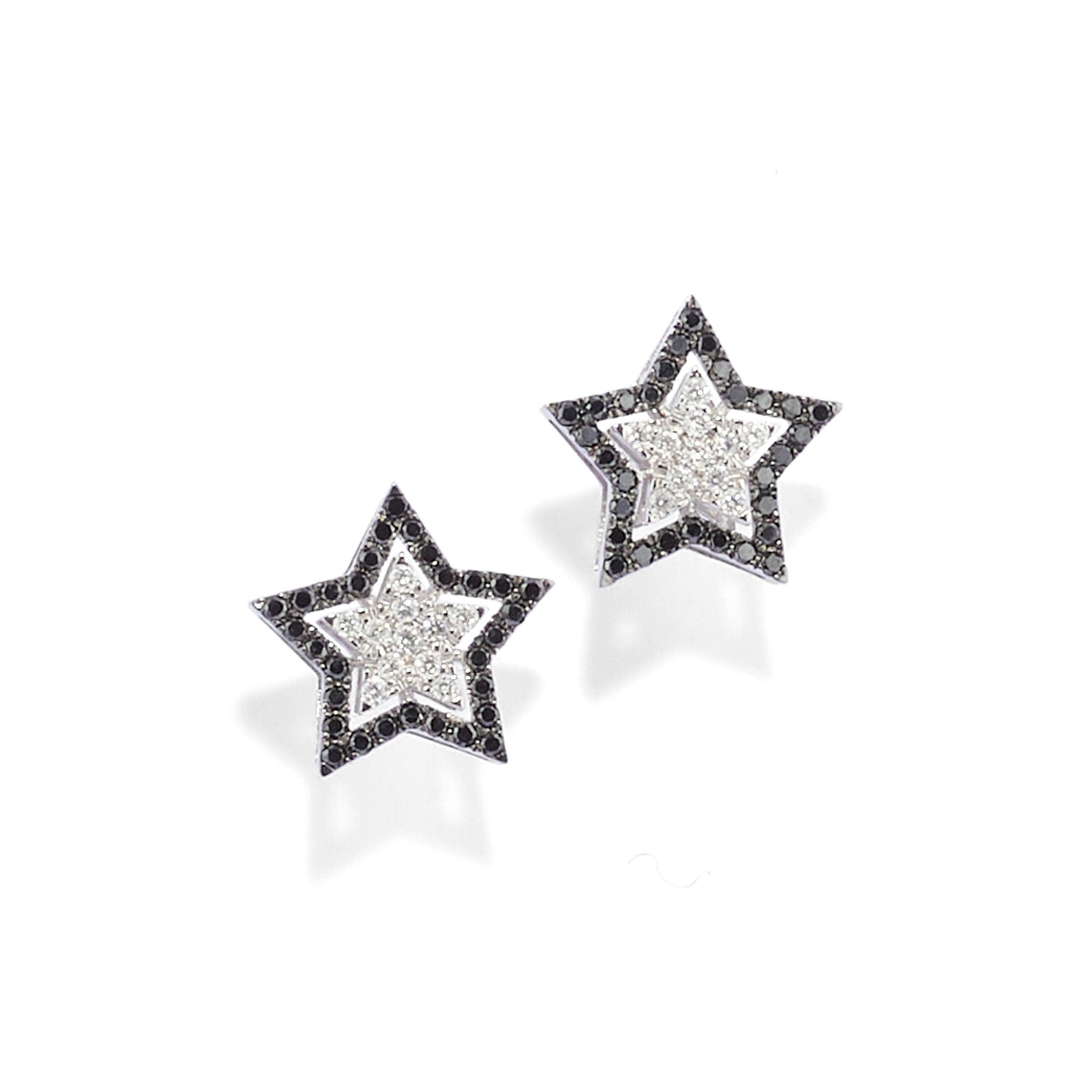 con motivo a stella, in diamanti incolori e neri taglio brillante e rotondo per totale ct 0,40 circa, chiusura perno e farfalla.