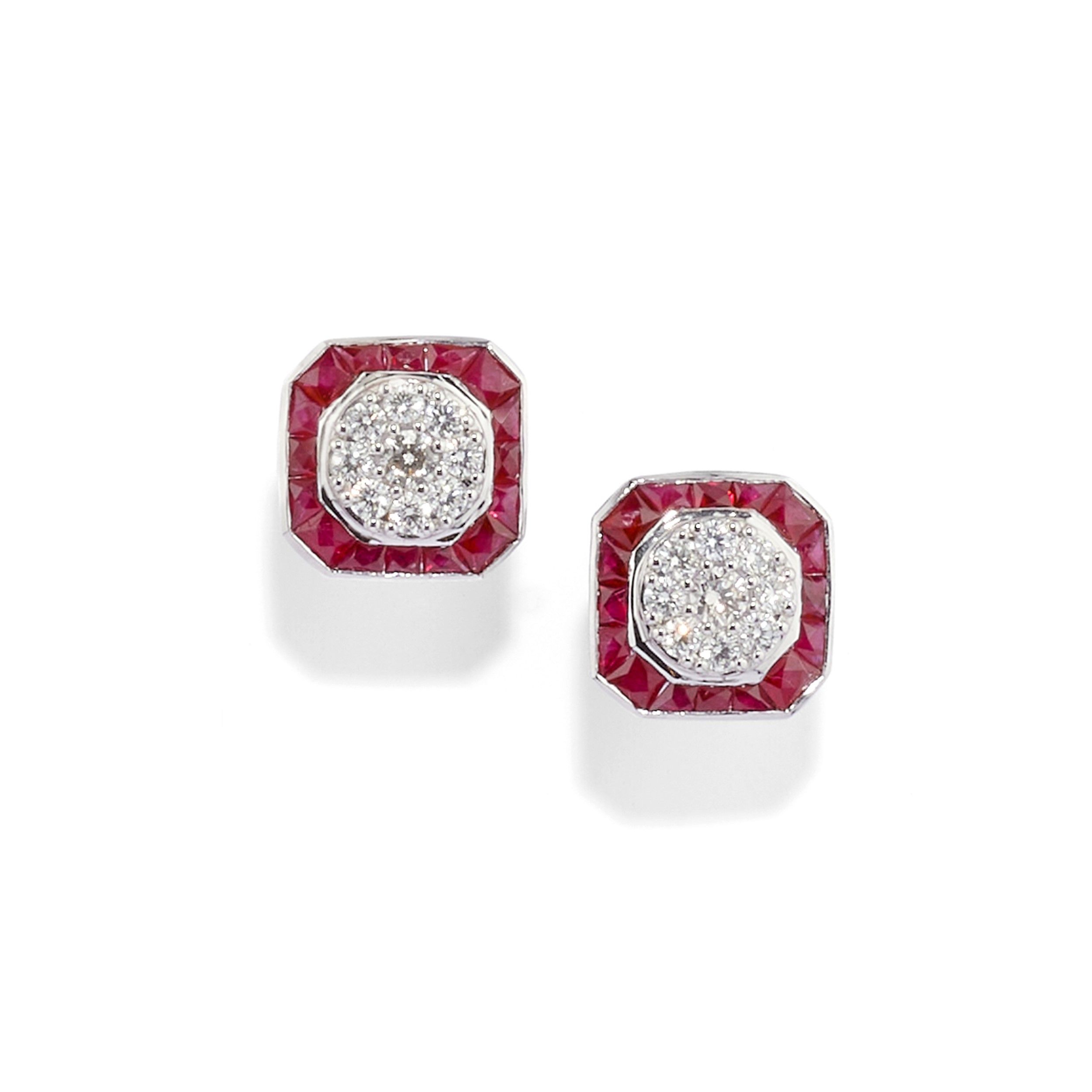 di forma ottagonale, al centro pavè in diamanti taglio brillante per totale ct 0,60 circa entro contorno in rubini taglio sfaccettato per totale ct 1,30 circa, chiusura con perno e farfalla.