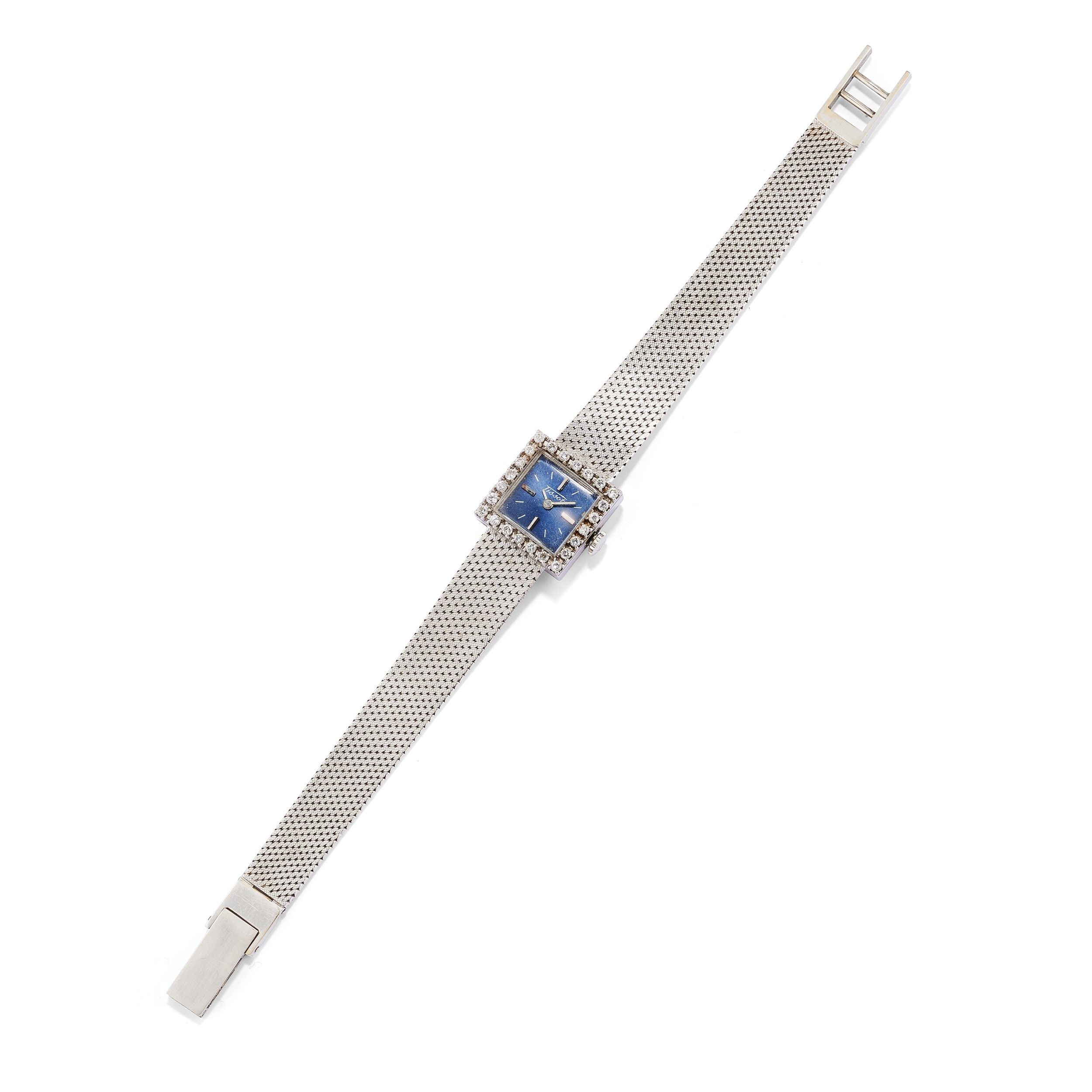 cassa quadrata mm 17,00, quadrante blu, indici applicati, movimento a carica manuale, diamanti taglio brillante a decoro, cinturino in maglia, da revisionare.