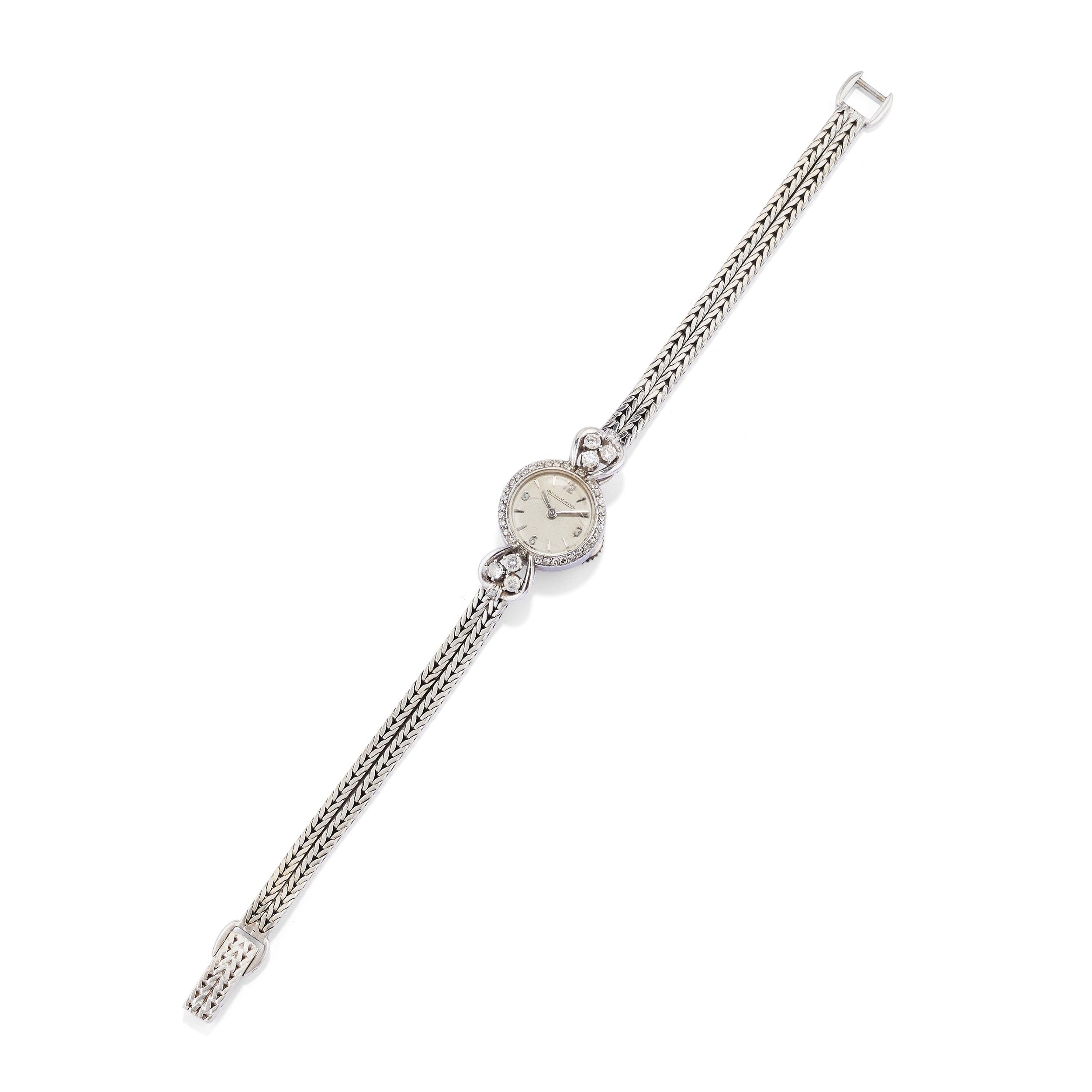 cassa rotonda mm 16,00, quadrante argentče, numeri e indici applicati, movimento a carica manuale, bracciale a doppia catena morbida e diamanti taglio brillante e huit-huit, da revisionare.