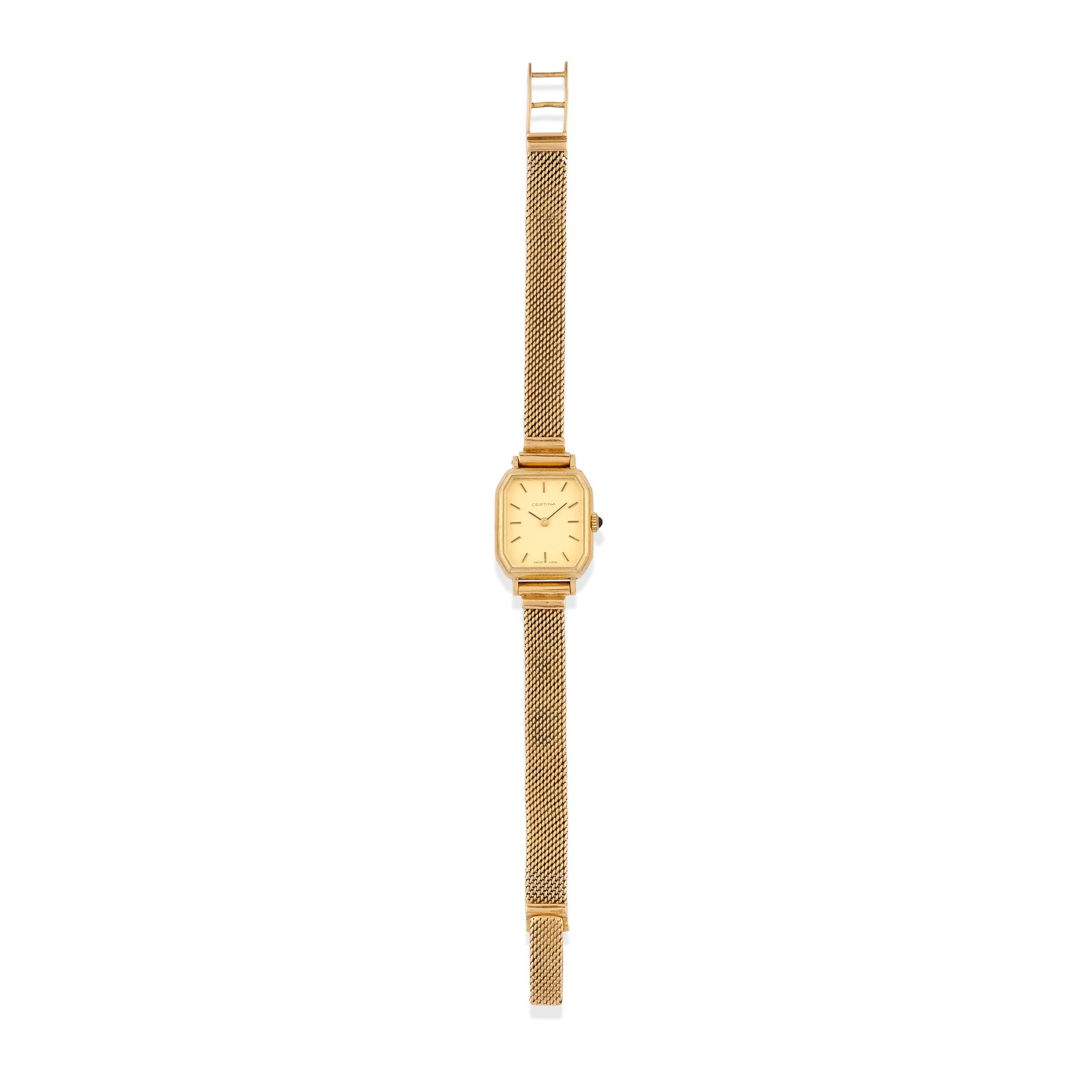 cassa ottagonale mm 19,00x22,00, quadrante oro, indici applicati, movimento a carica manuale, cinturino in maglia, da revisionare.
