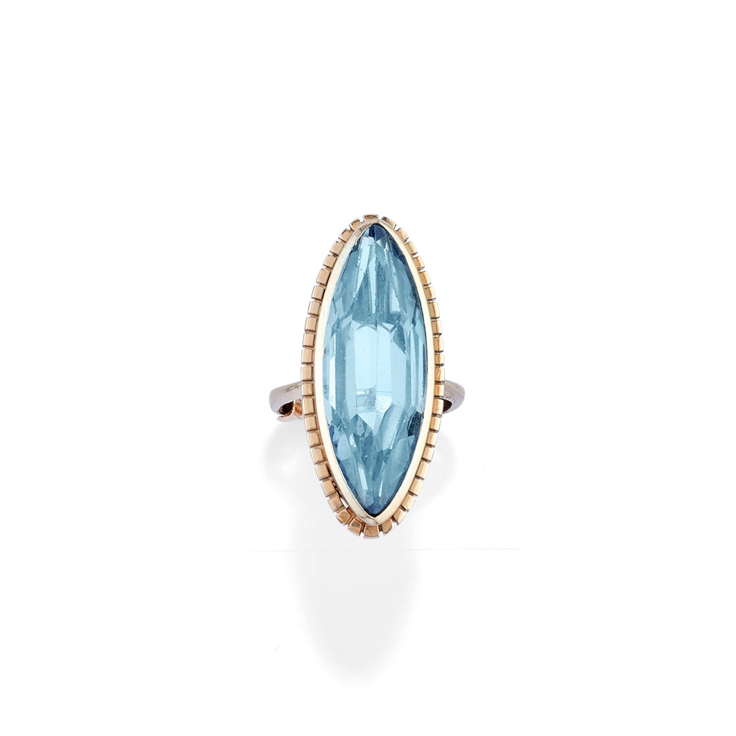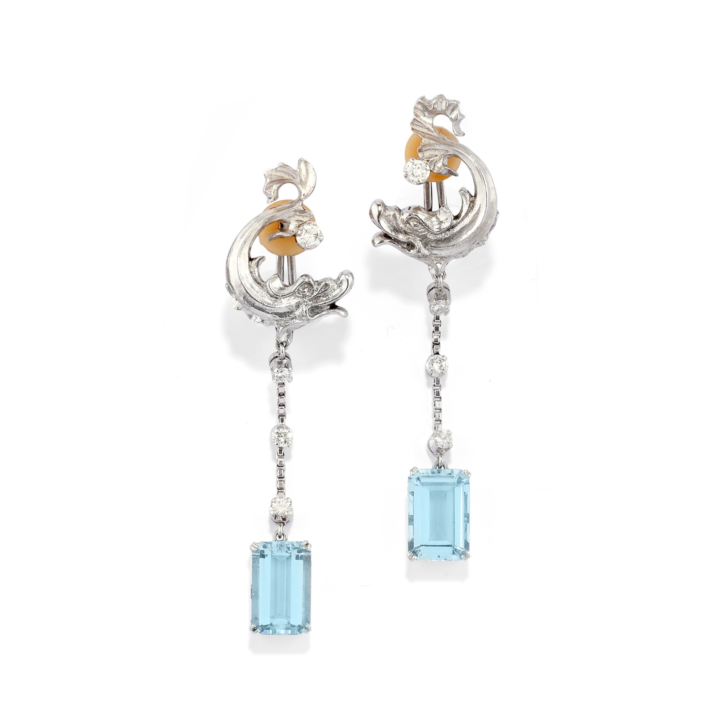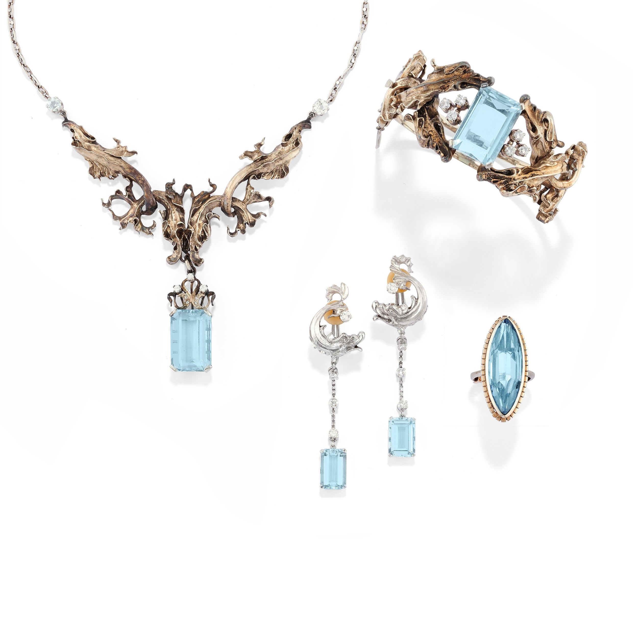 composta da collana con centrale con motivi a dragoni e pendente estraibile con acquamarina taglio ottagonale e diamanti taglio brillante, trattenuto da catena con castoni in zirconi, coppia di orecchini pendenti con acquamarina taglio ottagonale e diamanti taglio brillante, con chiusura perno e clip, bracciale rigido e anello con acquamarina taglio marquise.
