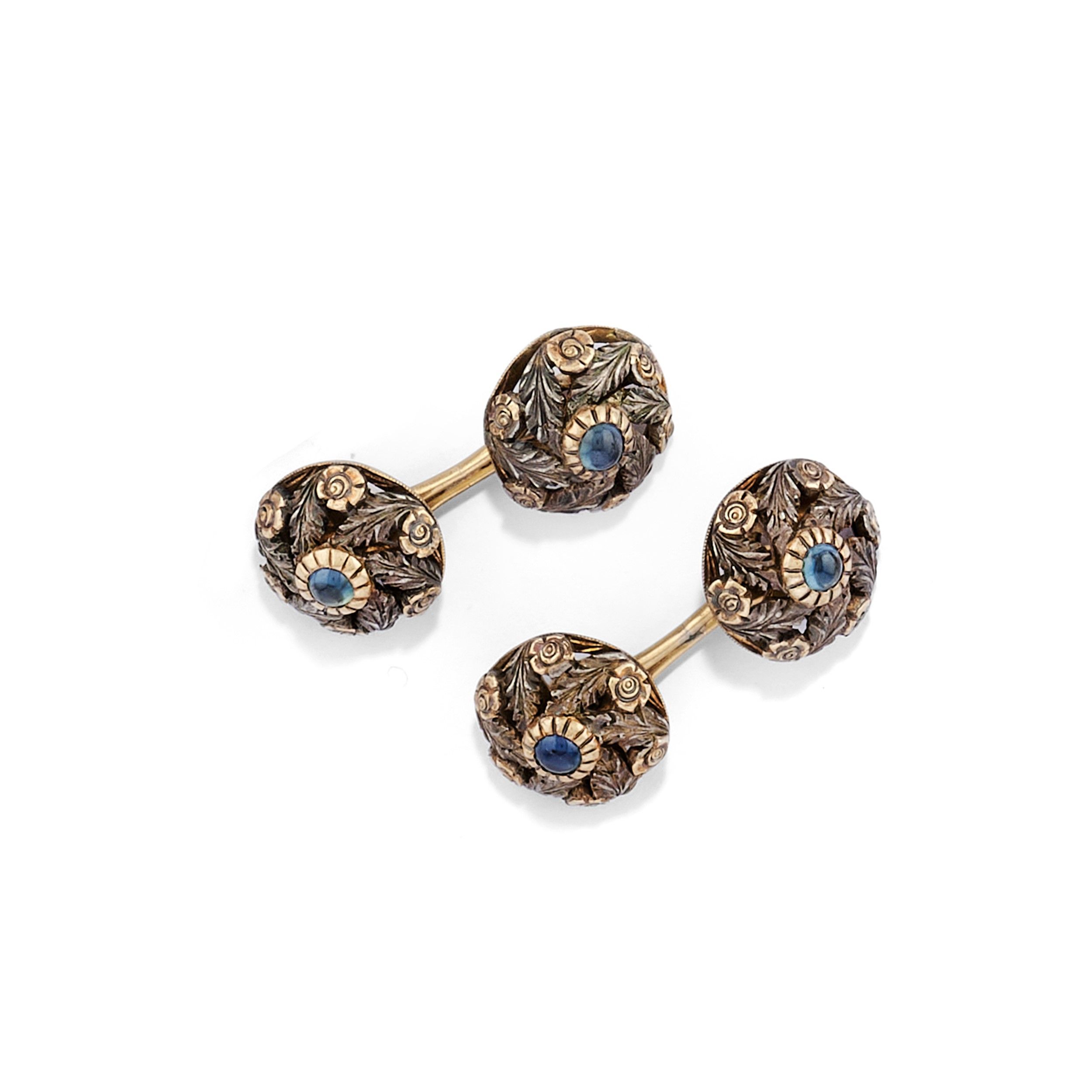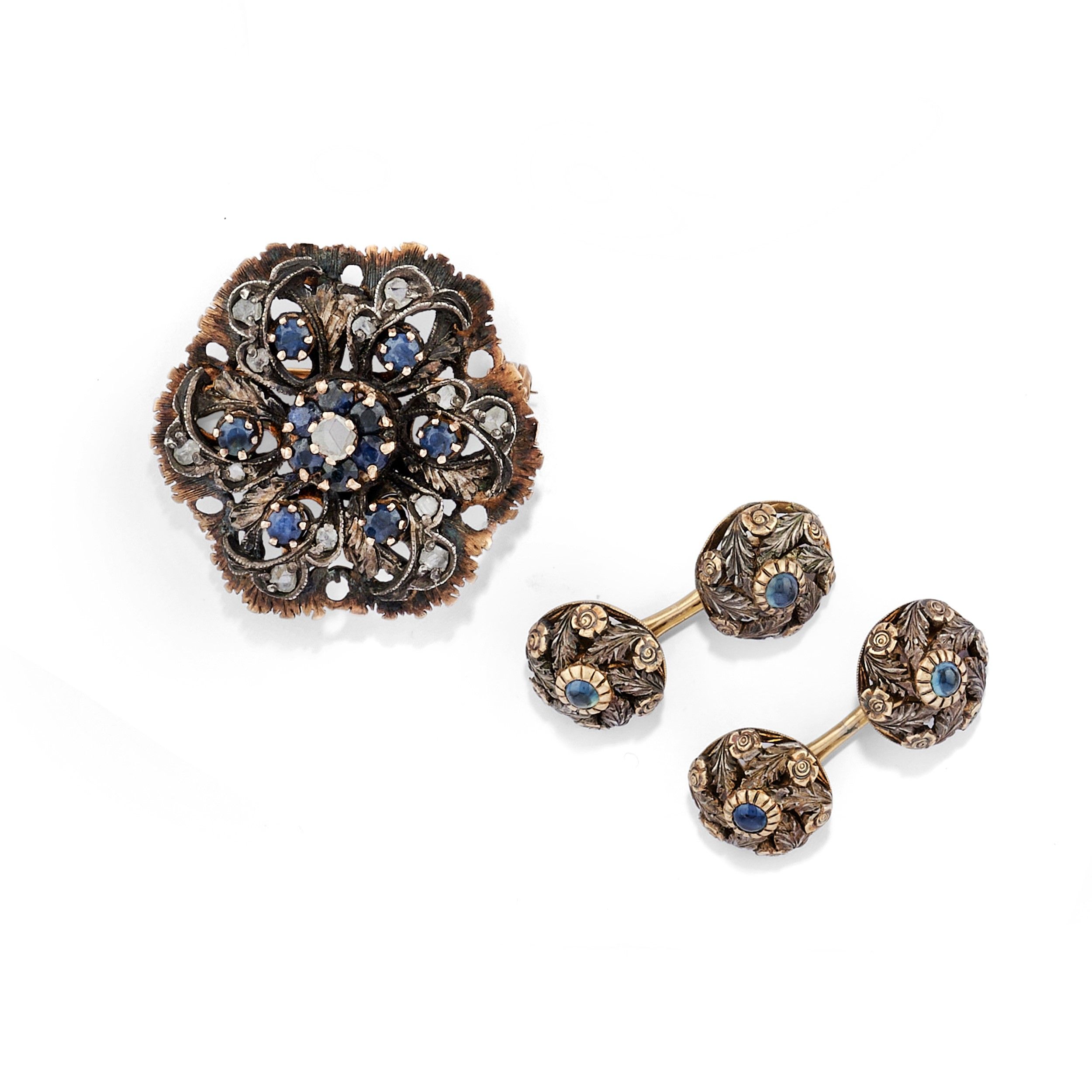 spilla a motivo floreale e polsini traforati e incisi, decorati da diamanti e zaffiri.