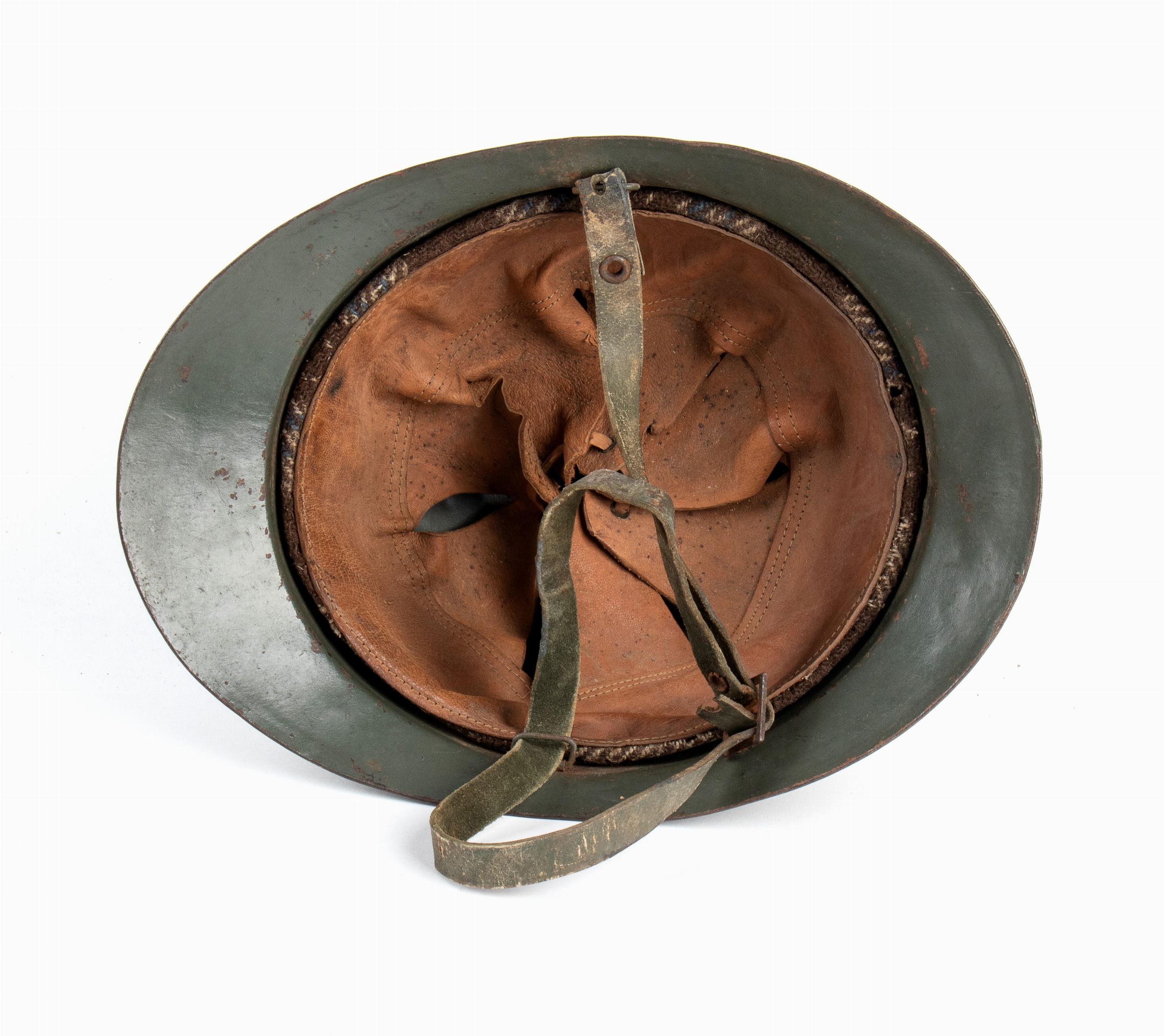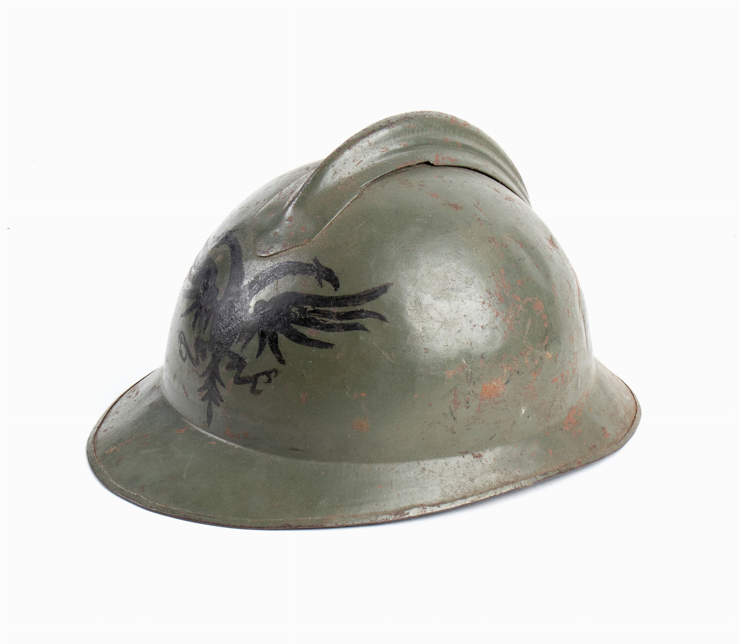 Elmetto modello 16 di fabbricazione italiana con dipinta frontalmente grande aquila bicipite Albanese, probabilmente appartenente ad unità della guardia precedenti il regno di Re Zog. In ottimo stato.