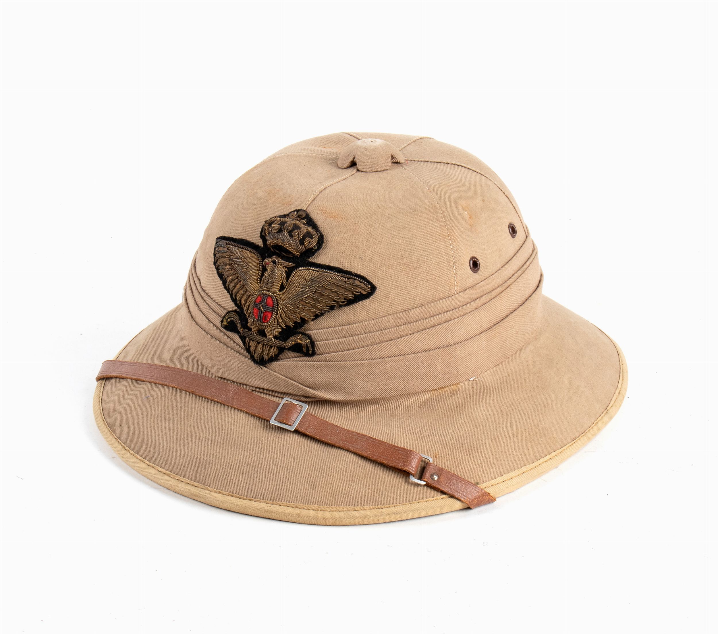 prima metà XX sec. Casco coloniale in sughero foderato di tela di cotone bianca, fregio particolare con aquila in canottiglia dorata su fondo nero, per funzionario coloniale dei tardi anni 20; in buono stato.