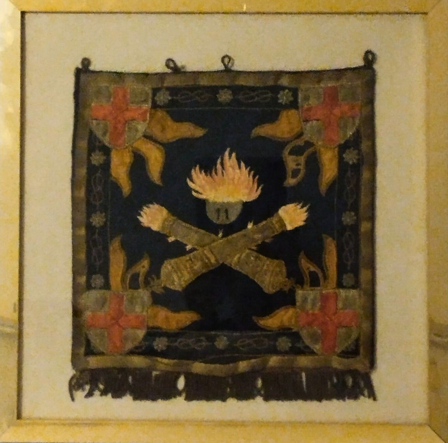 27x27 cm prima metà XX sec. Drappella da tromba dell'11° Rgt artiglieria da campagna 'Monferrato', supporto in panno con ricami di cotone e in canottiglia e filato dorato, ottima fattura, conservata in cornice a giorno, l'11° rgt prese parte alla campagna d'Etiopia, cambiata denominazione all'inizio del secondo conflitto partecipa alla campagna contro la Francia per poi essere schierato a sud in funzione di difesa costiera,dopo l'armistizio viene assegnata al gruppo di combattimento 2Legnano'