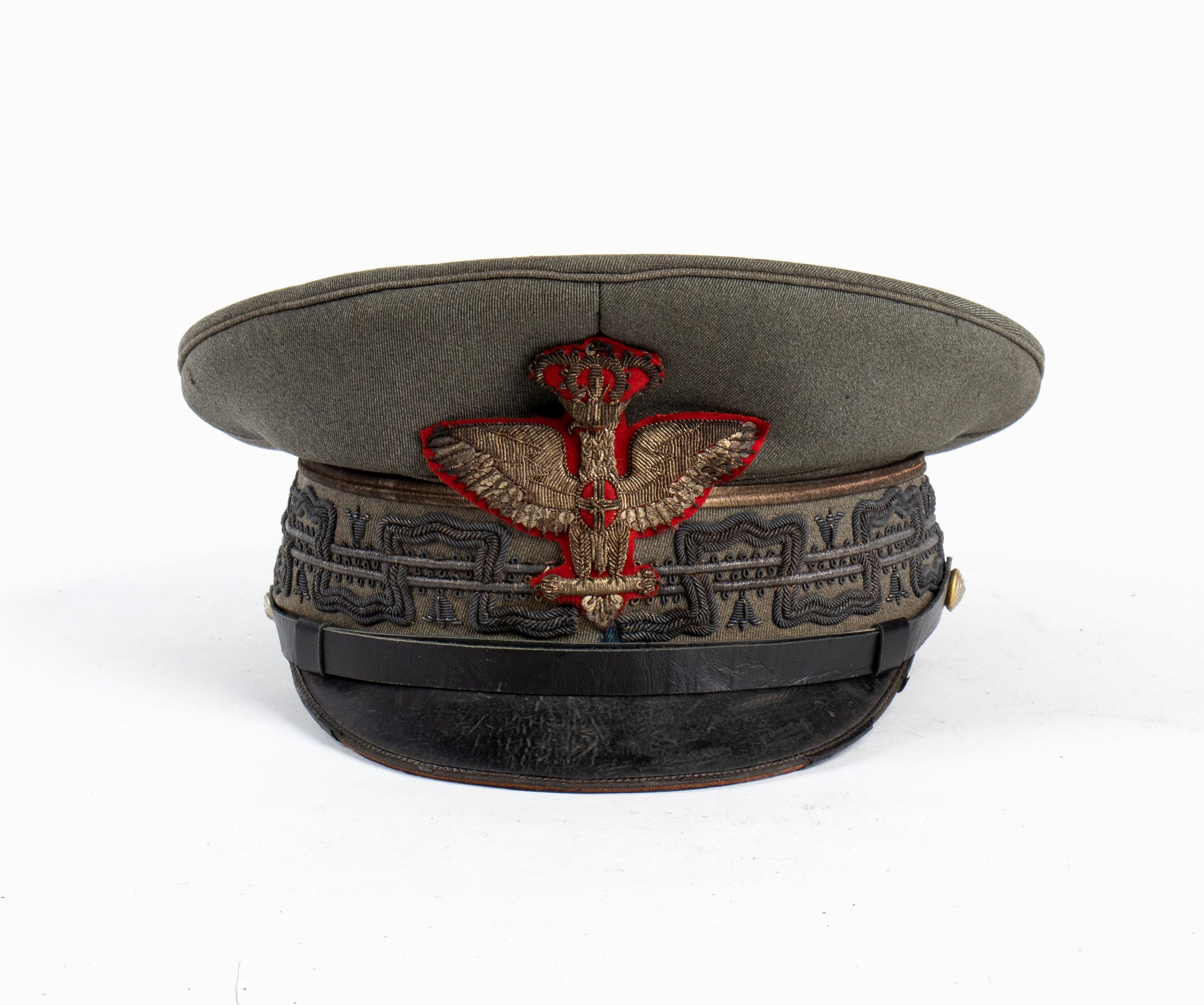 prima metà XX sec. Berretto da generale di brigata in gabardin di lana con greca applicata al tamburo e bella aquila, interno in seta con marchi del fabbricante, alcuni buchi di tarma sul piatto, fregi di ottima fatture ossidati. Bella forma e buono stato.