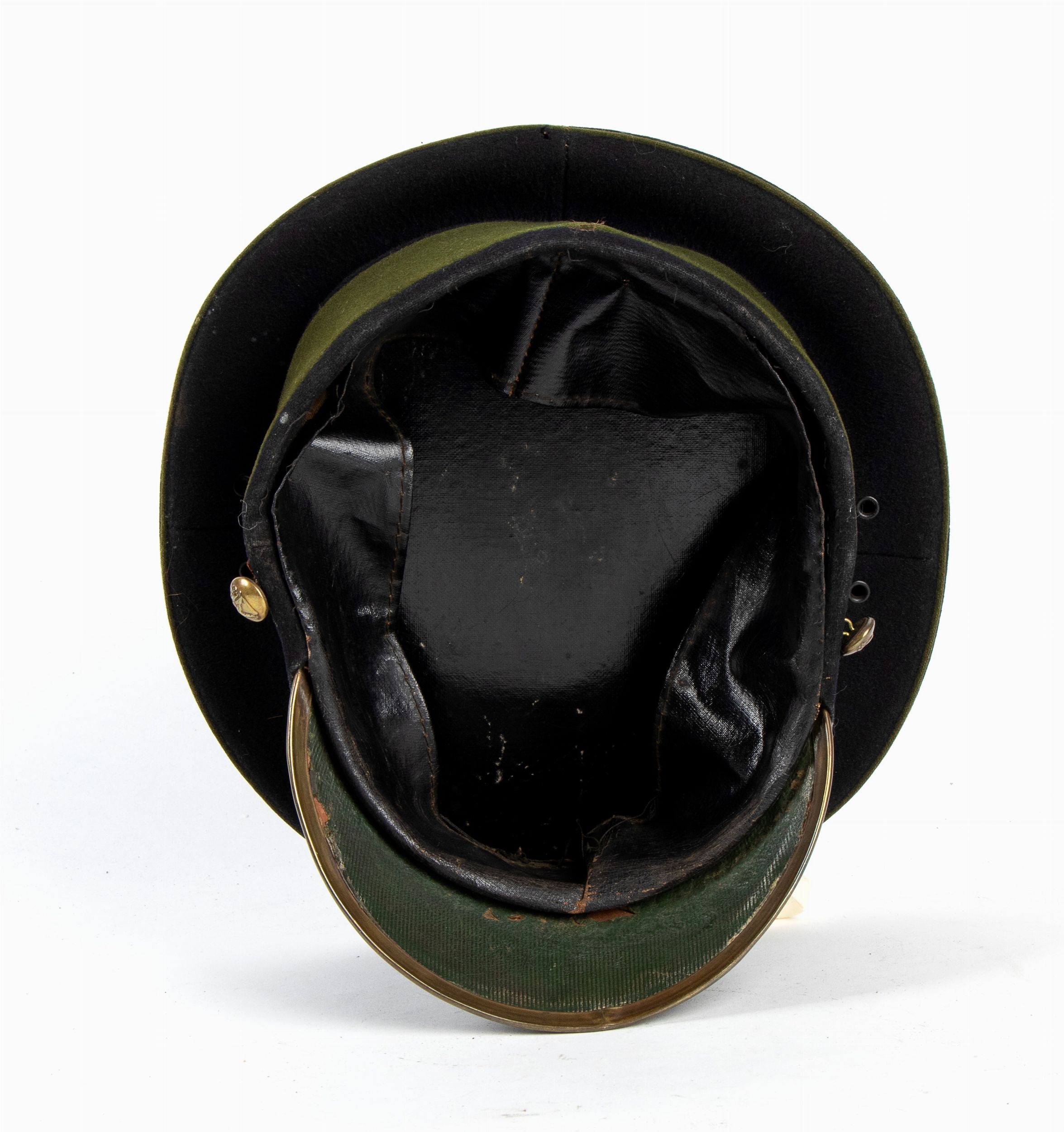 prima metà XX sec. Berretto a visiera dei Coldstream Guards, panno blu scuro filettato verde, tamburo verde e fregio specifico in metallo, interno di tela cerata verde con un solo timbro: (12). Manca il soggolo, altrimenti in ottimo stato.