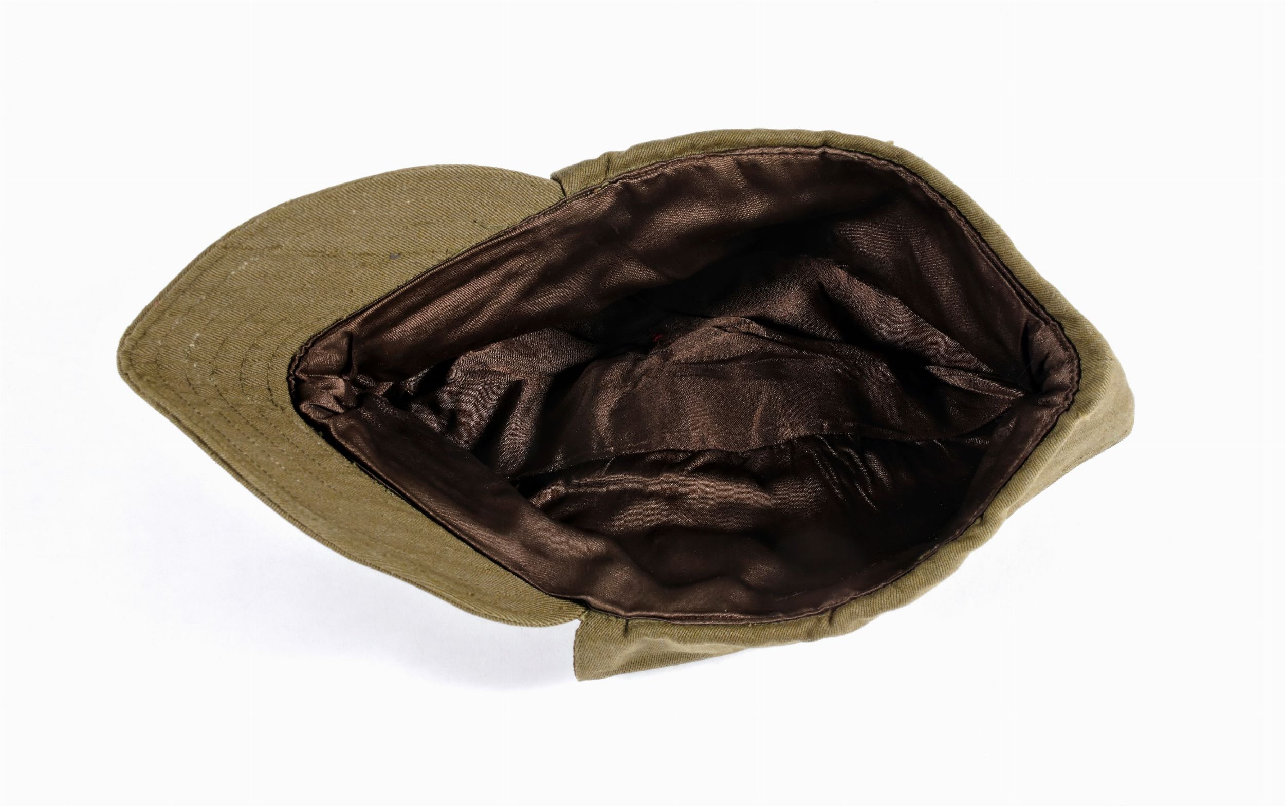 prima metà XX sec. In gabardin cachi, fregio ricamato di cotone nero su panno rosso, gallone laterale di nastro di cotone con stella gialla bordata rosso, interno di seta, in ottimo stato.