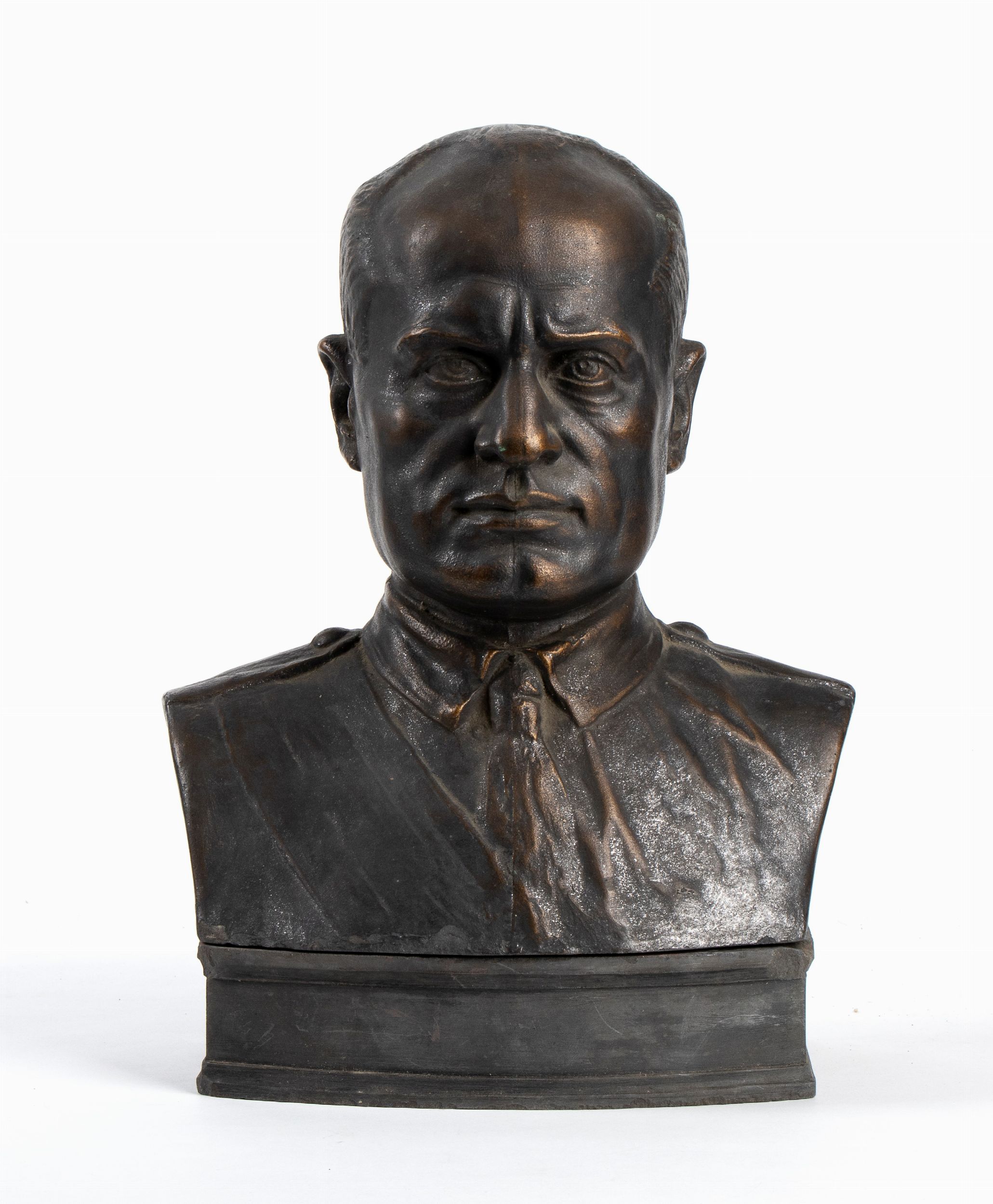 metà XX sec. Bel bustino in bronzo gettato di Benito Mussolini, con base, firmato alla spalla con firma illeggibile, in buono stato.