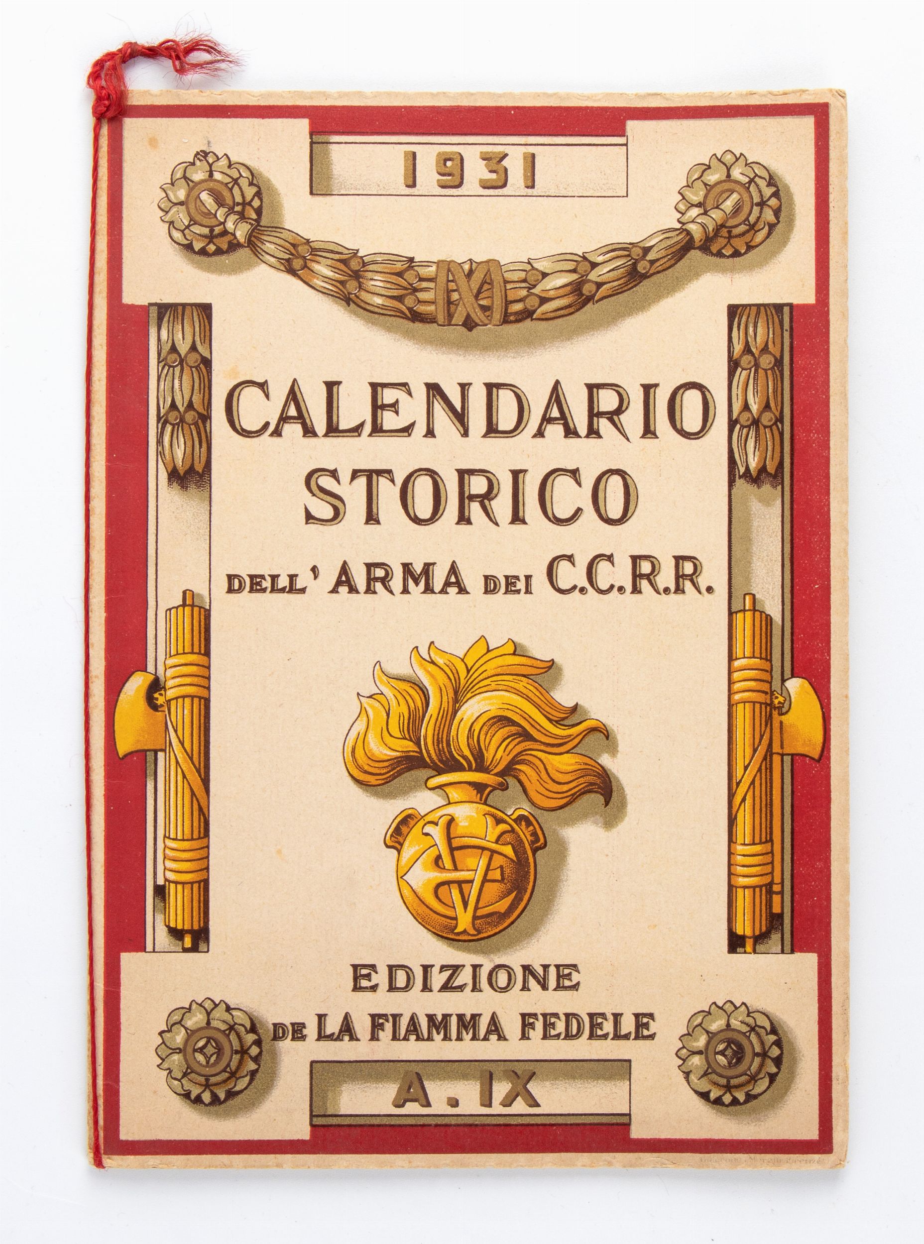 24x17 1931 Calendario storico dei Carabinieri Reali CC.RR. per l'anno 1931, dimensioni circa cm.24x17, con cordino lungo rosso originale. Rarissimo calendario, originale del 1931, EDIZIONE DE LA FIAMMA FEDELE , completo di tutte le pagine ed in perfette condizioni
