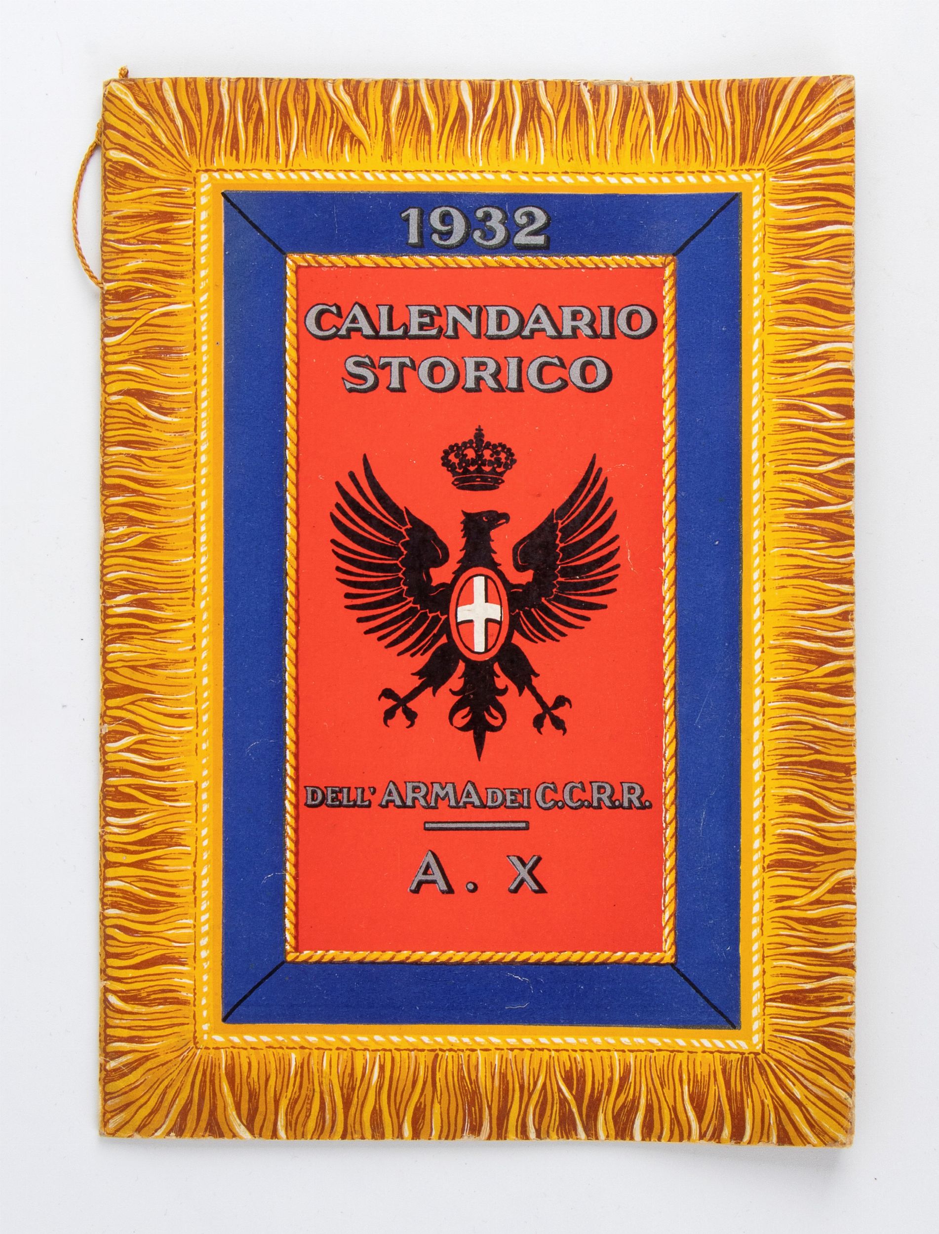 Calendario storico dei Carabinieri Reali CC.RR. per l'anno 1932, ANNO X era fascista, dimensioni circa cm 24x17, con cordino corto (prima edizione) giallo originale. Rarissimo calendario, originale del 1932, completo di tutte le pagine ed in perfette condizioni