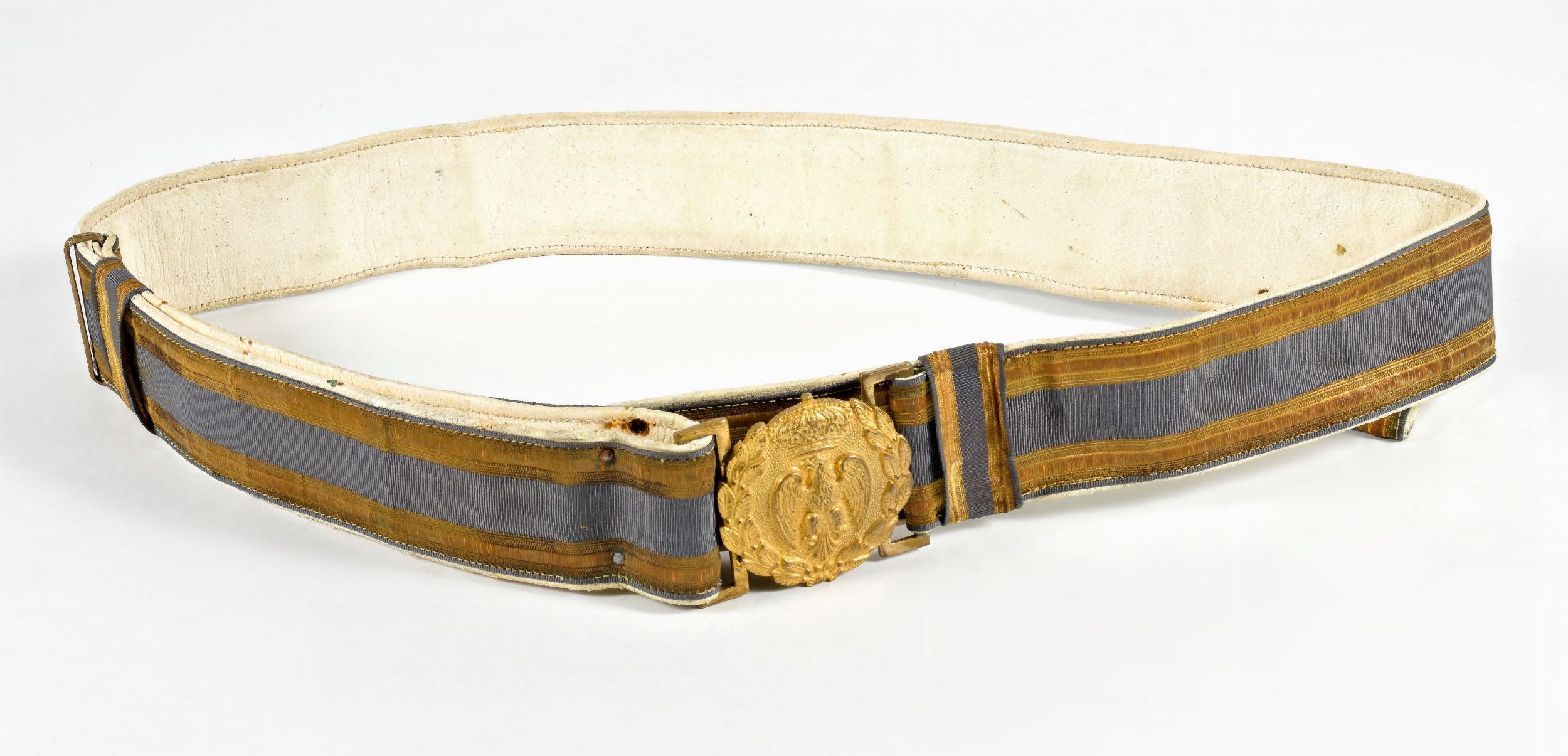 prima metà XX sec. Cinta per alta uniforme in broccato oro/grigio con fibbia dorata con impressa aquila coronata. In ottimo stato.