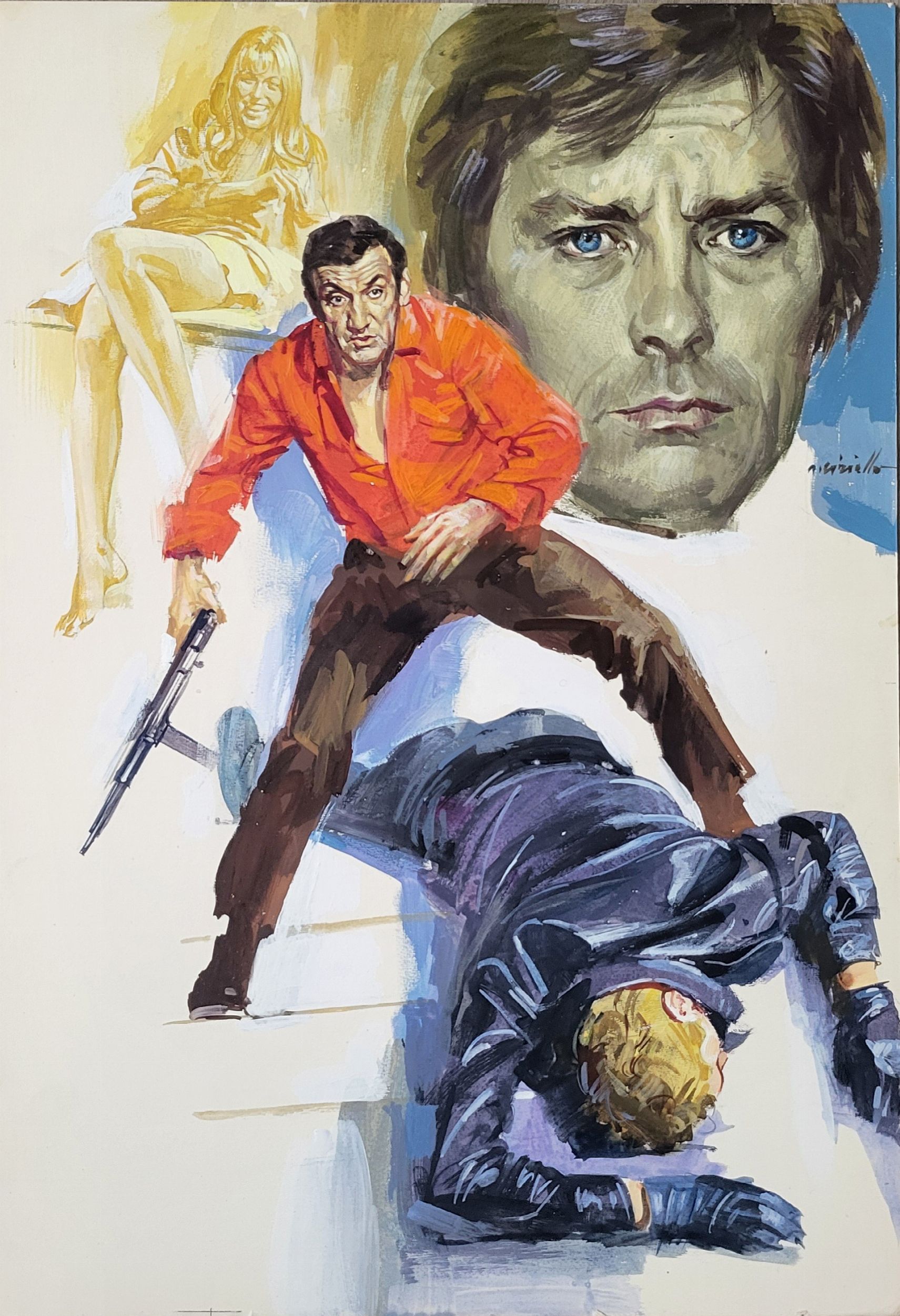 Bozzetto per manifesto del film 'I TRE AVVENTURIERI' (Les aventuriers), 1967, con Alain Delon, Lino Ventura, Joanna Shimkus, regia di Robert Enrico. Olio su cartoncino, firmato A.CIRIELLO Misura circa cm.35,3x51 In ottime condizioni