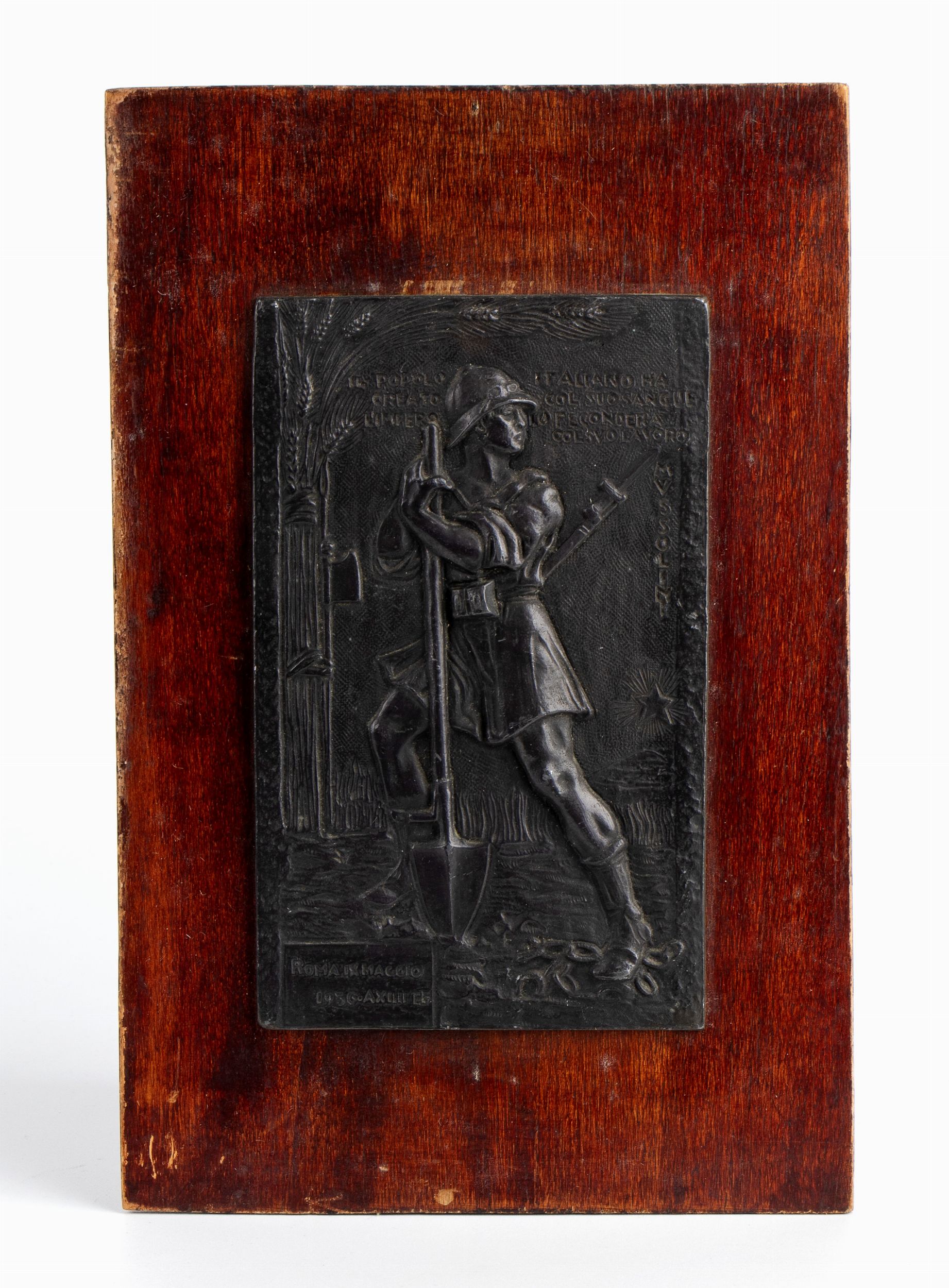 10,5x17 1936 Placca in zama, montata su supporto in legno, insieme coevo ed originale, che ritrae un soldato italiano camicia nera in uniforme coloniale, atto a lavorare la terra con una vanga, e circondato da spighe di grano e da un fascio littorio alla sua sinistra. La placca reca incisa la frase IL POPOLO ITALIANO HA CREATO COL SUO SANGUE L'IMPERO - LO FECONDERA' COL SUO LAVORO - MUSSOLINI - 9 MAGGIO 1936 Al retro del supporto in legno, troviamo la stampa ad inchiostro nero PER ORDINE SUPERIORE IL PRESENTE BASSORILIEVO E' FUSO CON METALLO AUTARCHICO ZAMA - VINCERE! In ottime condizioni. Misure circa cm.10,5x17 della sola placca