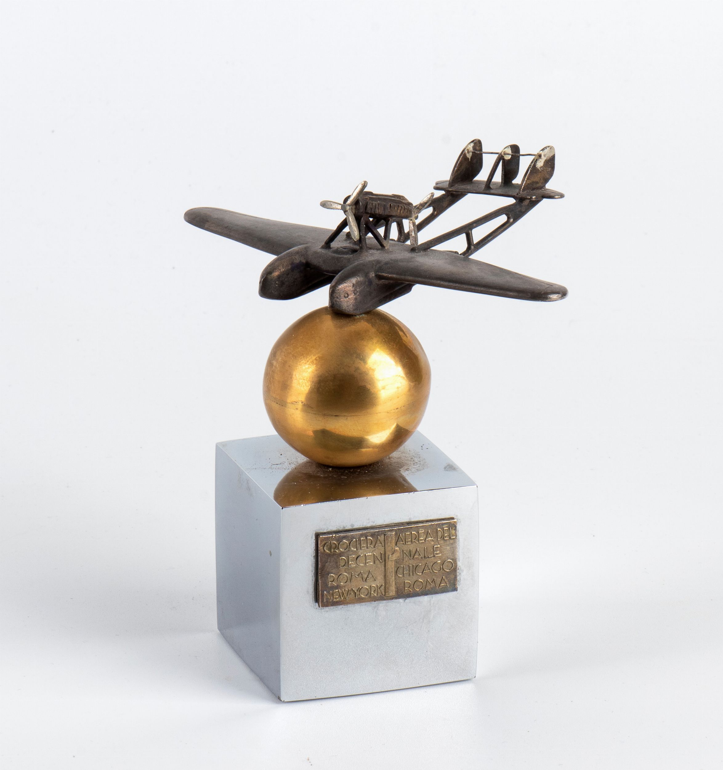 10x16 Gadget originale della Johnson per la crociera aerea del decennale. Aereo idrovolante Savoia Marchetti SM55x con eliche rotanti, su sfera dorata in lamiera scatolata, poggiante su cubo in metallo pesante, cromato, recante la targhetta CROCIERA AEREA DEL DECENNALE ROMA CHICAGO NEW YORK ROMA . In ottime condizioni, originale del 1933. Misura circa cm.10x16