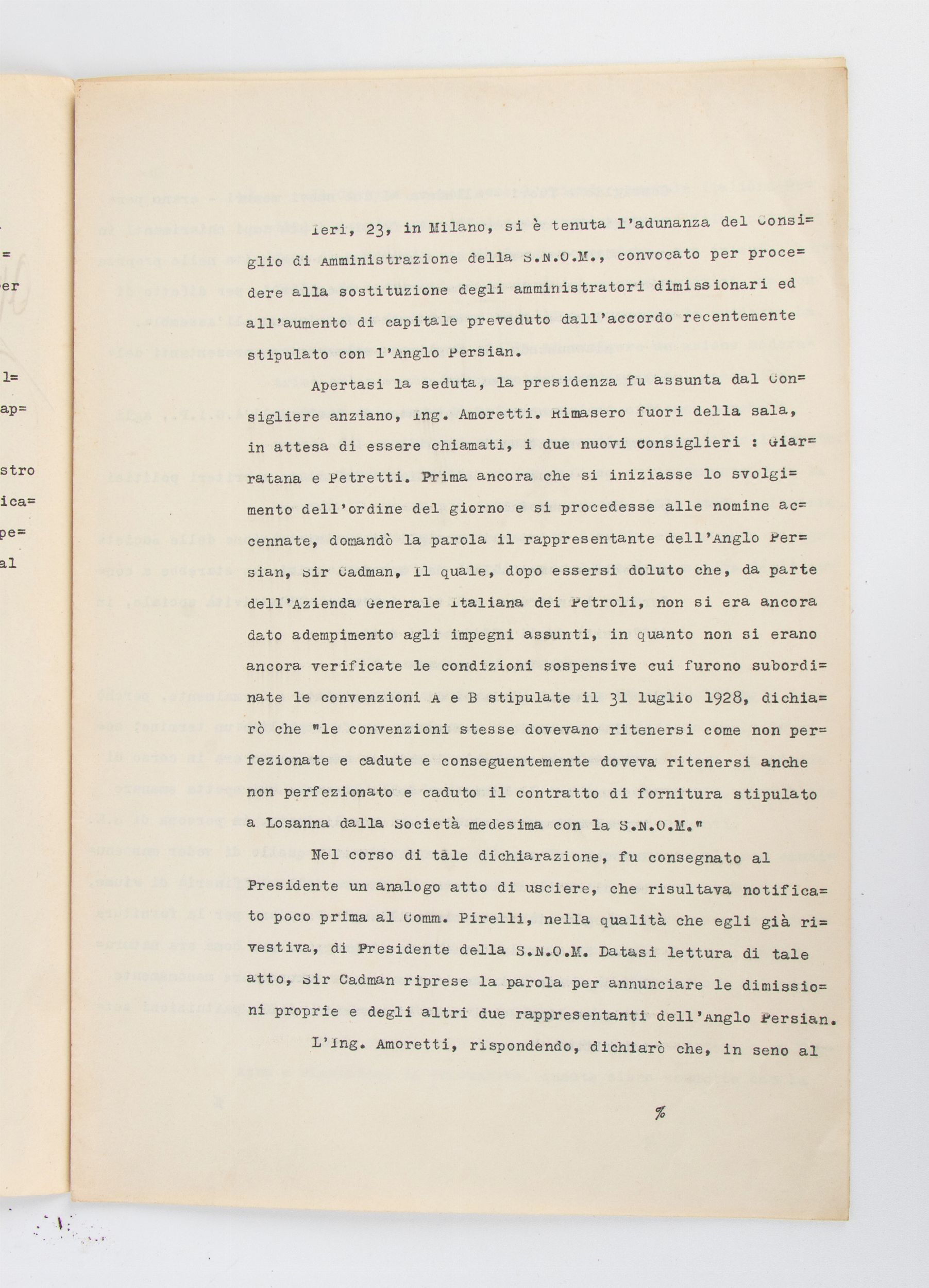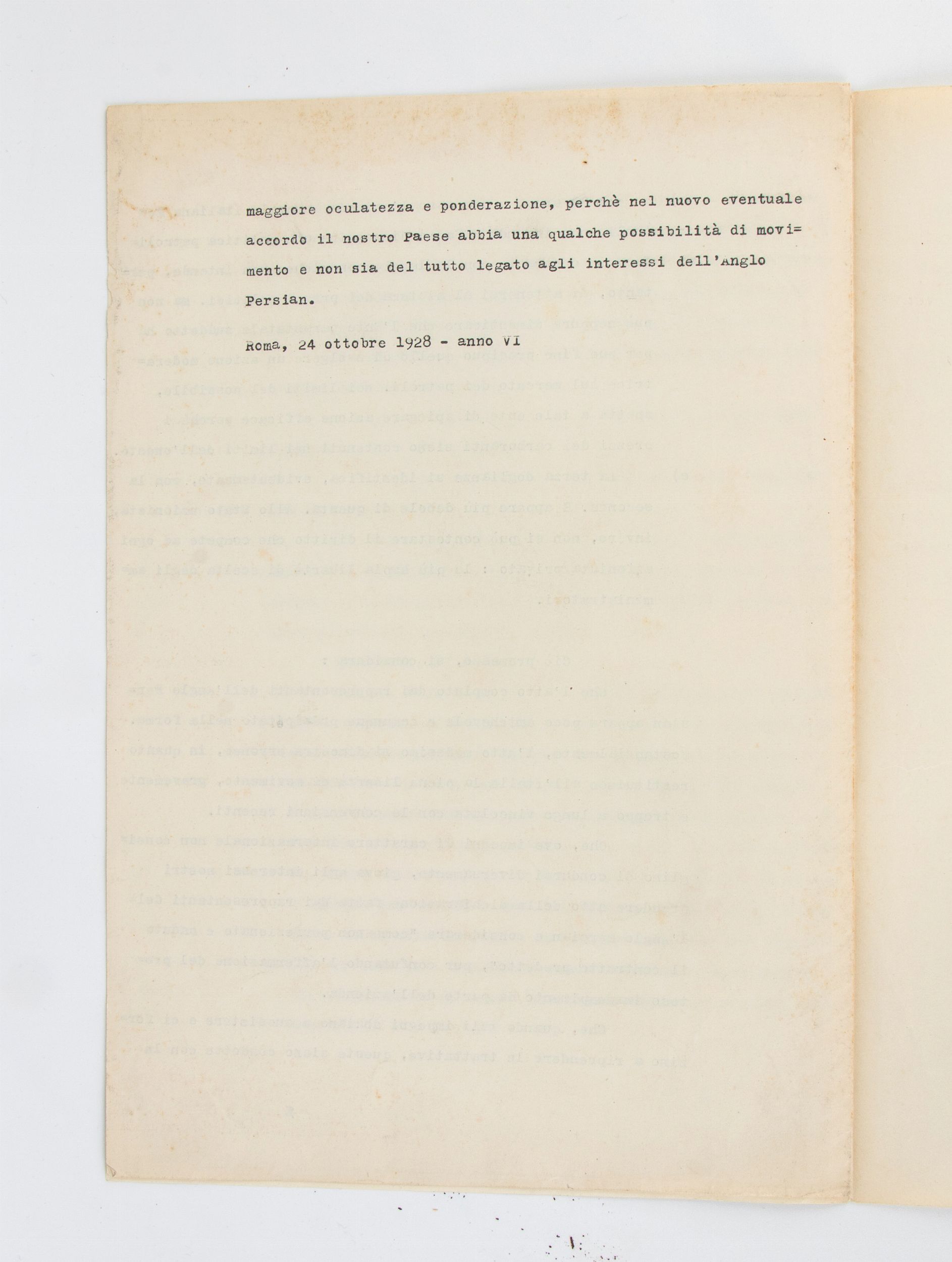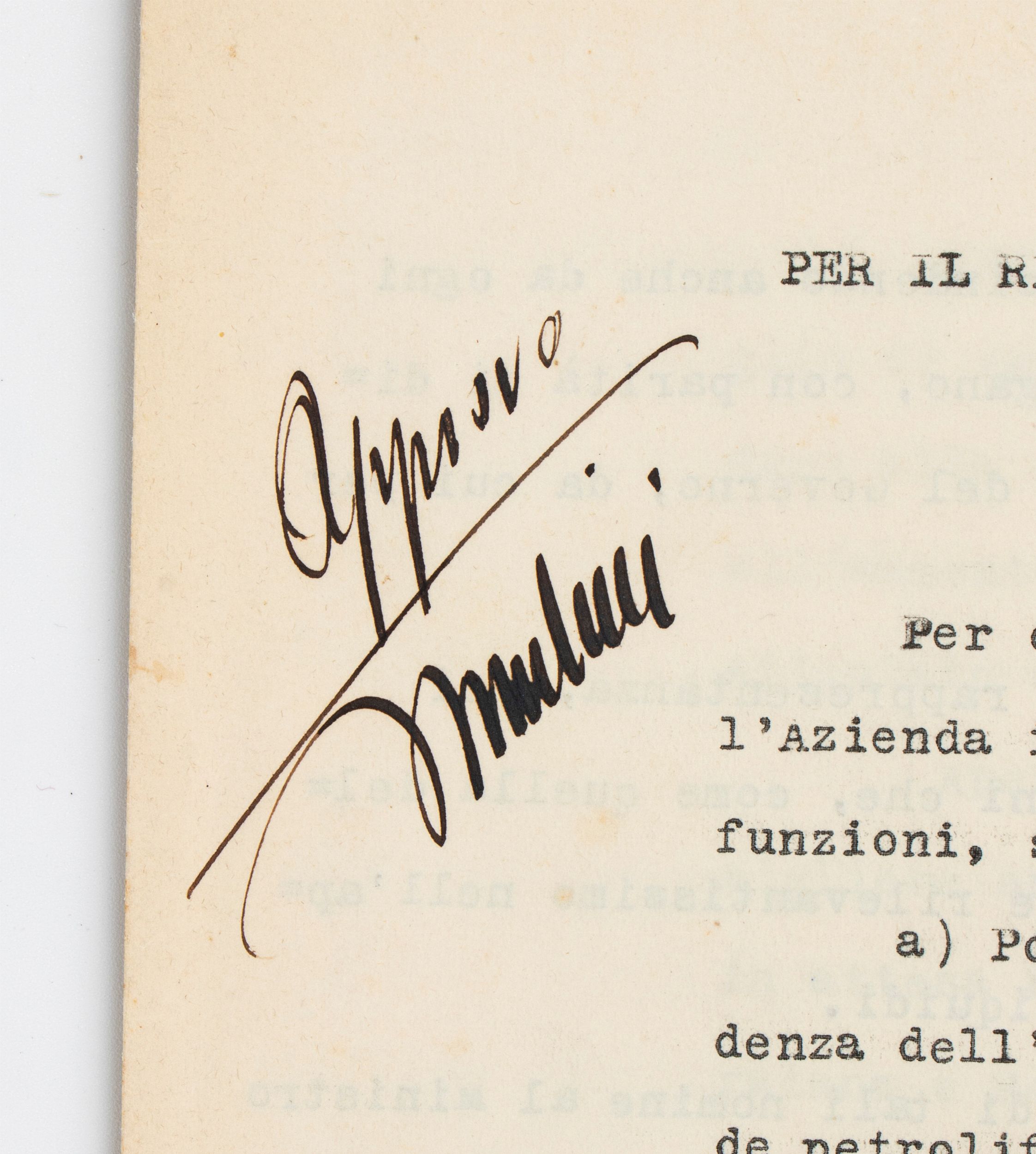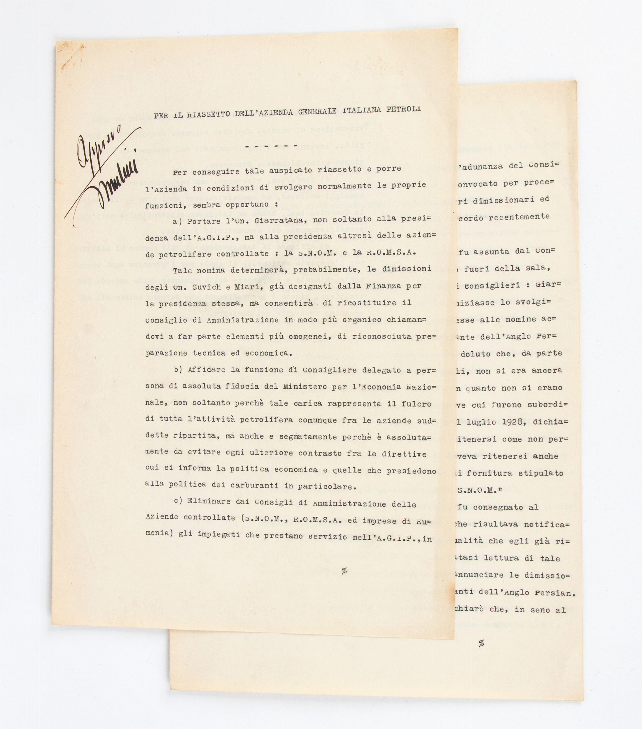 23x31 cm 1928 Documento dattiloscritto di 2 fogli (6 facciate) dal titolo PER IL RIASSETTO DELL'AZIENDA GENERALE ITALIANA PETROLI, con annotazione ad inchiostro nero, autografa APPROVO e firmato MUSSOLINI, in alto a sinistra alla prima pagina. Straordinario documento di programma per la riorganizzazione di quella che era la più importante azienda petrolifera italiana (che sarà poi AGIP), datato 24 OTTOBRE 1928- ANNO VI. Misure dei fogli circa cm.23x31, in ottime condizioni.
