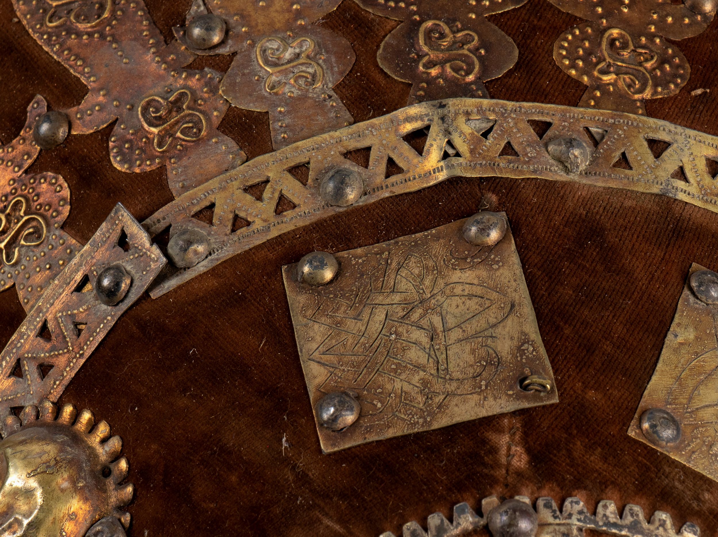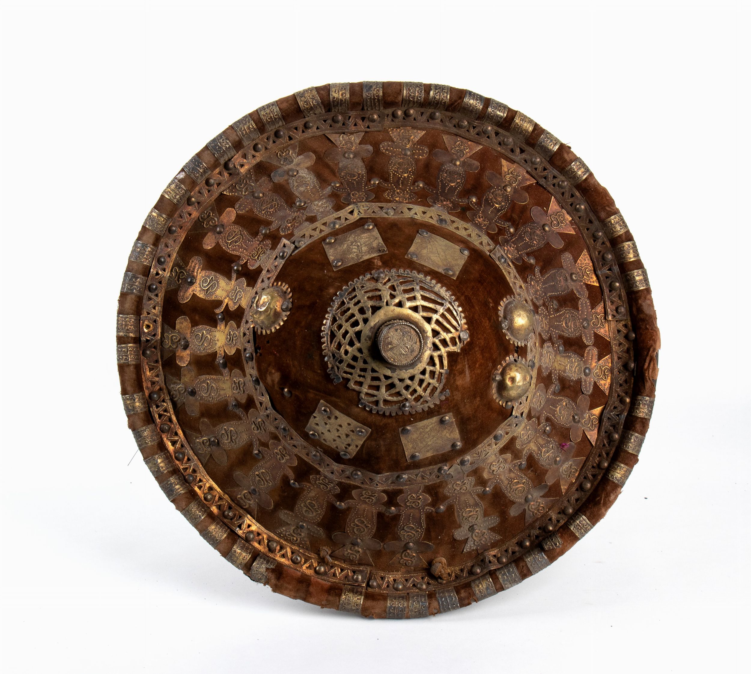 fine XIX sec. Etiopia, antico scudo da Ras in pelle ricoperta di velluto marrone e decorato di piastrine metalliche dorate, al verso è foderato in pelle rosso bruna, la forma e la fattura sono tipiche degli scudi di fine XIX secolo. In ottimo stato.