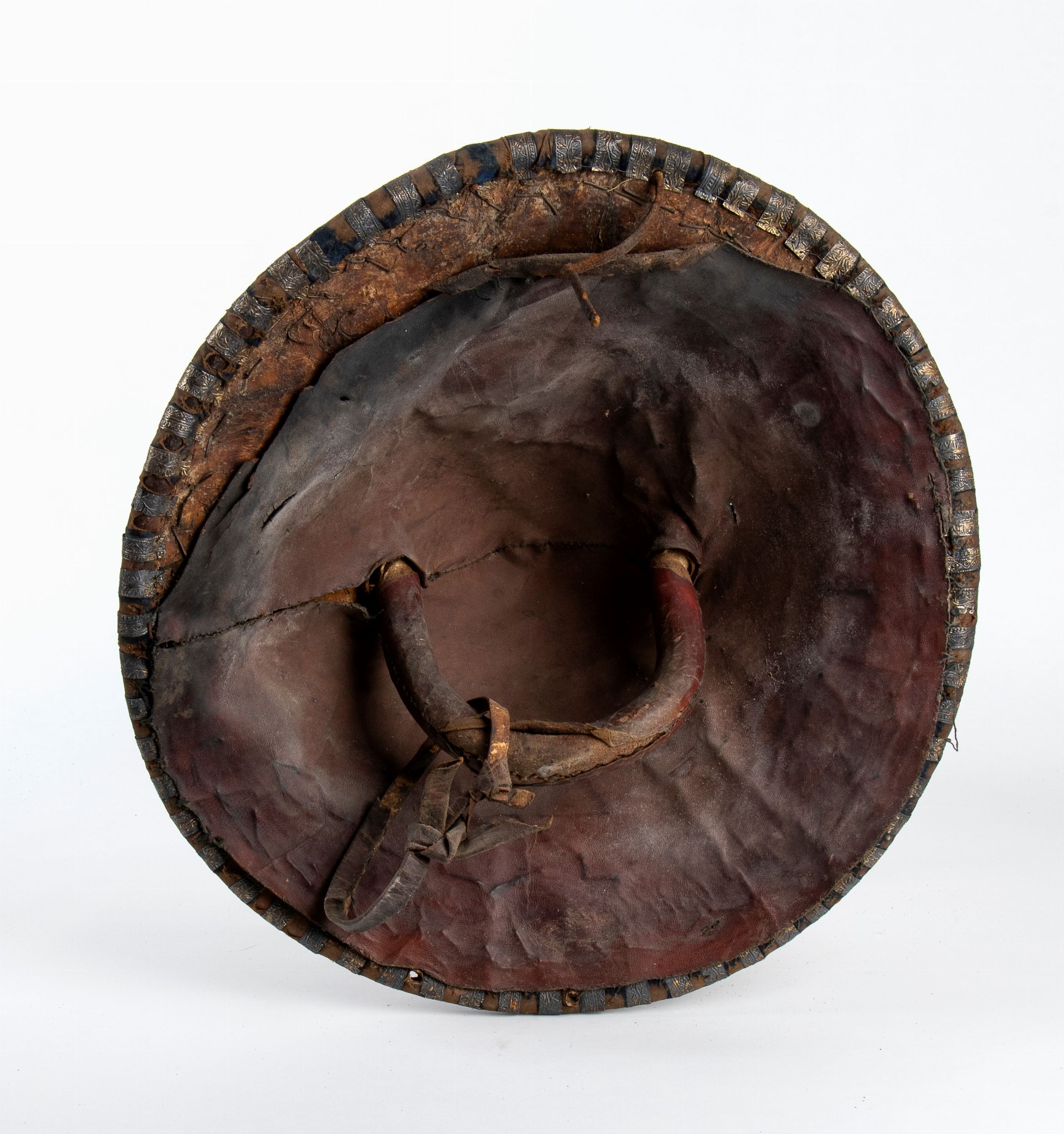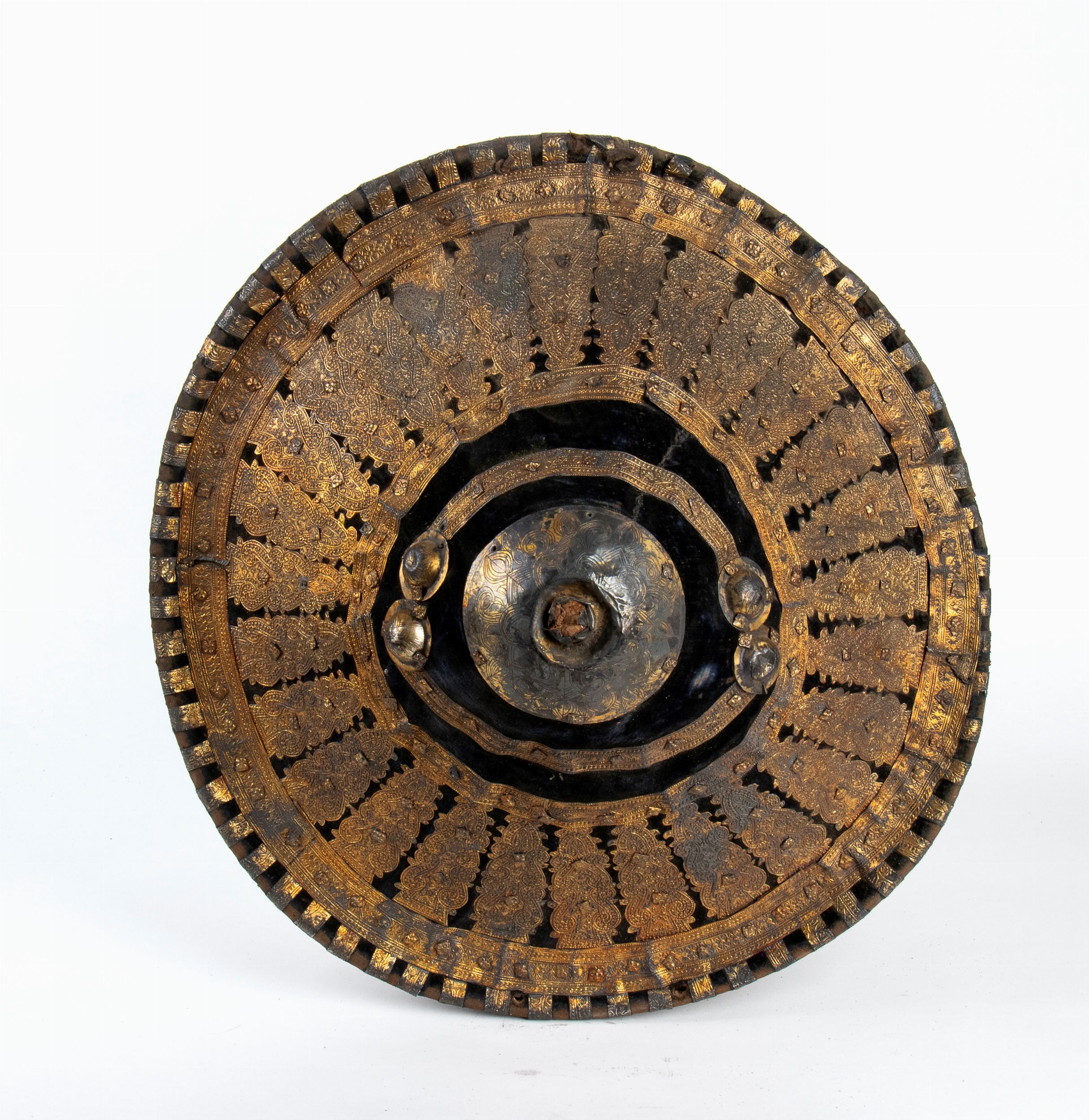 prima metà XX sec. Bellissimo scudo da ras, corpo in pelle foderato di velluto molto scuro, tendente al nero, decorato con applicazioni metalliche in metallo traforato e dorato. Molto bello; in ottimo stato.