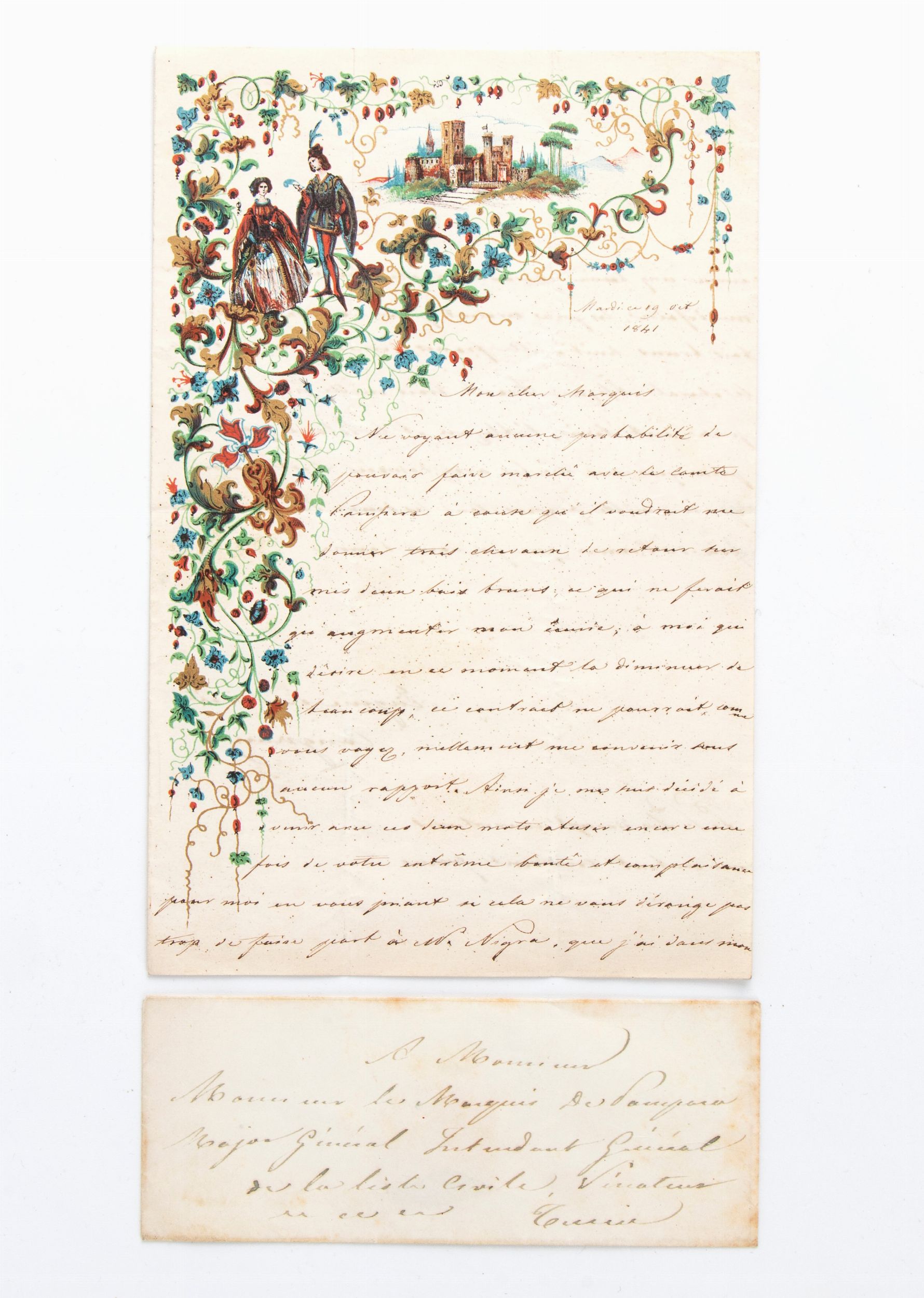 13,5x21 Lettera su due facciate , testo autografo con firma originale di Eugenio di Savoia Carignano, datata 19 Oct 1841, indirizzata al Marchese Maggior Luogotenente Generale della Civica, con busta. Sigillo in ceralacca rossa. Testo in francese. Ottime condizioni