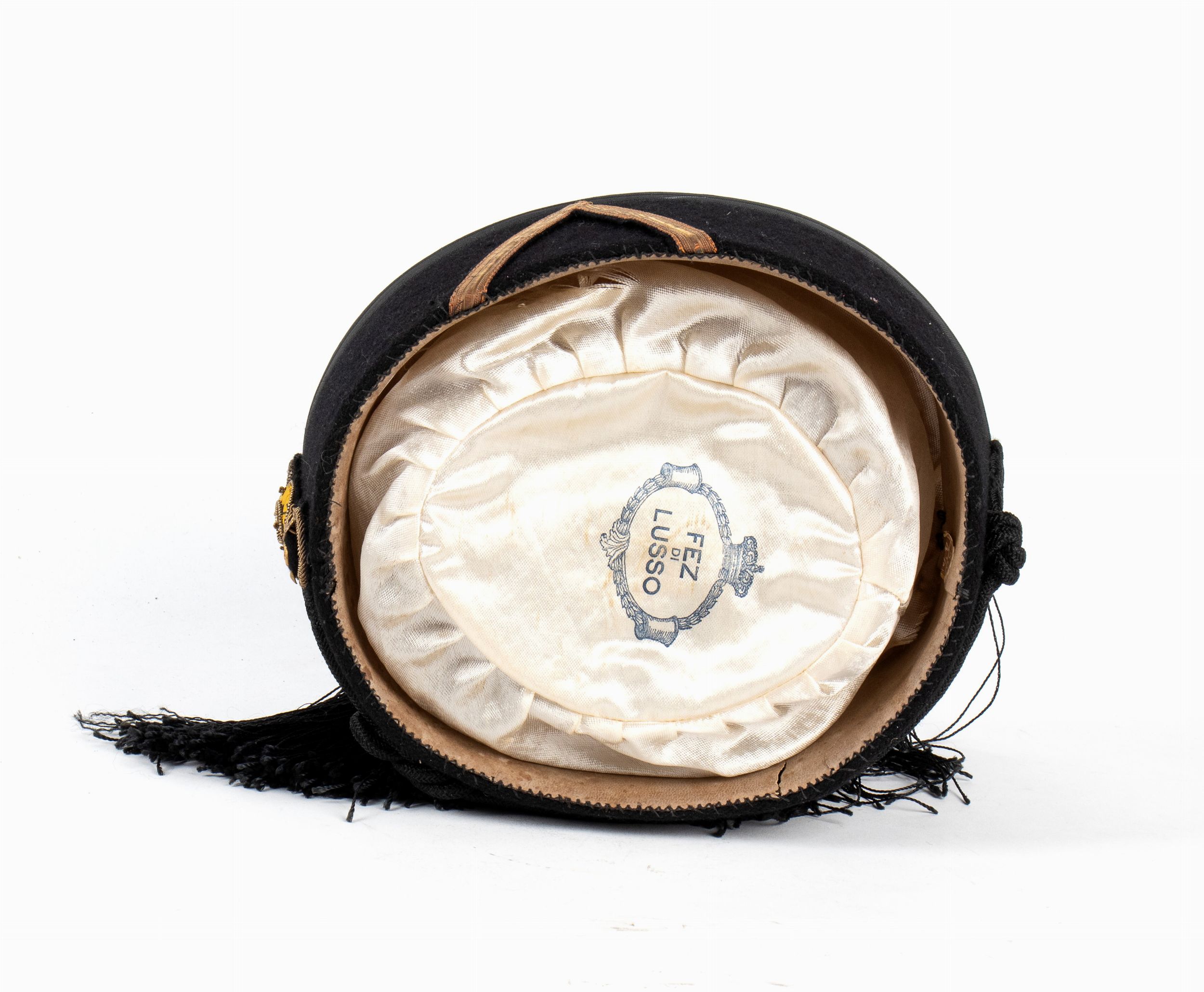 prima metà XX sec. Bel fez in feltro con fregio frontale di canottiglia dorata e grado laterale da sotto-capomanipolo, cordone nero e frangia, interno in seta col marchio del fabbricante e alluda in pelle. Ottimo stato.