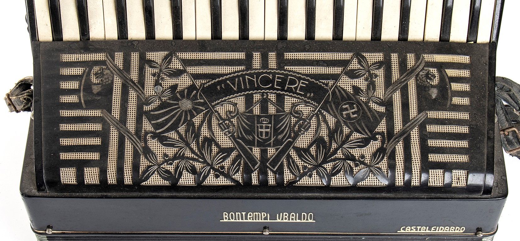 Decorata con insegne e simboli che si riferiscono all'alleanza italo-nippo-tedesca (l'Asse). Prodotta a Castelfidardo dalla ditta Bontempi. In ottimo stato, funzionante.